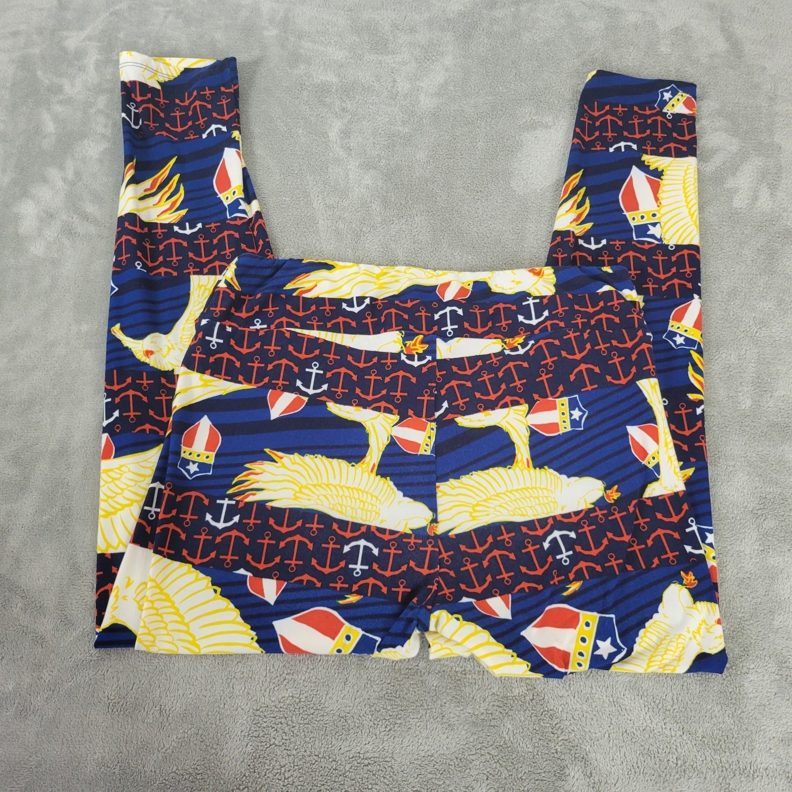 This product is a pair of LuLaRoe women's leggings in patriotic blue/red colors with an eagle/anchor design, perfect for celebrating the Fourth of July. The leggings are made from a polyester blend material, featuring a cropped style with an elastic waist for comfort and a stretch fit for added flexibility. With a tall size and a 28-inch waist, these leggings are ideal for various occasions including travel, activewear, and casual outings, making them a versatile and stylish addition to any wardrobe.