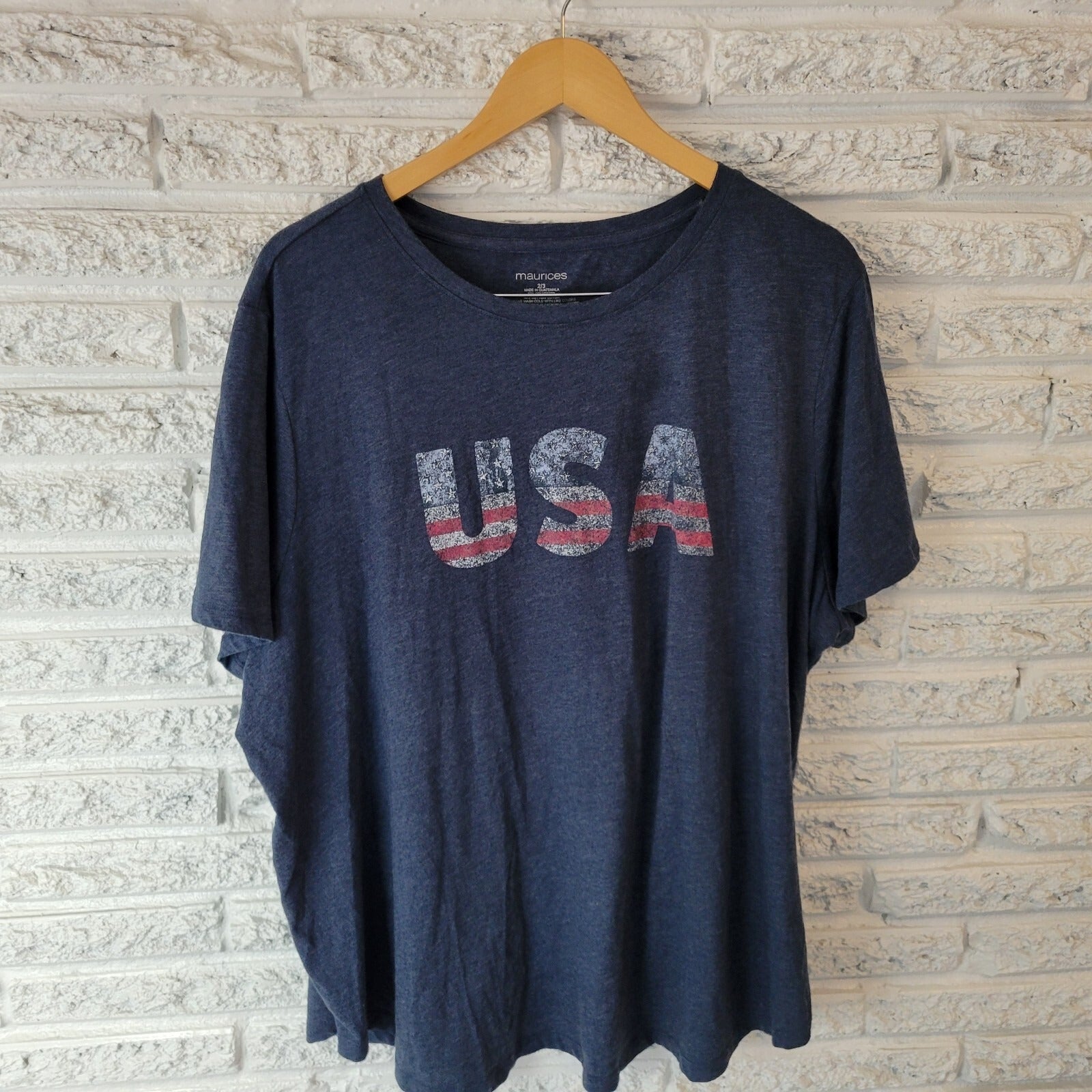 This Fourth of July Maurices Women's Top in size 2X/3X Plus is a patriotic USA-themed t-shirt in a stylish gray color. Made from a comfortable polyester blend jersey fabric, this regular fit shirt features short sleeves, a crew neck, and a pullover closure. With a casual sleeve type and basic style, this machine washable tee is perfect for casual or travel occasions, and can be worn in any season. Show off your American pride in style with this versatile and classic top from Maurices.