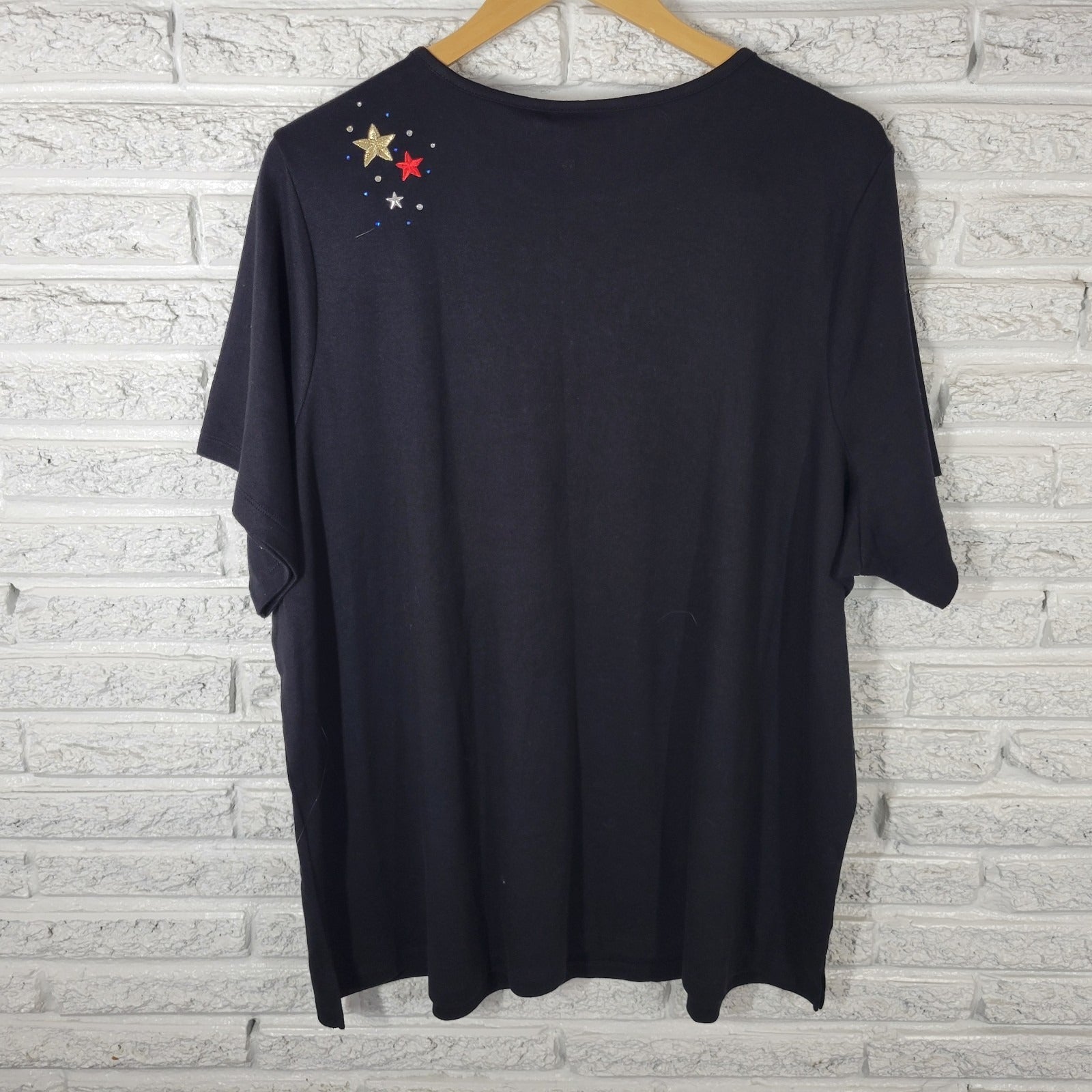 Fourth of July Quacker Factory QVC Womens Top 3X Plus Tee Black Studs Rhinestone