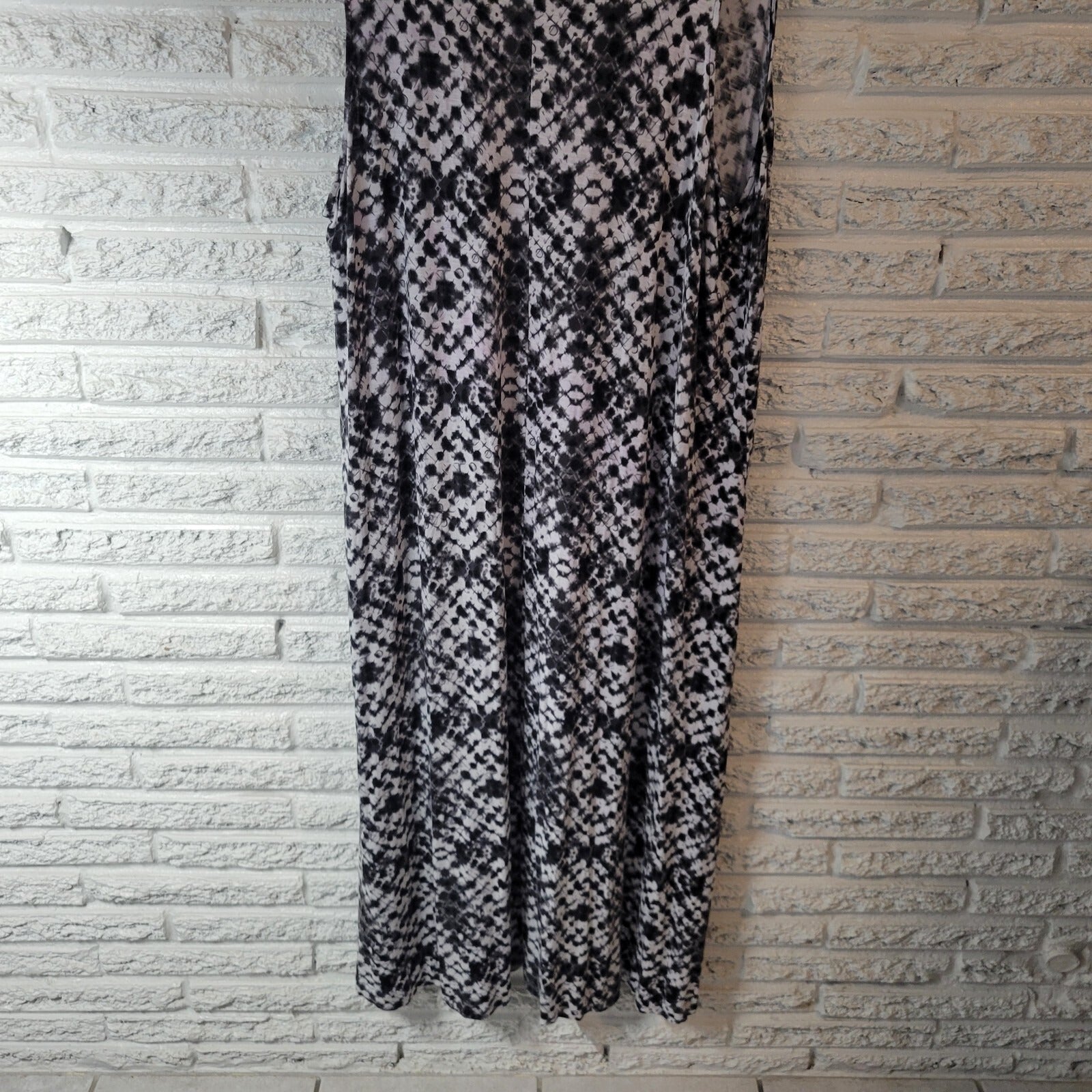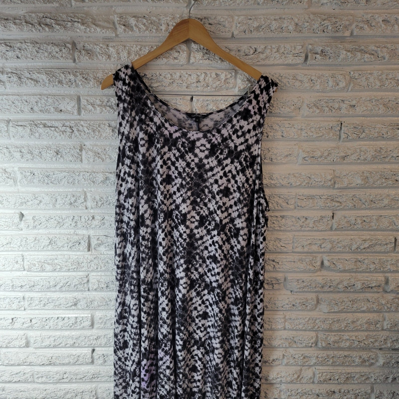 The George Women's Dress in size 4X is a casual and comfortable option for everyday wear. The black and white tie-dye pattern adds a fun and stylish touch to this sleeveless tank dress with a round neckline and pullover closure. Made from a blend of spandex and rayon, this knee-length dress is machine washable and features a stretchy material for added comfort. Perfect for travel or any casual occasion, this dress can be worn in any season and is a versatile addition to any woman's wardrobe.