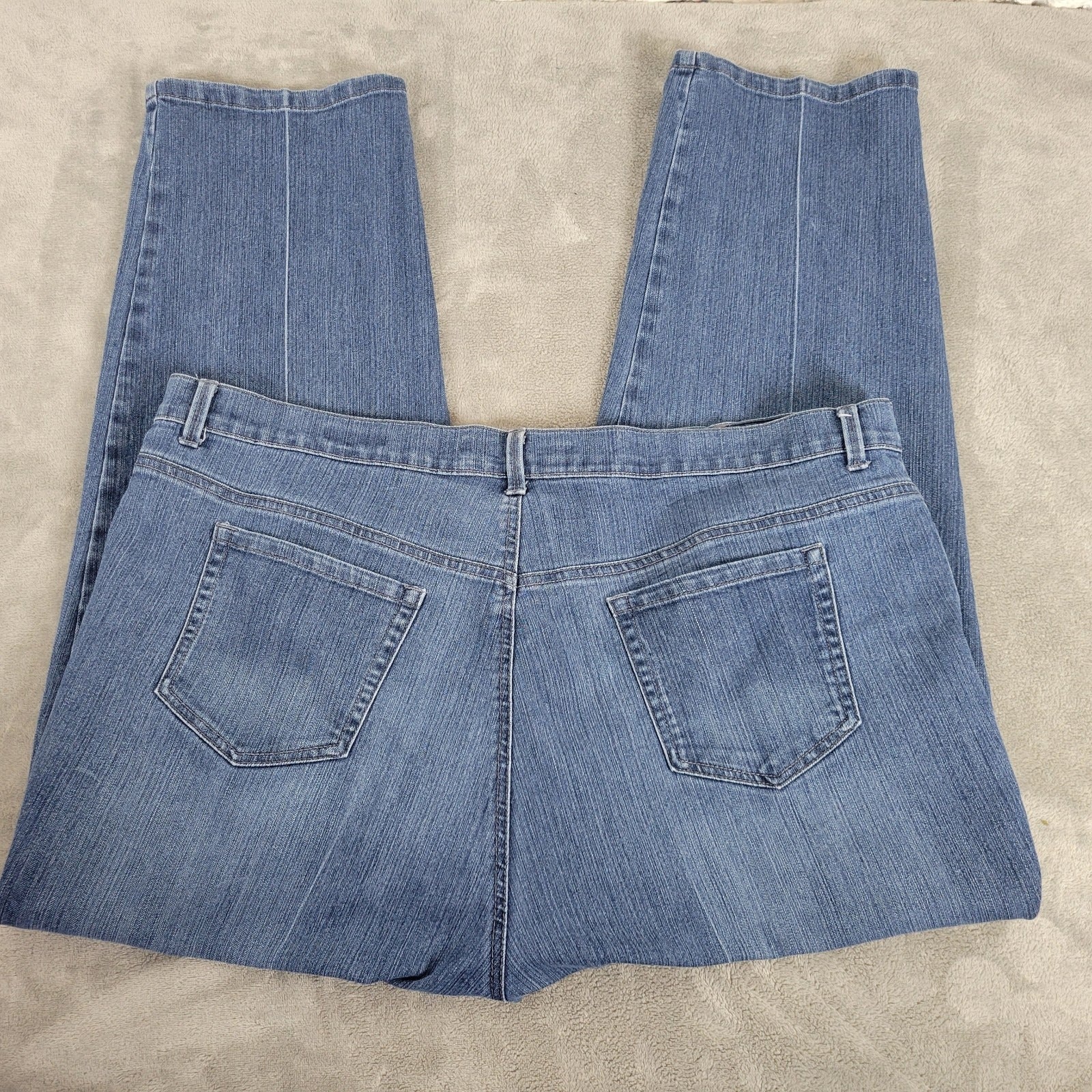 The Gloria Vanderbilt Amanda Women's Jeans in size 22W are a comfortable and stylish choice for plus-size women. Made from a cotton blend denim fabric with a medium wash, these straight-leg jeans feature a classic 5-pocket design and a zip fly closure. The stretch material ensures a comfortable fit, while the solid blue color makes them versatile for any season. With a 28.5-inch inseam and a waist size of 42 inches, these Gloria Vanderbilt jeans are a popular choice for women looking for a regular fit and quality construction.