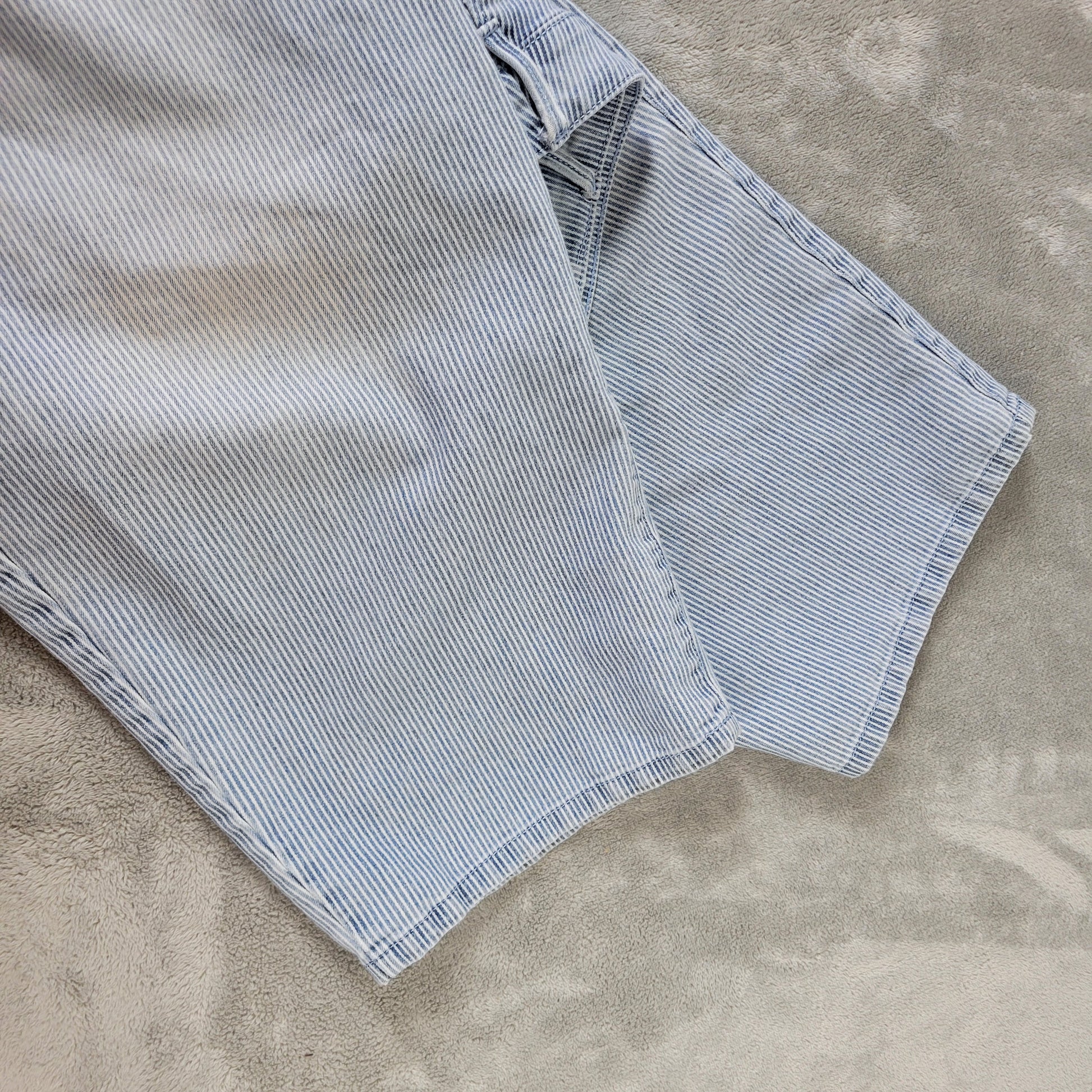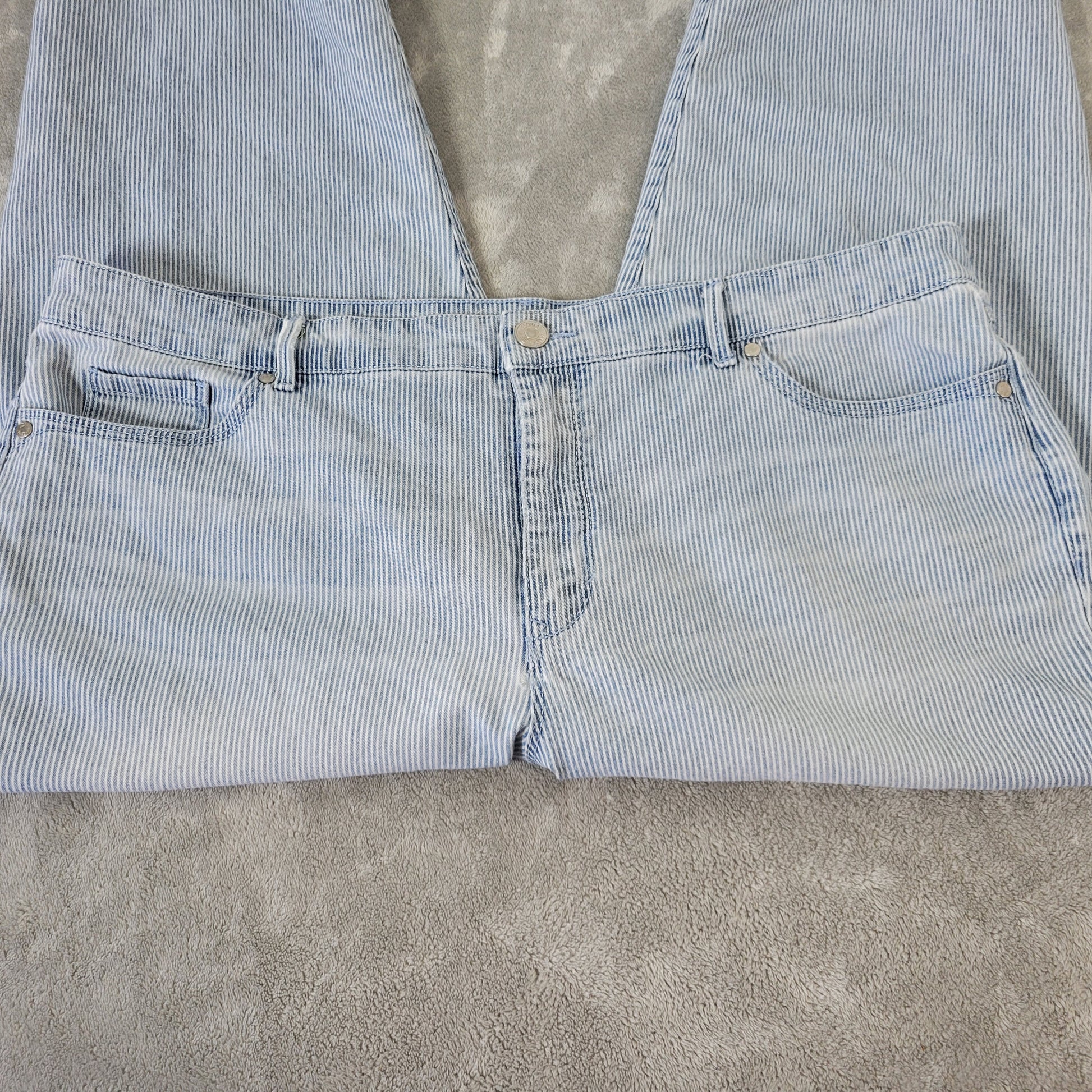 These Gloria Vanderbilt Women's jeans in size 18 Capri are perfect for the fashion-forward woman looking for a stylish and slimming option. The blue/white striped pattern adds a touch of sophistication, while the cotton blend material offers comfort and lightweight feel. With a straight leg style and an inseam of 20.5 inches, these pants are ideal for all seasons and occasions, whether it's for travel or casual wear. The elastic waist and stretch fabric ensure a perfect fit, while the side pockets add functionality to this versatile piece of clothing. Machine washable for easy care, these pants are a must-have for any woman's wardrobe.