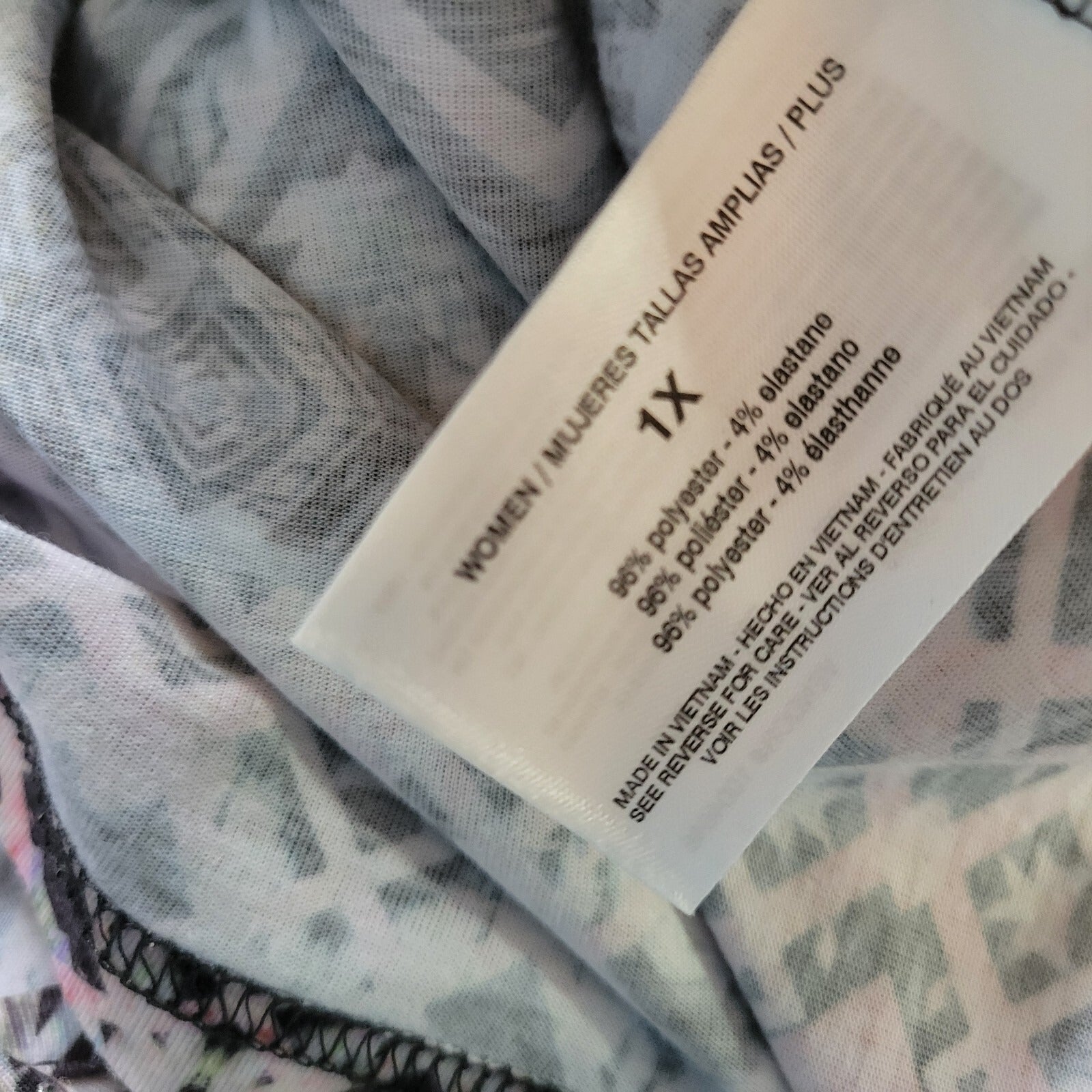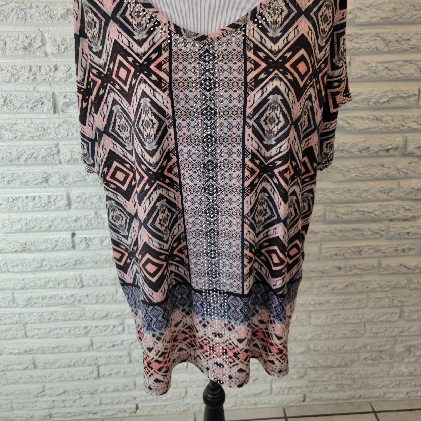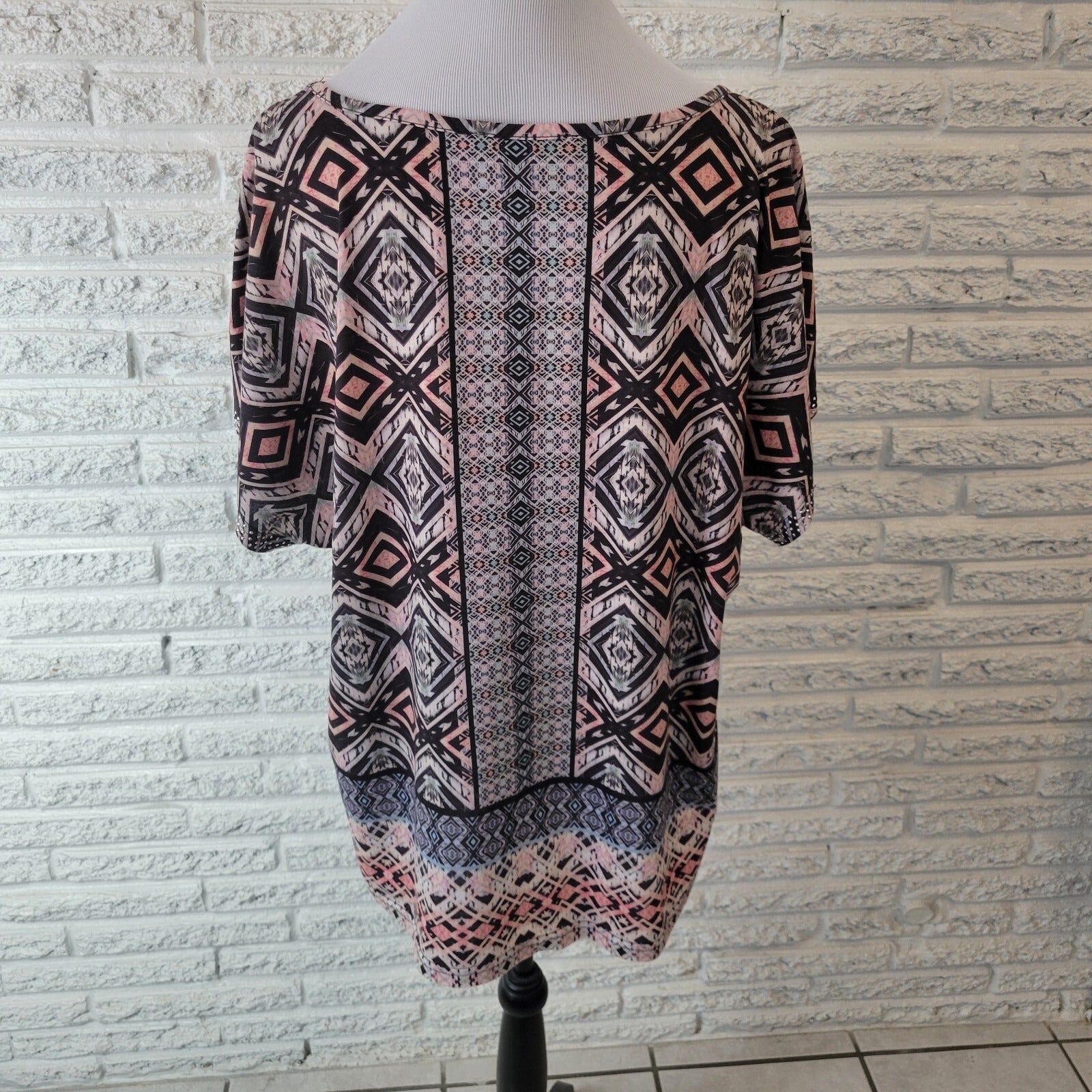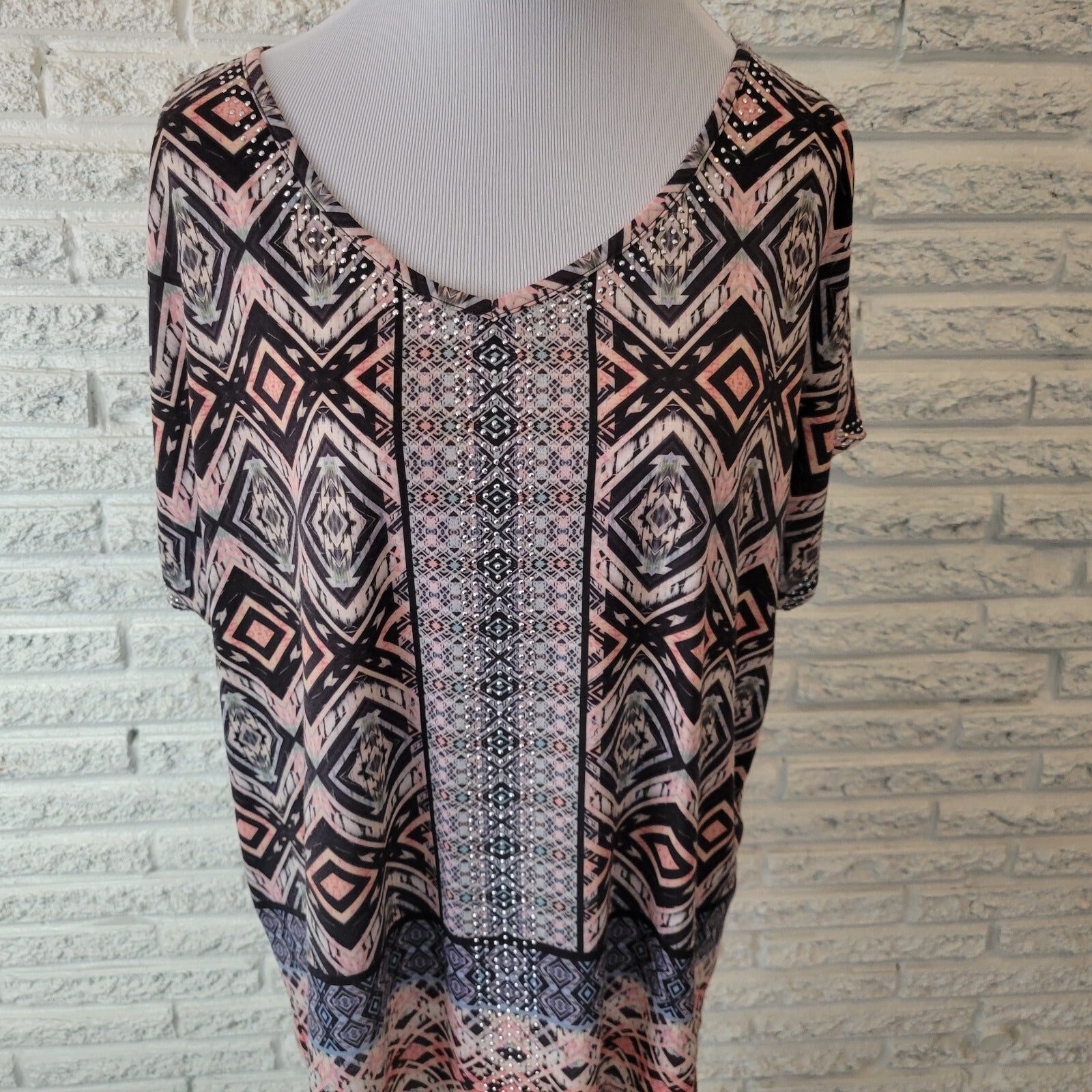 Gloria Vanderbilt Womens Top 1X Plus Tee Cap Sleeve Pink Black Geometric Studded