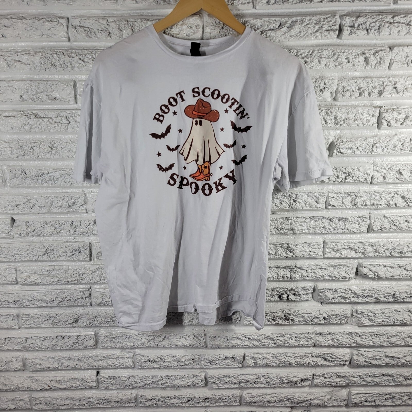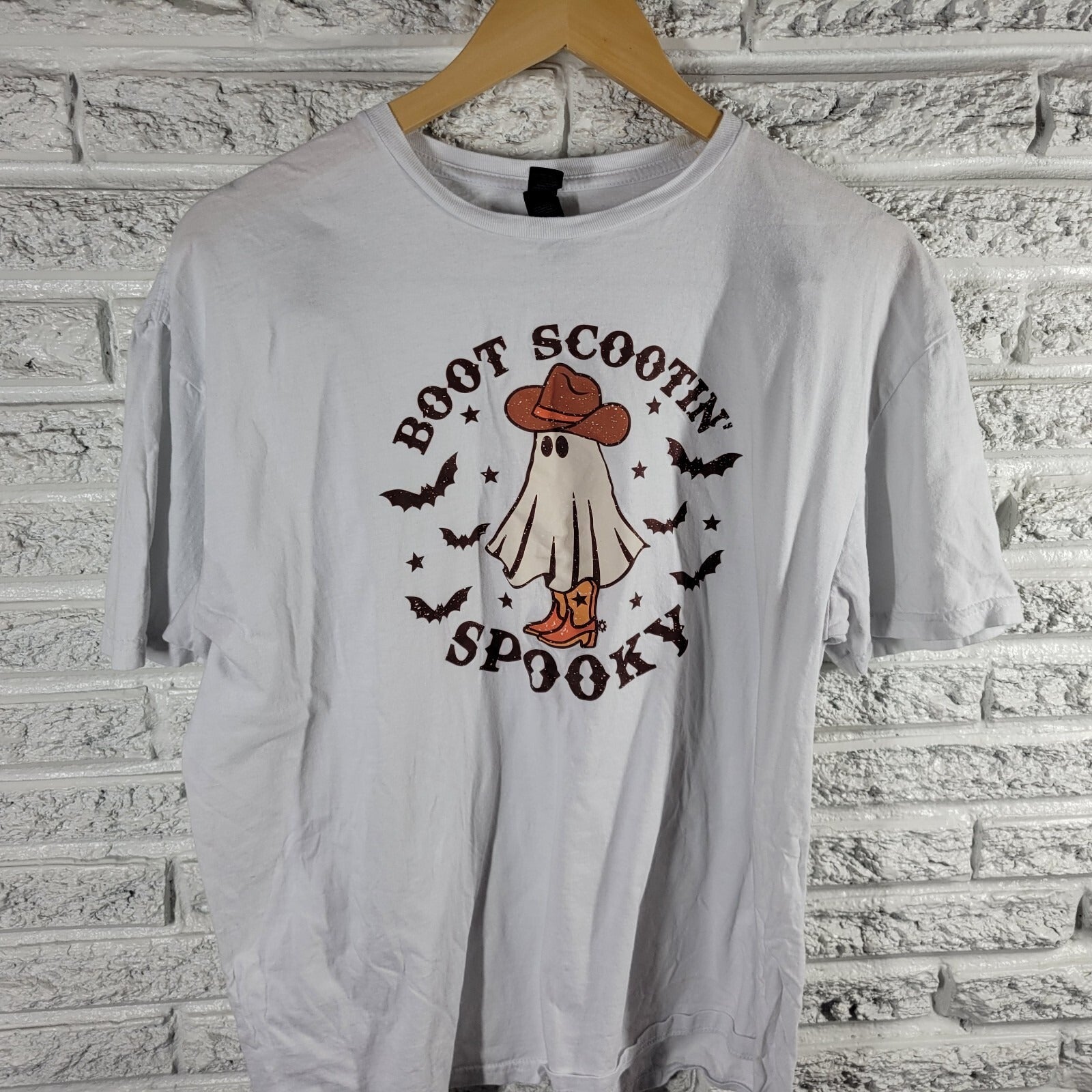 Embrace the spooky season with the Halloween-themed Gildan women's top in a comfortable XL size. This white/brown, short-sleeve tee features a classic crew neck and is made from soft, breathable 100% cotton jersey fabric, ensuring a relaxed fit perfect for any casual occasion or travel adventure. Its versatile design makes it an ideal choice for layering or as a standalone piece during warmer months.  This basic tee is no-fuss with a straightforward pullover closure, and the stretch material allows for freedom of movement throughout the day. Machine washable for easy care, the shirt is a practical addition to your wardrobe with its durable construction and simple maintenance. Celebrate the Halloween spirit year-round with this playful, yet tasteful spooky boot graphic that adds a touch of fun to your everyday look.