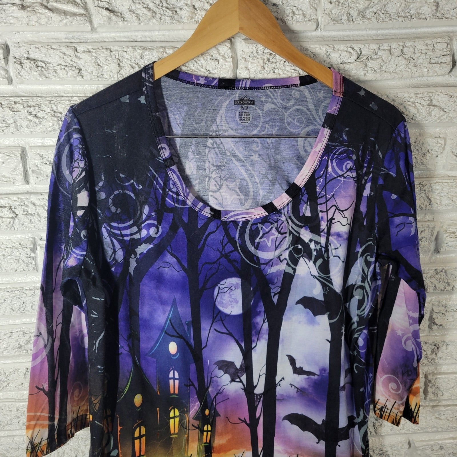 Halloween Womens Top XL 16 18 Tee 3/4 Sleeve Purple Haunted House Spooky Night