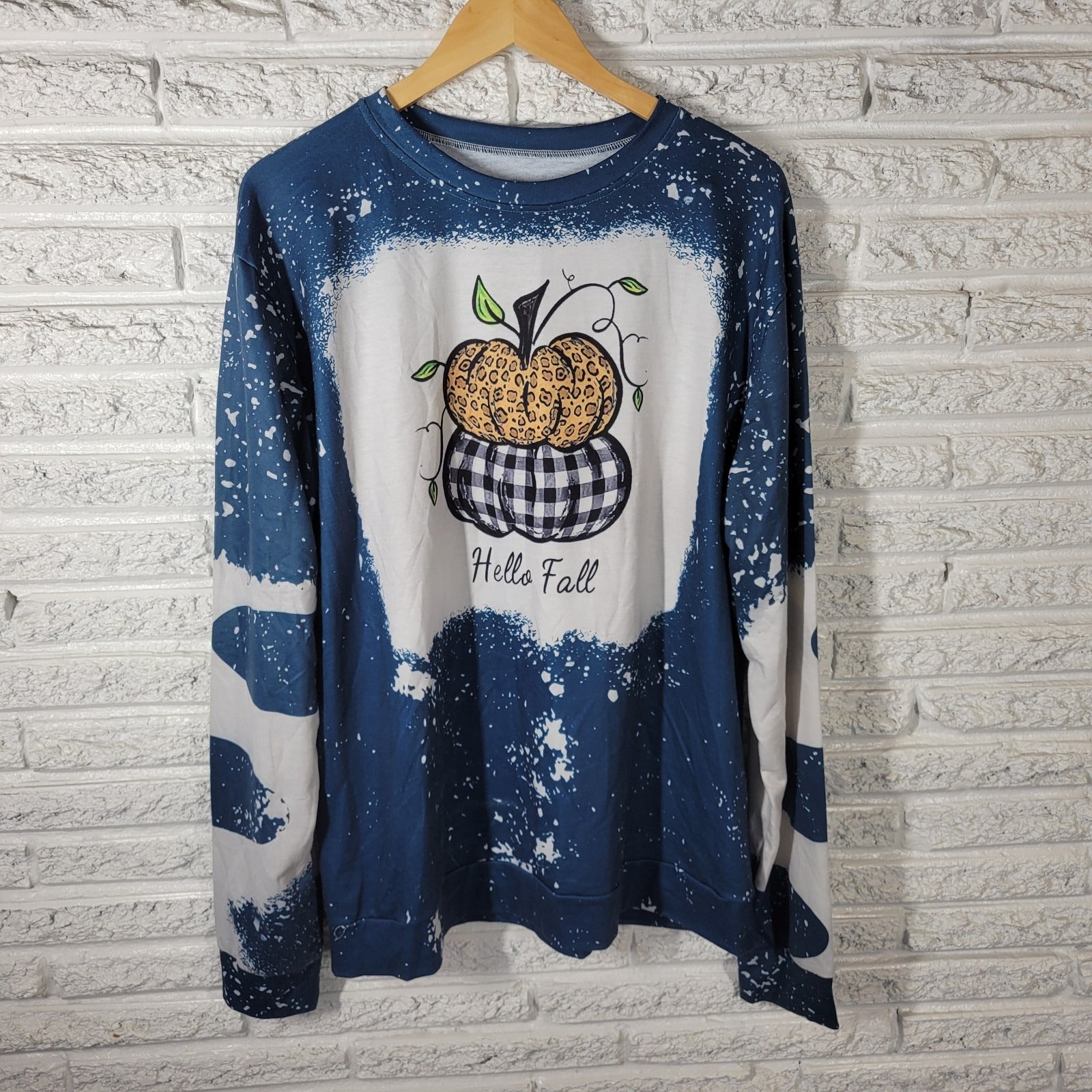 Hello Fall Autumn Womens Top 2XL Plus Blue Long Sleeve Poly Blend Pumpkin Casual