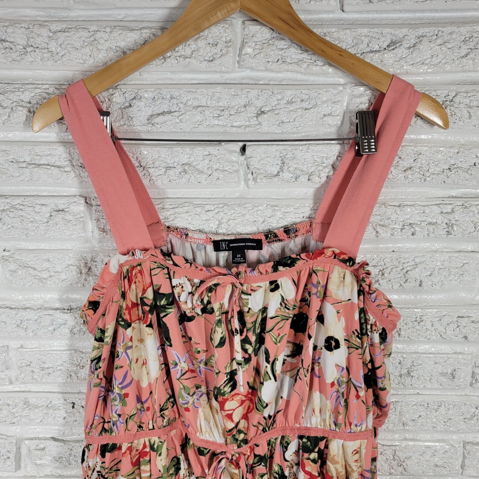 The product is a stylish and comfortable pink floral swing top from INC International Concepts in size 2X Plus. This sleeveless tank top features a square neckline and ruffle accents, making it perfect for casual or travel occasions. Made from a cotton blend material, this top is machine washable for easy care. With features like an elastic waist and stretch, it is suitable for all seasons and has a regular fit for a flattering silhouette.