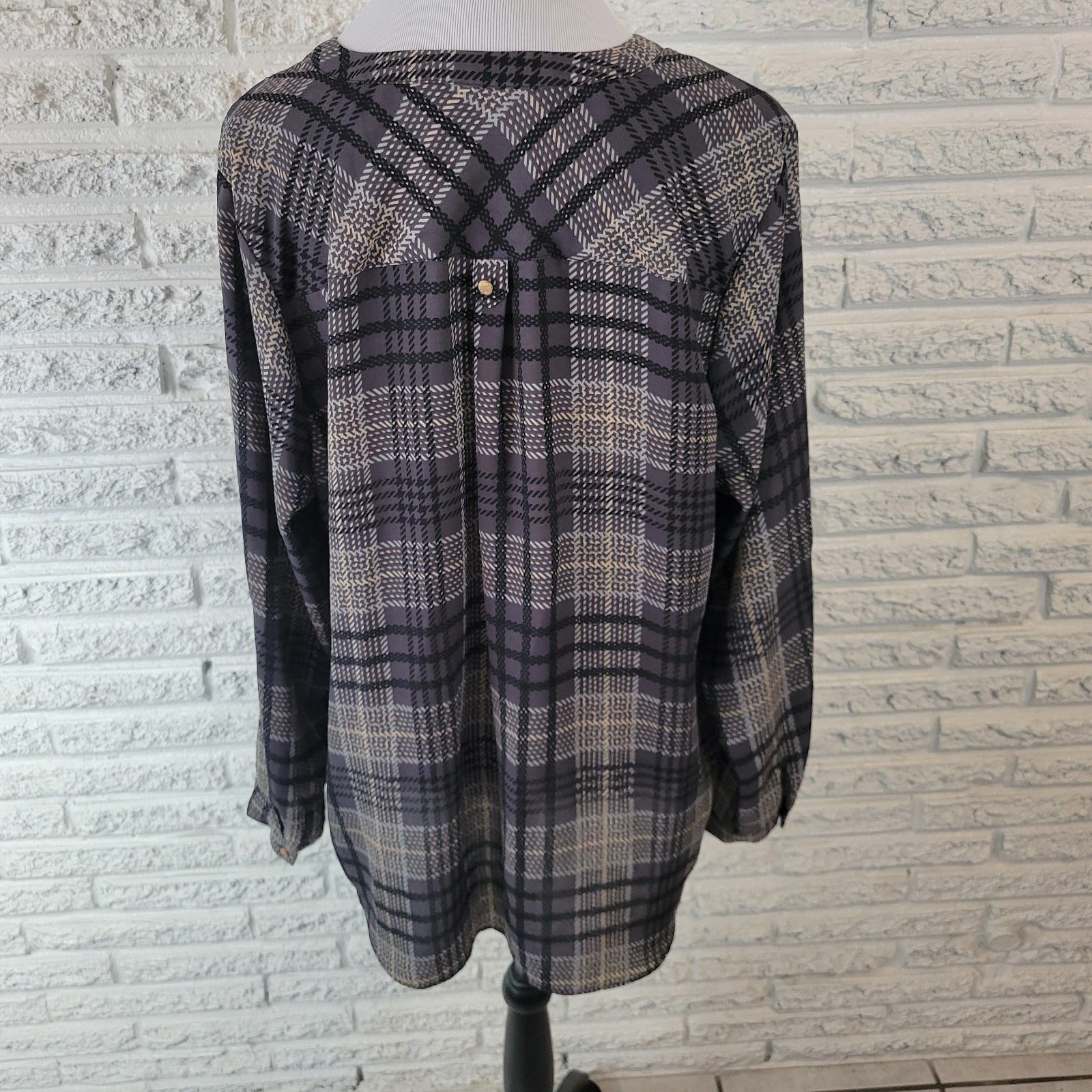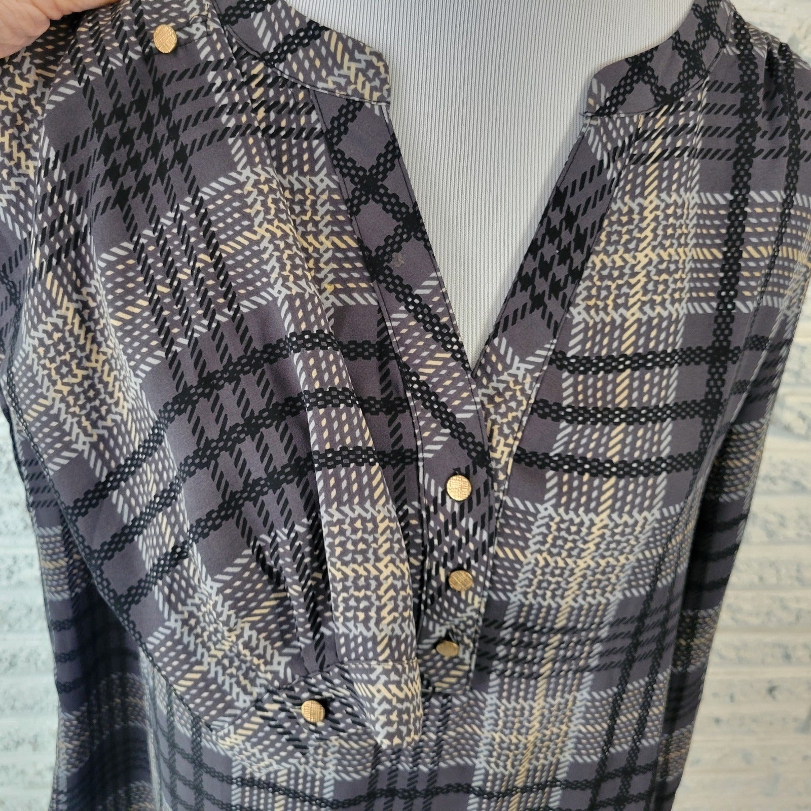 Investments II Womens Top 1X Plus Roll Tab Sleeve Polyester Gray Plaid Button