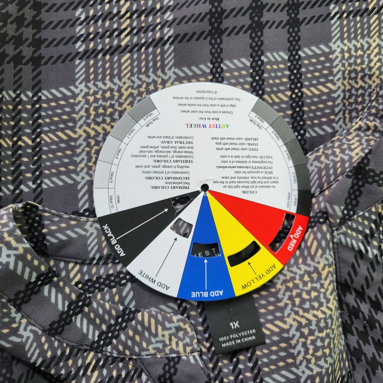 The Investments II Women's Top in size 1X Plus is a stylish and versatile addition to any wardrobe. This gray plaid quarter button features long sleeves with roll tab details, a V-neckline, and a regular fit. Made from lightweight polyester, this top is perfect for all seasons and occasions, whether it's for travel, casual outings, or business meetings. Machine washable for easy care, this top offers comfort and style with a classic and timeless design.