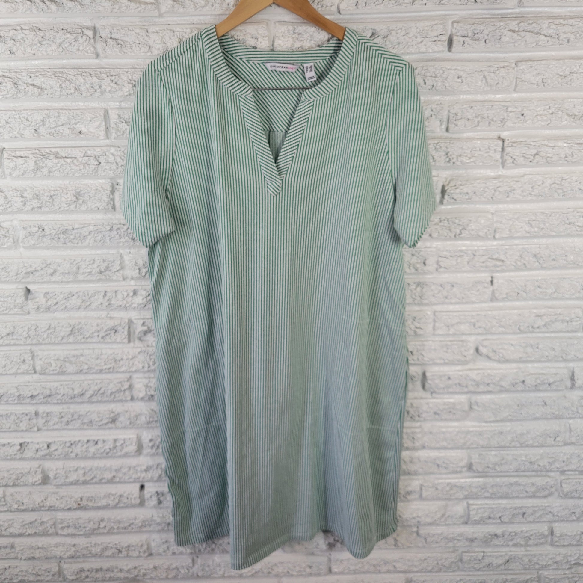 The Isaac Mizrahi Live Women's Dress Swim Coverup in 1X size is a stylish and versatile piece perfect for travel or casual occasions. This green/white striped dress features a V-neckline, short sleeves, and a pullover closure for easy wear. Made with stretch fabric and pockets for added convenience, this short dress is easy to care for with machine washable instructions. The brand's reputation for quality and the mini, shirt, and t-shirt dress styles make this a must-have addition to any woman's wardrobe.