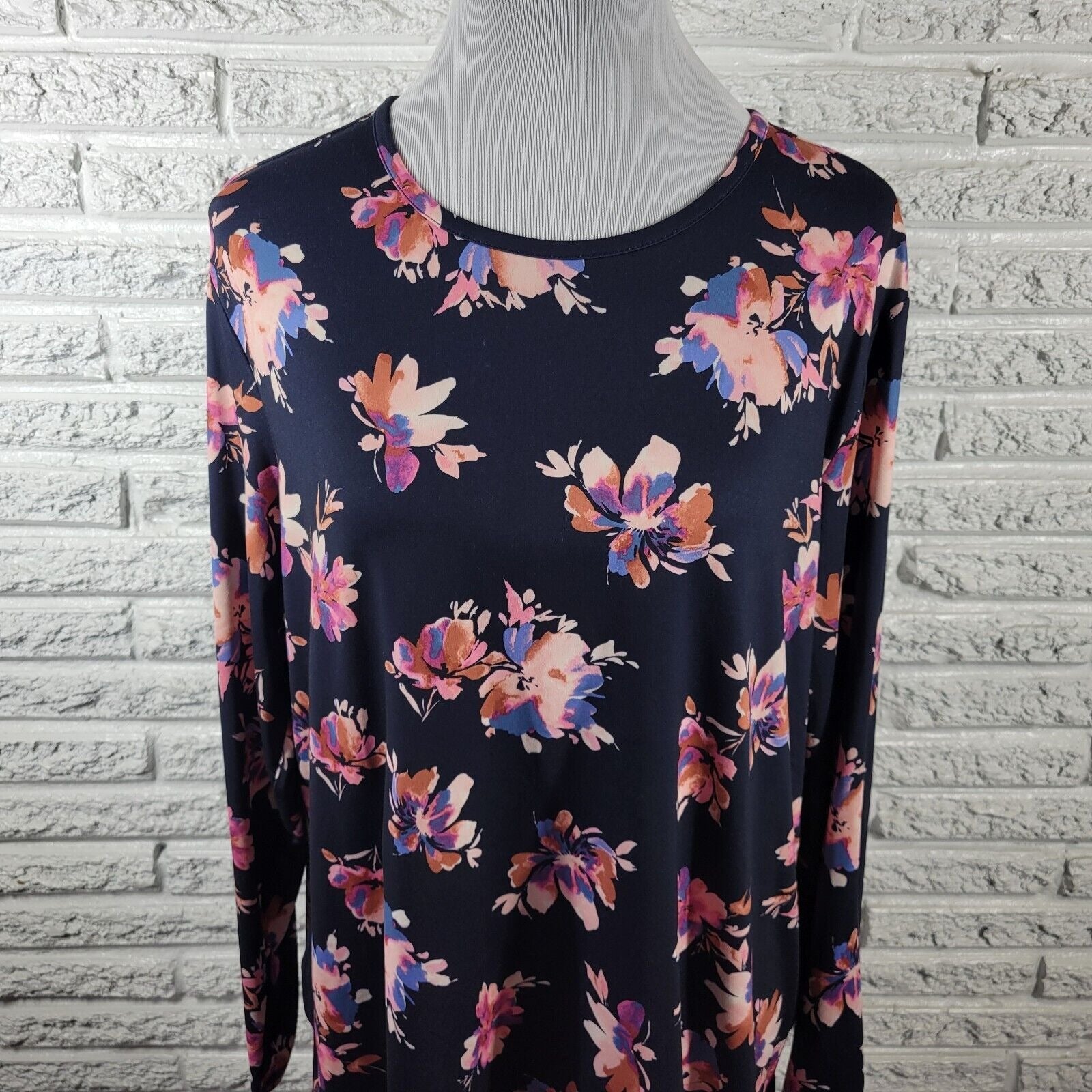 J Jill Fit Womens Top Extra Large Tee Long Sleeve Blue Pink Floral Poly Blend