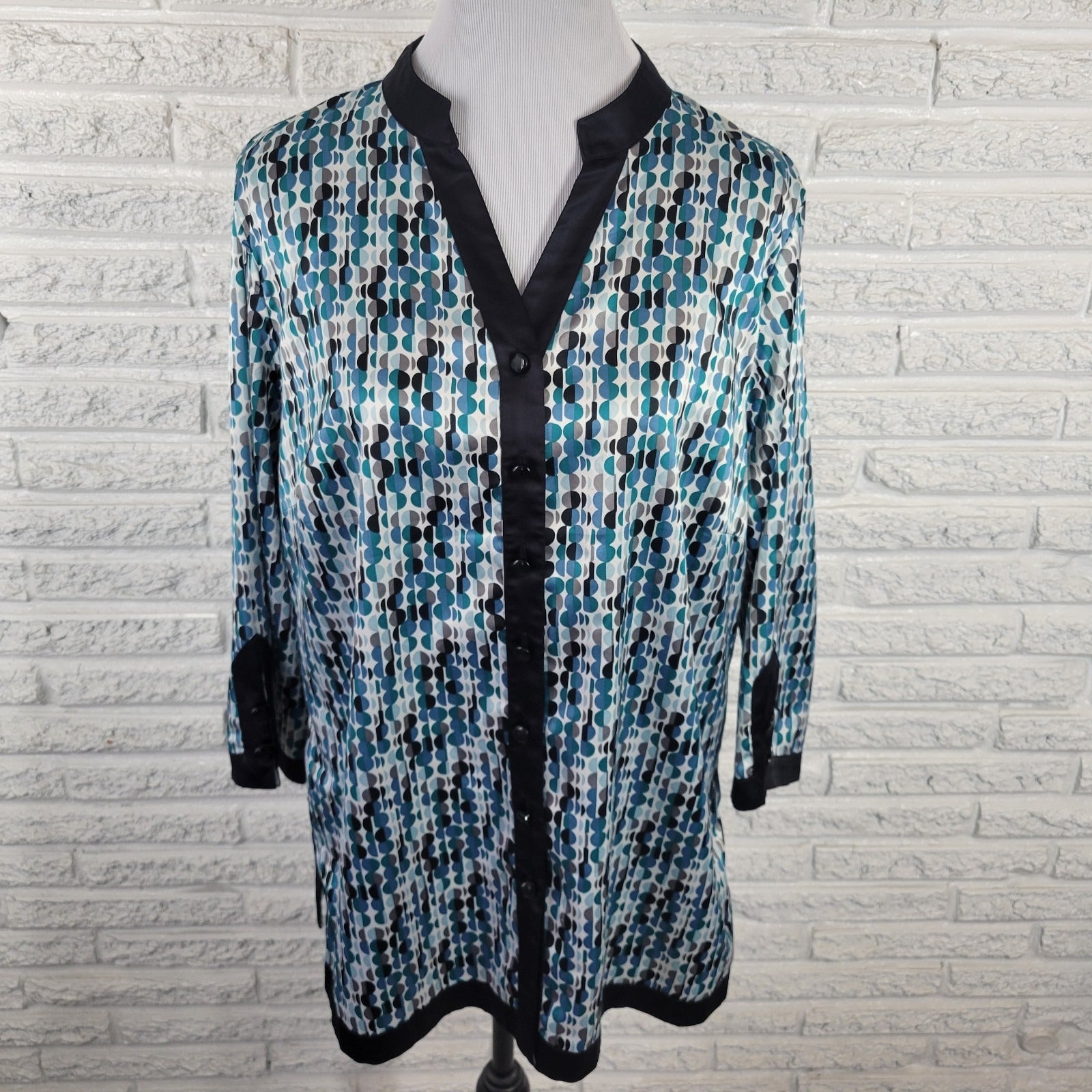 This JM Collection women's top in size 16W is a stylish and versatile addition to any wardrobe. Featuring a V-neckline, 3/4 sleeves, and a button closure, it is perfect for casual, business, or travel occasions. Made from a comfortable polyester blend in a blue/black geometric circles pattern, this top is machine washable and offers a regular fit. The classic/fitted sleeves and slit detail make it suitable for all seasons, from winter to summer. This basic style top from the trusted brand JM Collection is a timeless choice for any woman.