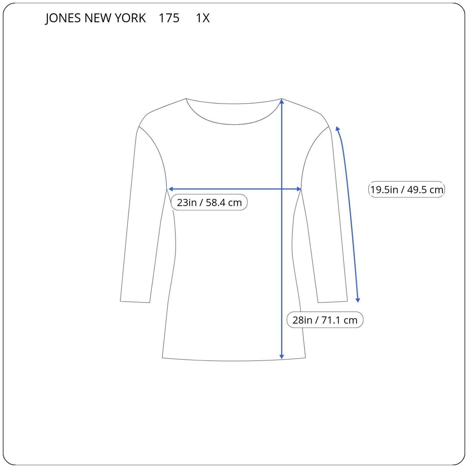 This Jones New York Women's Top in size 1X features a classic striped pattern in vibrant red/gray colors, perfect for casual or travel occasions. With a 3/4 sleeve length and a comfortable crew neckline, this blouse is made from a lightweight and stretchy polyester blend material. The pullover closure makes it easy to wear, and the regular fit ensures a flattering silhouette. This versatile top is suitable for all seasons, making it a stylish addition to any woman's wardrobe.