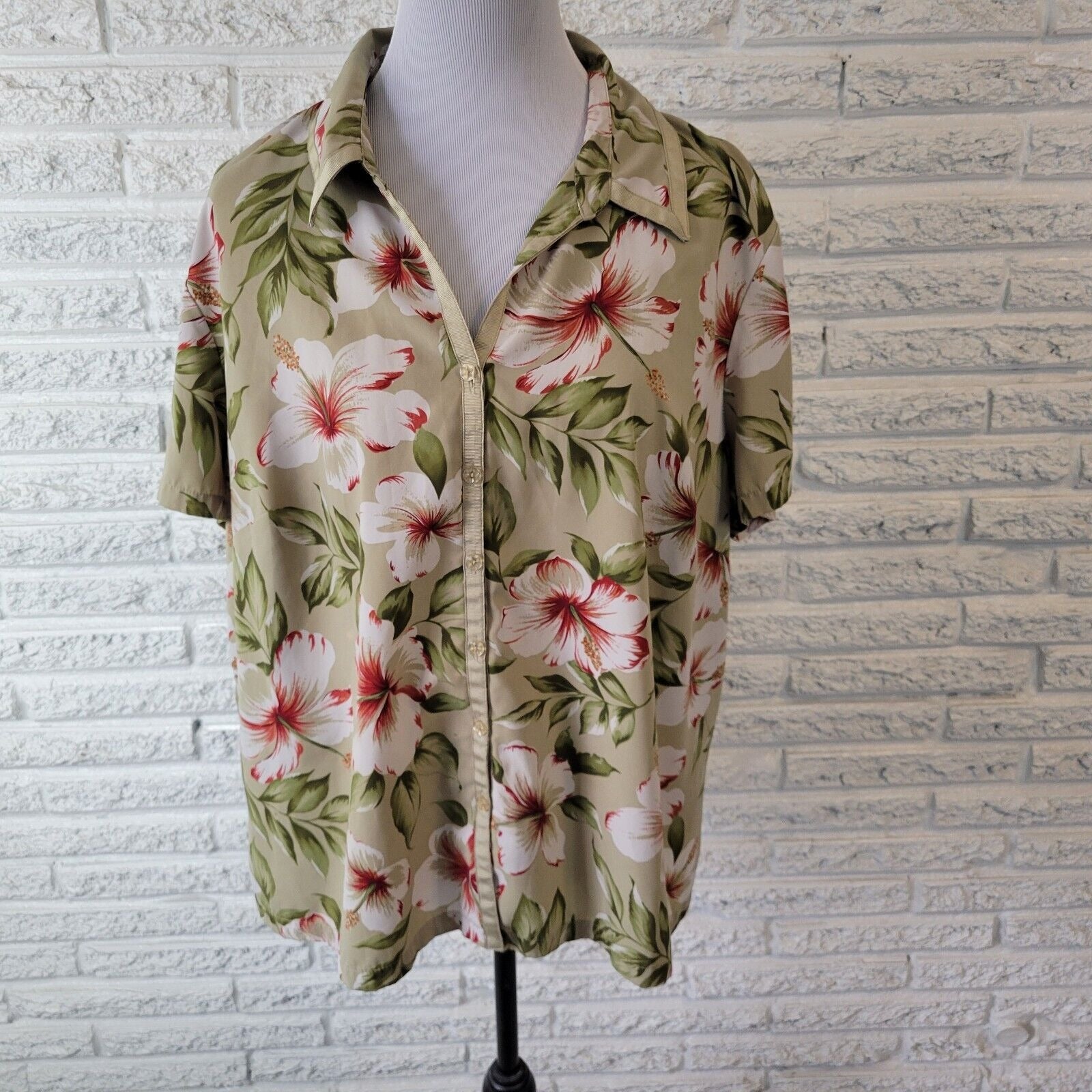 Judith Hart Womens Top 20W Short Sleeve Button Up Green Red Floral Lightweight