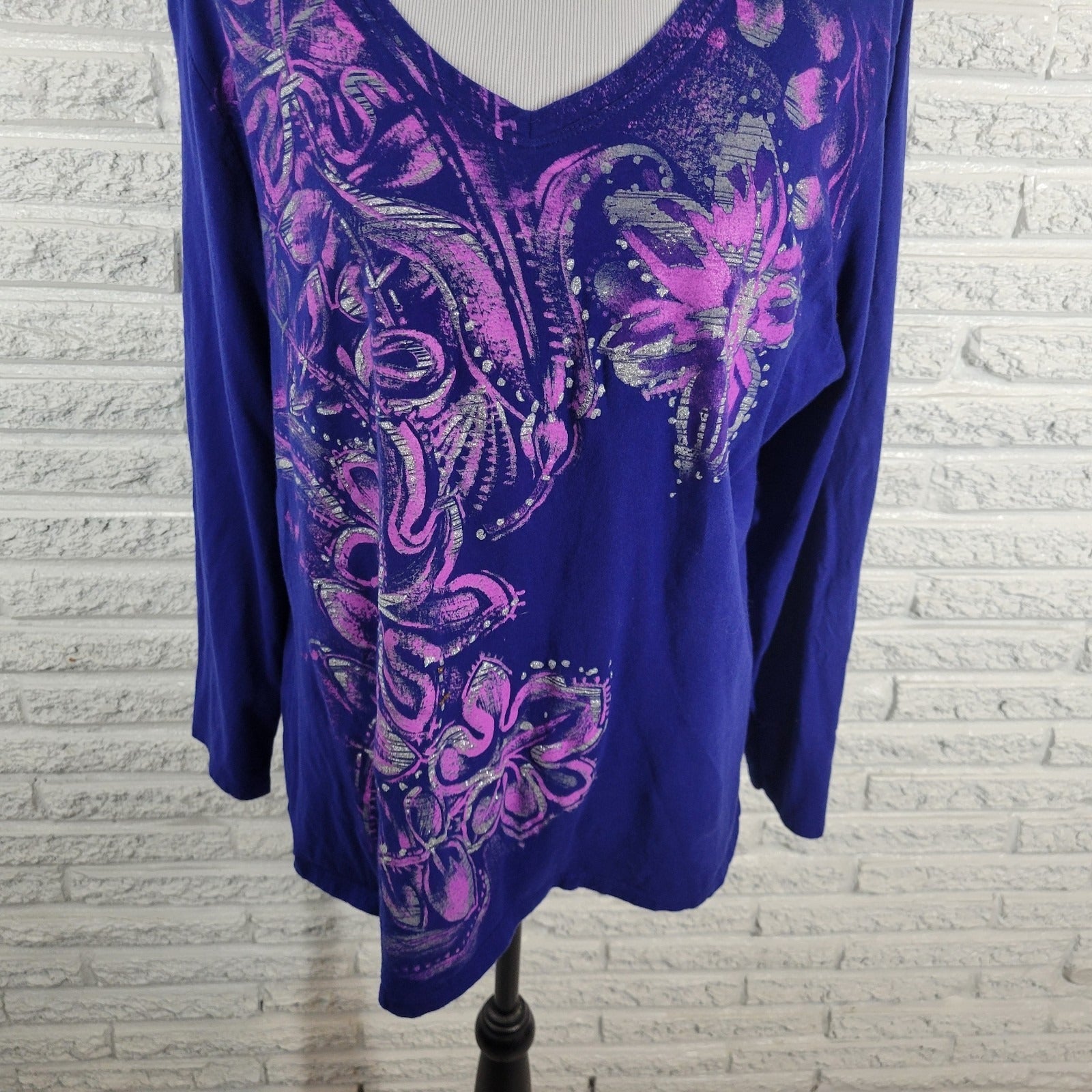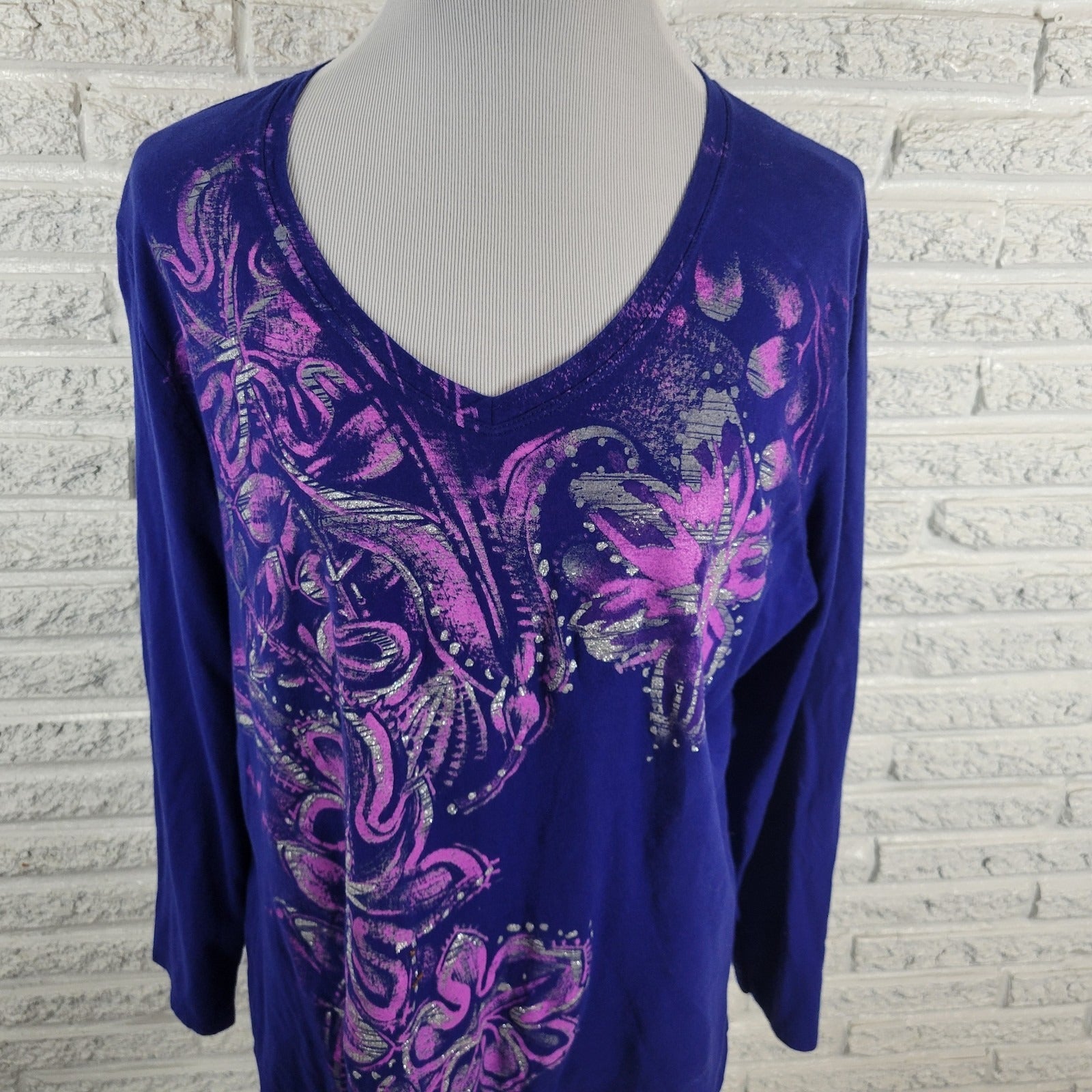 Just My Size Womens Top 2X Plus Tee Long Sleeve Blue Floral Glitter Cotton Comfy