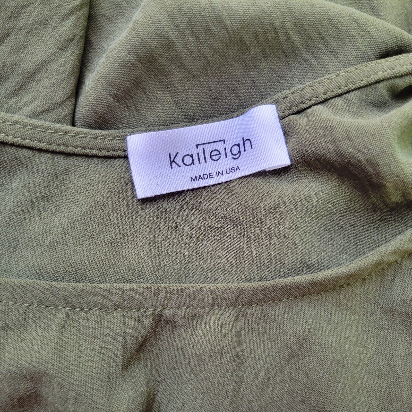 The Kaleigh Women Top in size 1X Plus is a comfortable and casual blouse made from lightweight polyester material. With ruffle sleeves and a solid green color, this pullover top is perfect for travel and everyday wear. The top features a round neck, short sleeves, and a regular fit, making it suitable for all seasons including winter, summer, fall, and spring. Made in the United States, this stylish basic top from KALEIGH is a versatile addition to any woman's wardrobe.