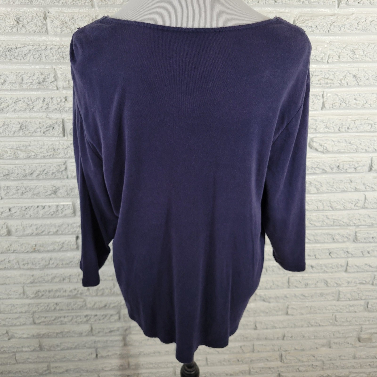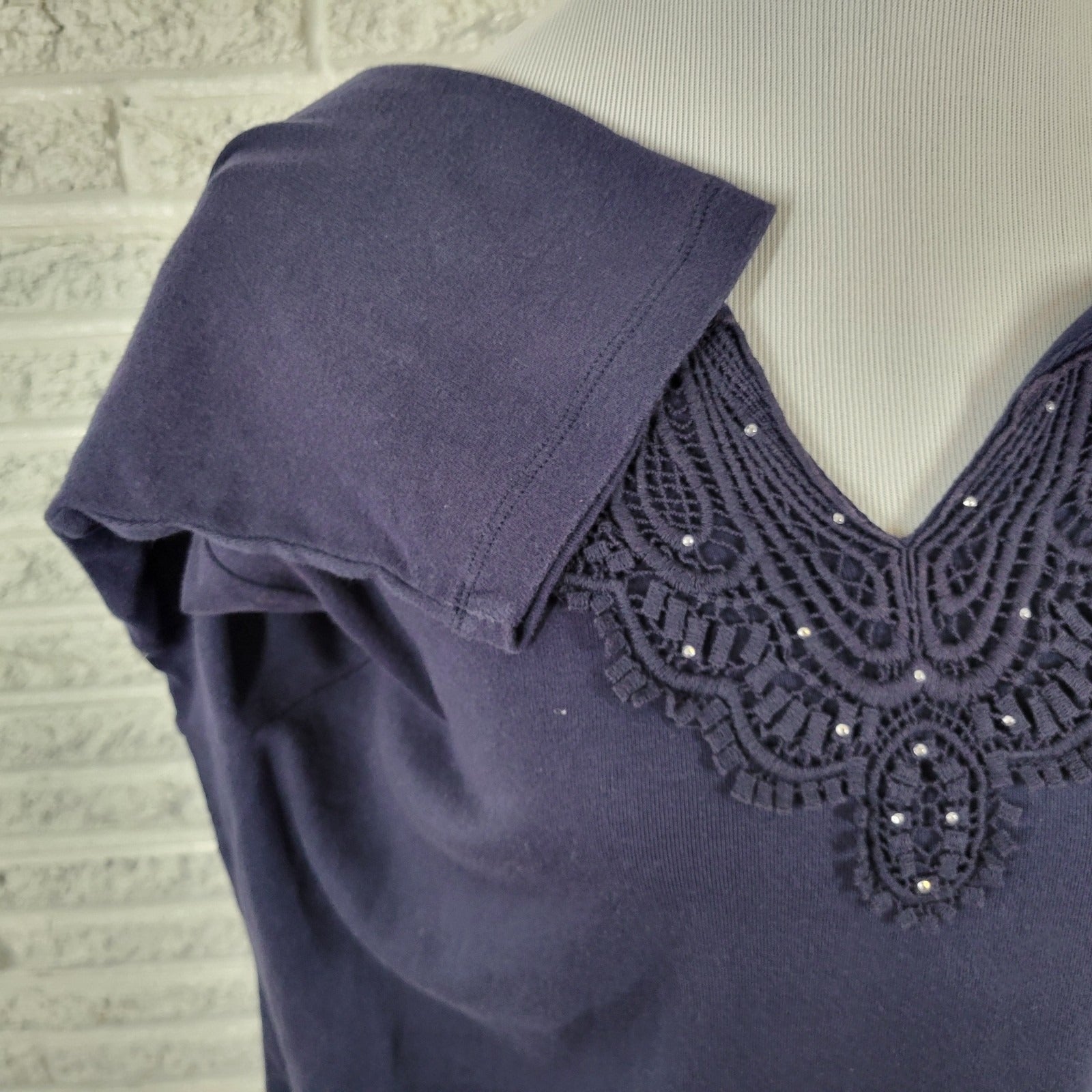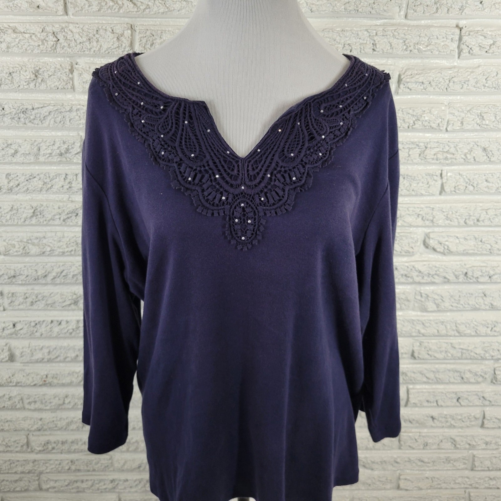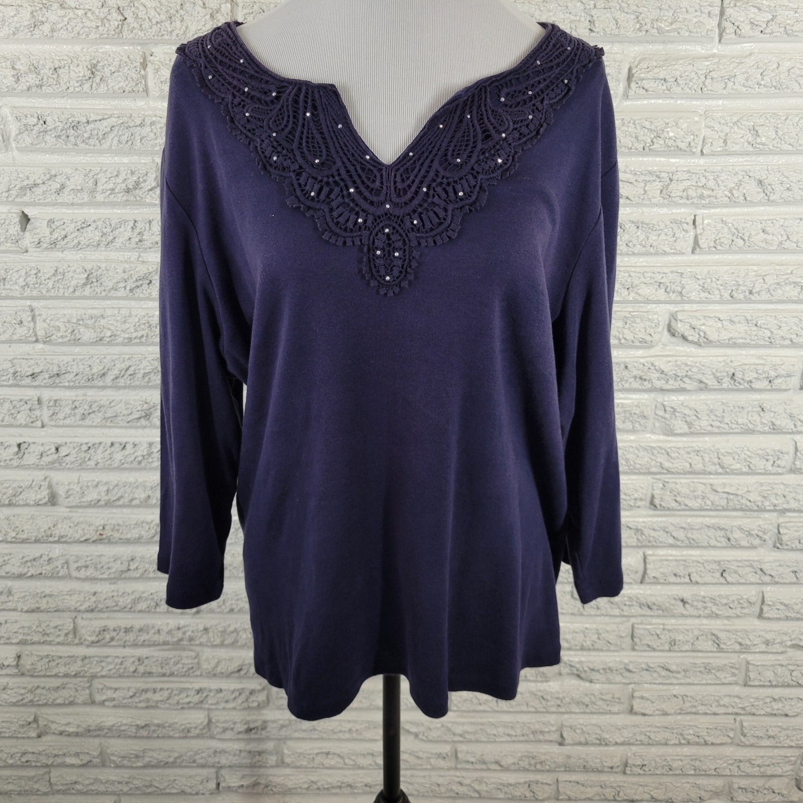 Karen Scott Womens Top 2X Plus 3/4 Sleeve Blue Crochet Trim Studded Casual Comfy