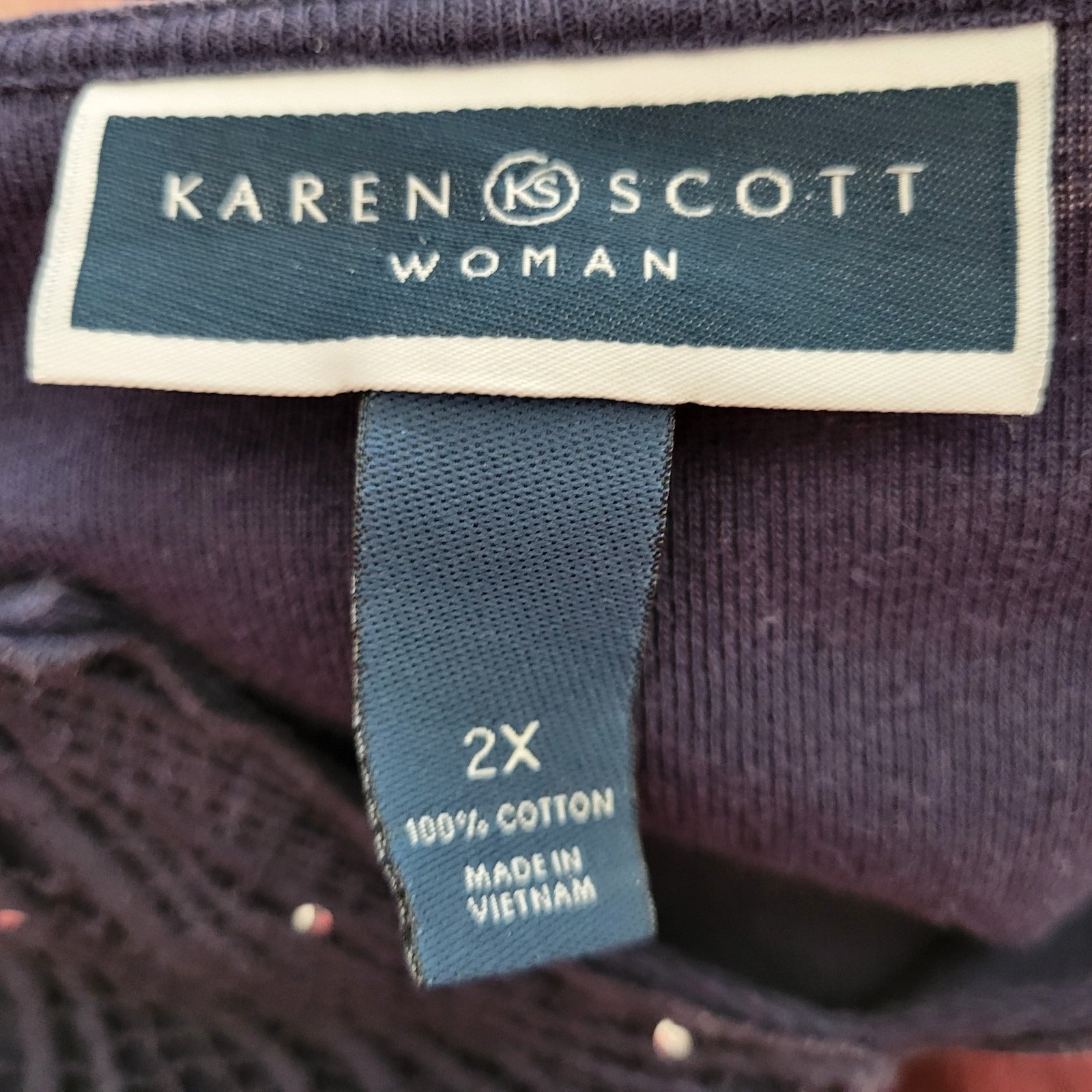 The Karen Scott Women's Top in size 2X Plus is a versatile and comfortable addition to any wardrobe. This casual blouse features a V-neckline, 3/4 sleeves with crochet trim, and studded accents for added detail. Made from 100% cotton, it is machine washable and suitable for all seasons, making it perfect for travel or everyday wear. The Regular fit and stretch material ensure a comfortable and flattering silhouette for women looking for a basic yet stylish top.