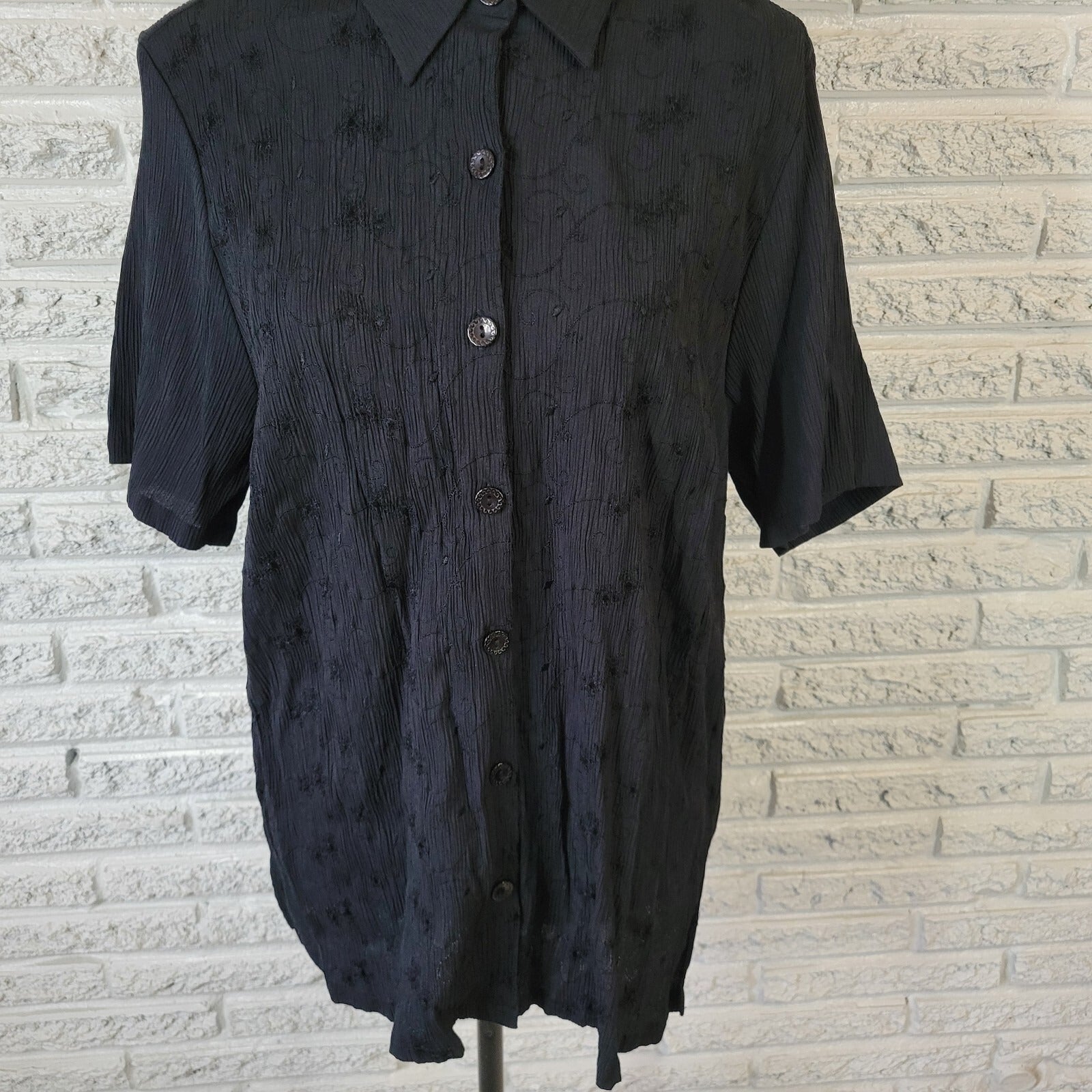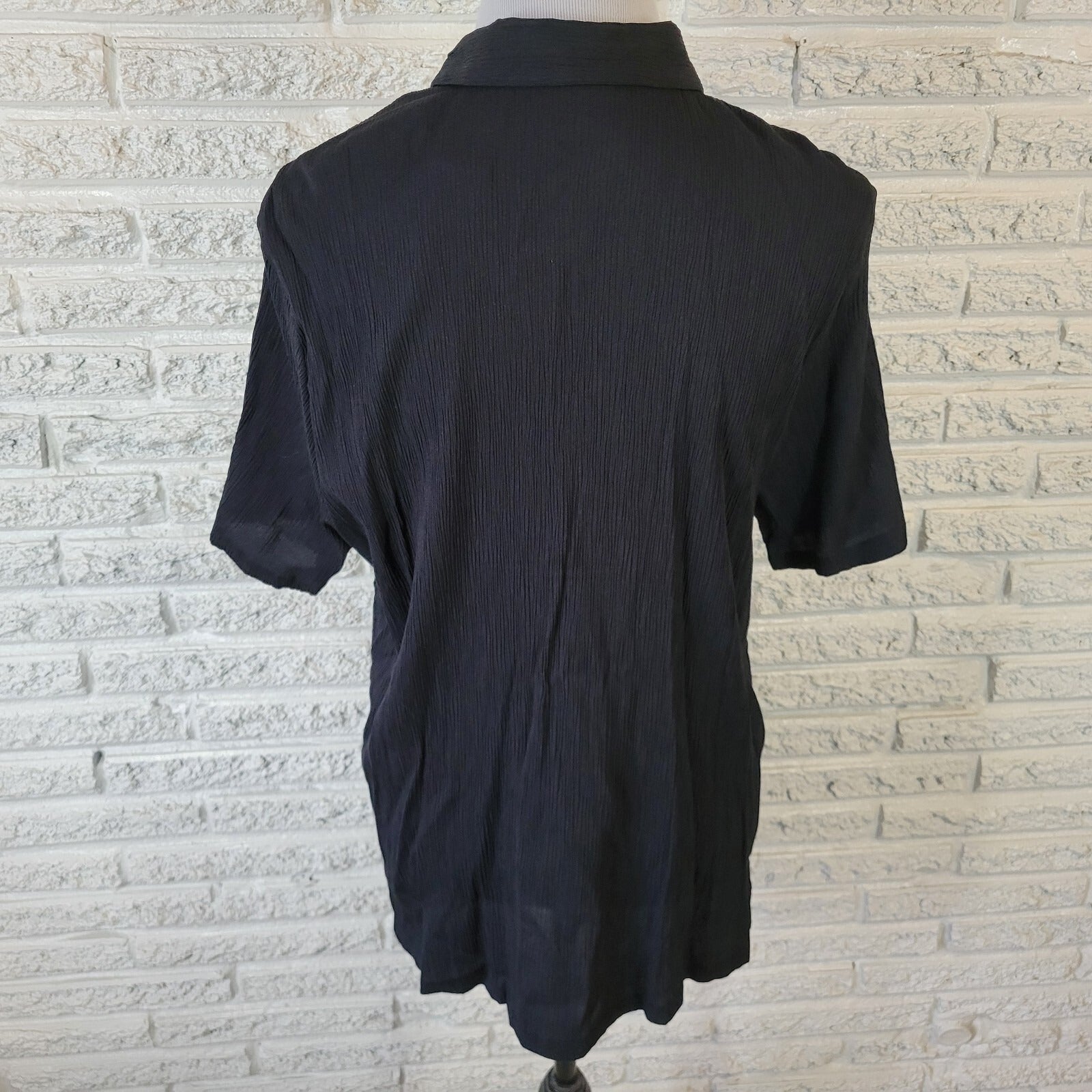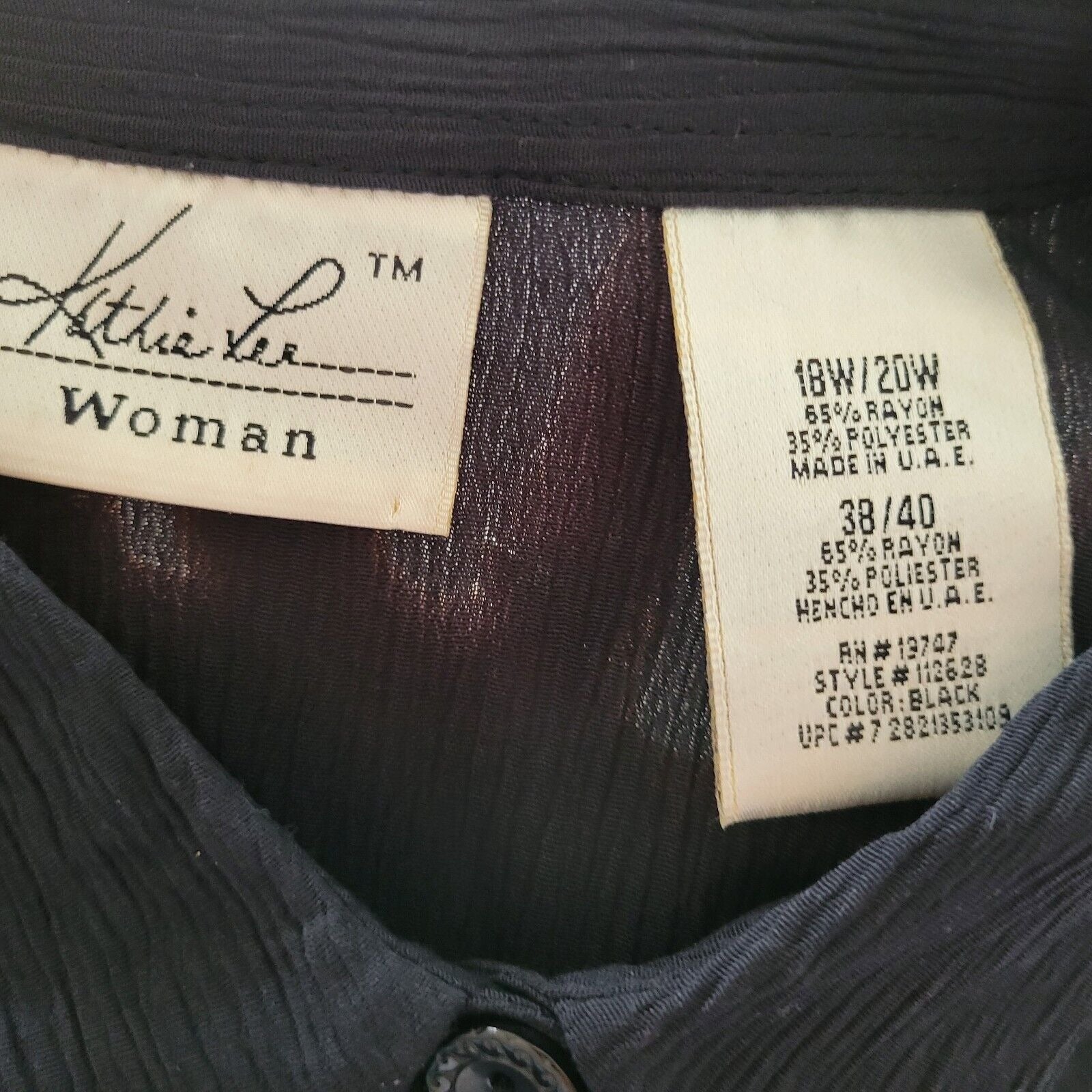 Crafted for comfort and style, this Kathie Lee women's top is a versatile addition to any wardrobe. The size 18W top features a classic collared neckline with a tasteful embroidered accent that adds a touch of elegance. Short sleeves make it an ideal choice for various casual occasions, including travel and everyday wear. The top is machine washable for easy care and is made from a blend of polyester and rayon, ensuring both durability and a gentle stretch for all-day comfort. Its solid black color and lightweight fabric make it a perfect pick for any season, whether layered under a jacket or worn alone. The button-up closure completes the look with a timeless touch.