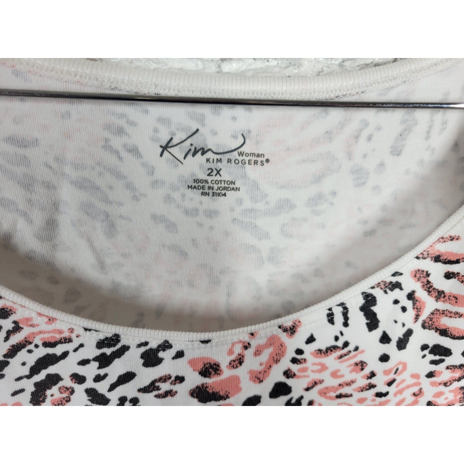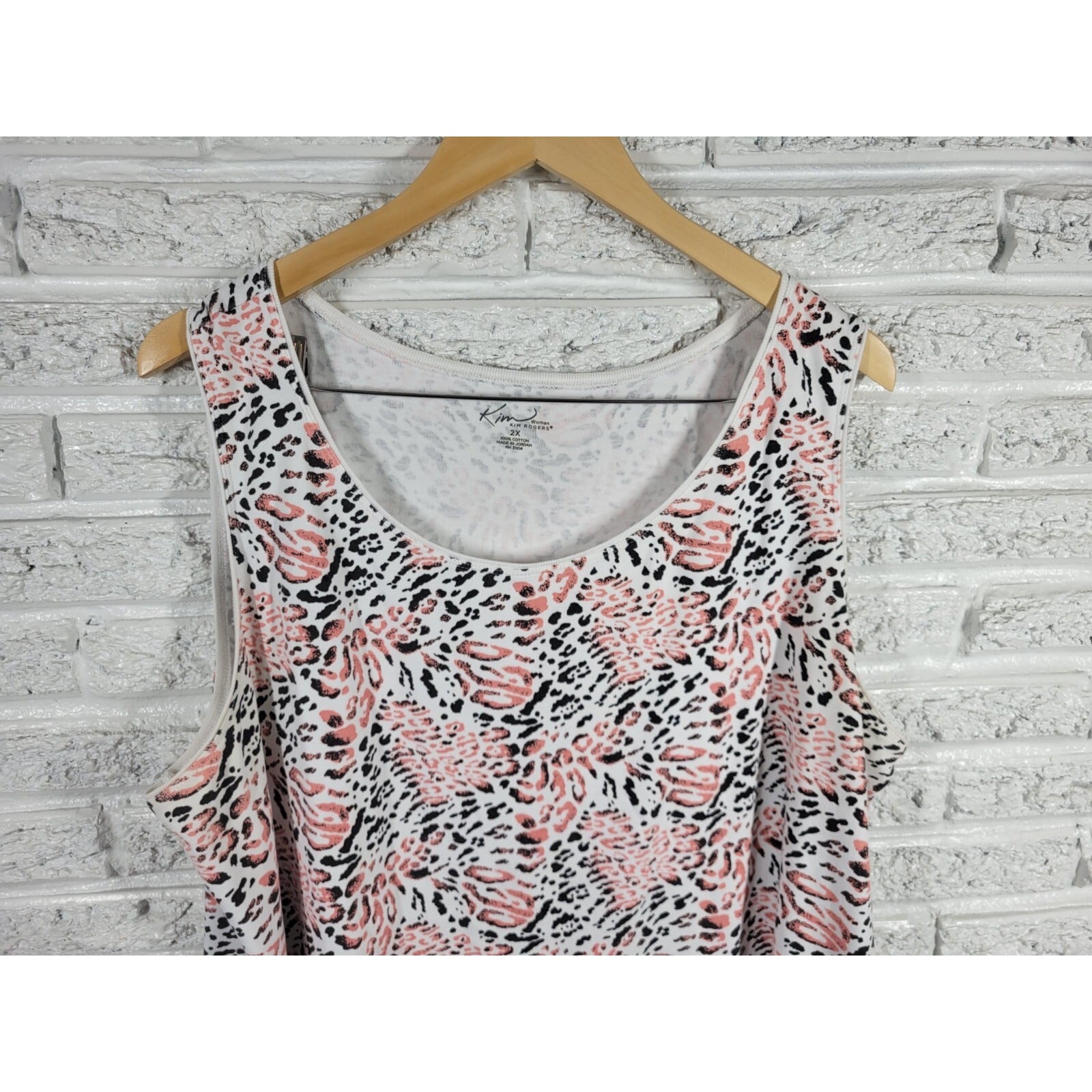 This is a Kim Rogers women's tank top in size 2X. It features a pink animal print design on cotton material, with a round neckline and pullover closure. The sleeveless top has a regular fit and is stretchy, making it suitable for all seasons. It is machine washable and perfect for casual occasions.
