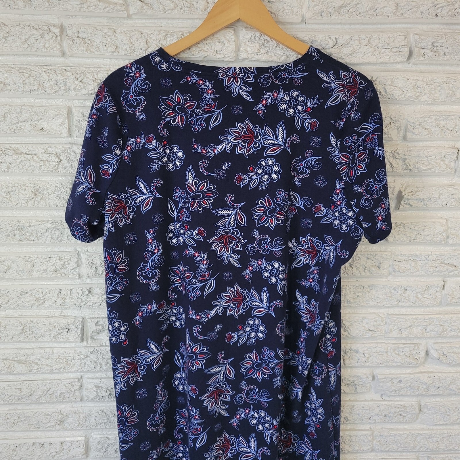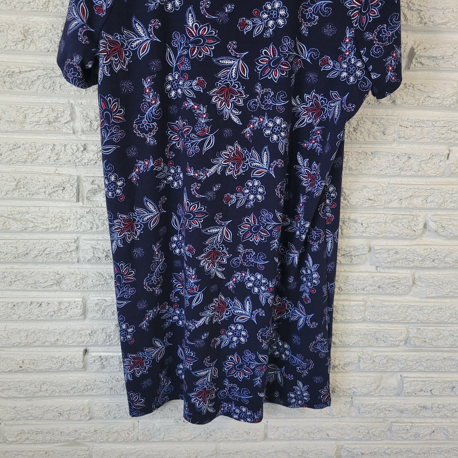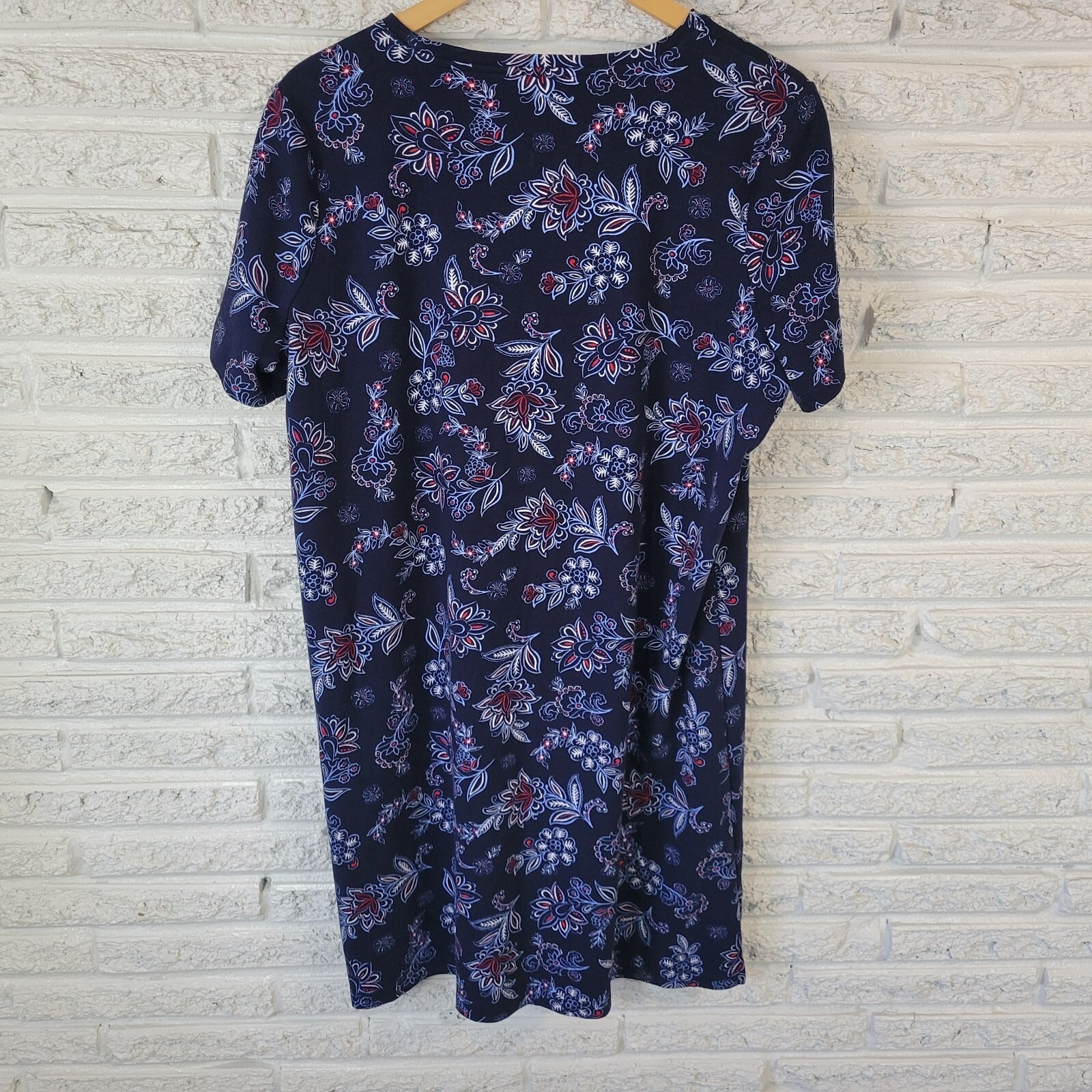Embrace everyday comfort with the Kim Rogers Perfectly Soft Mini Dress, a versatile addition to your wardrobe that's suitable for any casual occasion or your next travel adventure. The dress features a charming blue and red floral pattern that adds a splash of color to your outfit, while the short sleeves and classic crew neck design keep it effortlessly stylish. Crafted from 100% cotton, this t-shirt dress promises breathability and ease of care, being machine washable for your convenience. The size XL ensures a relaxed fit for the regular body type, and the dress's short length paired with a side slit offers a flattering look for a variety of seasonal events throughout fall, spring, summer, or winter.