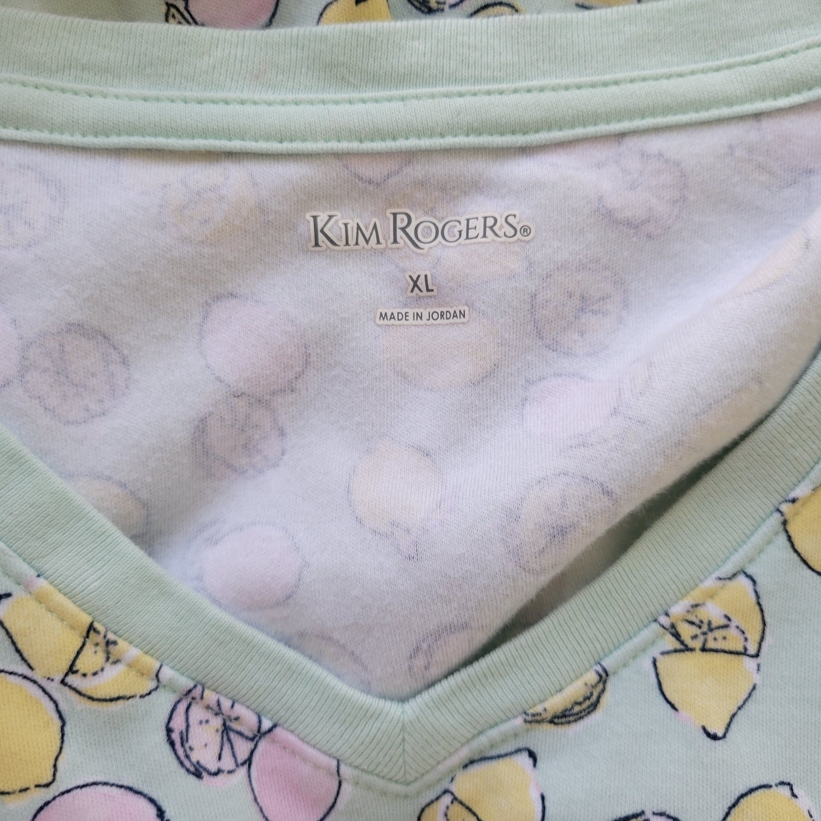 The product is a Kim Rogers women's top in size XL, featuring green and yellow colors with lemons all over. Made from 100% cotton jersey fabric, this short sleeve V-neck tee has a pullover closure and is machine washable. The shirt offers a regular fit for comfort and comes in a basic style suitable for casual or travel occasions. With its stretch material and all-season features, this top is versatile for all seasons.