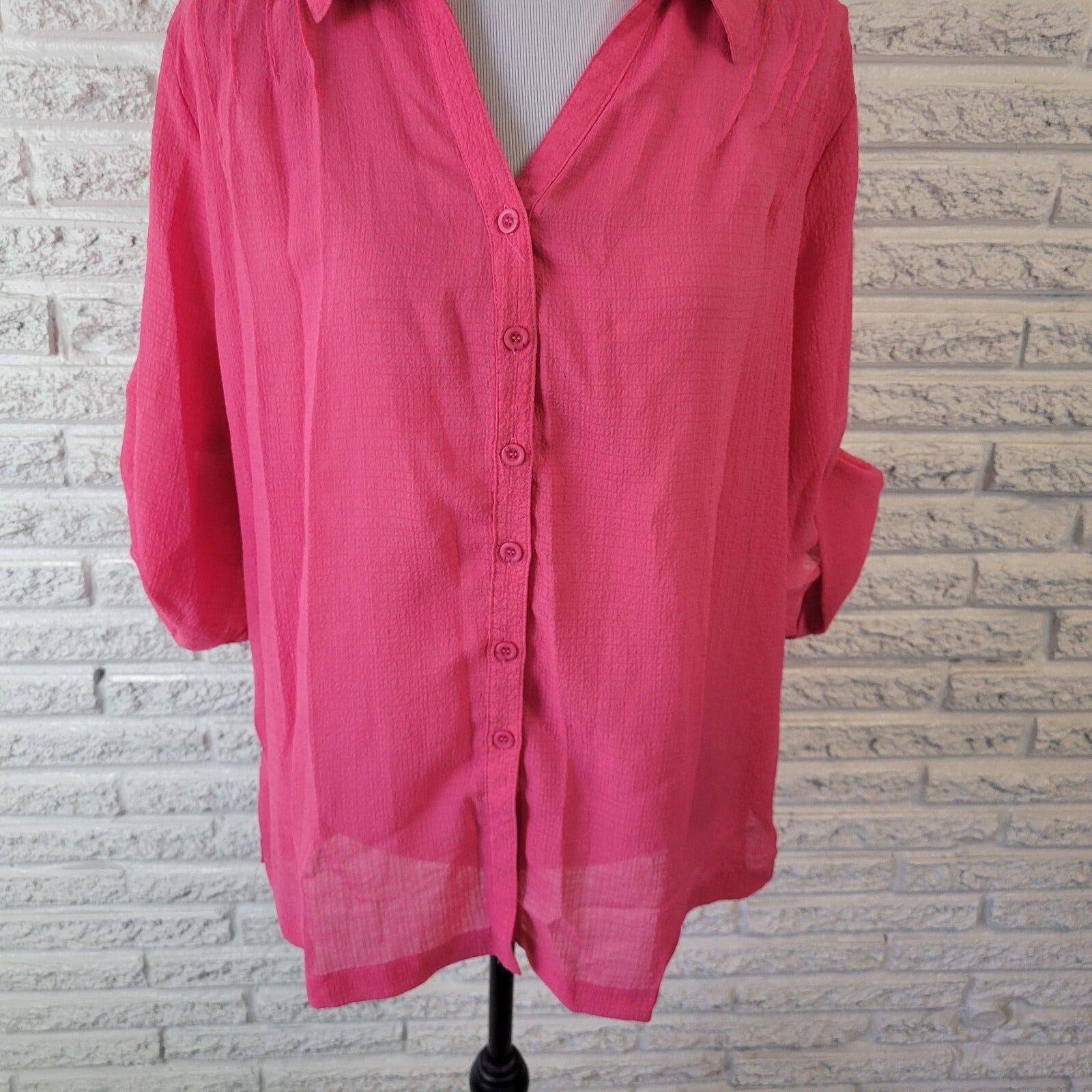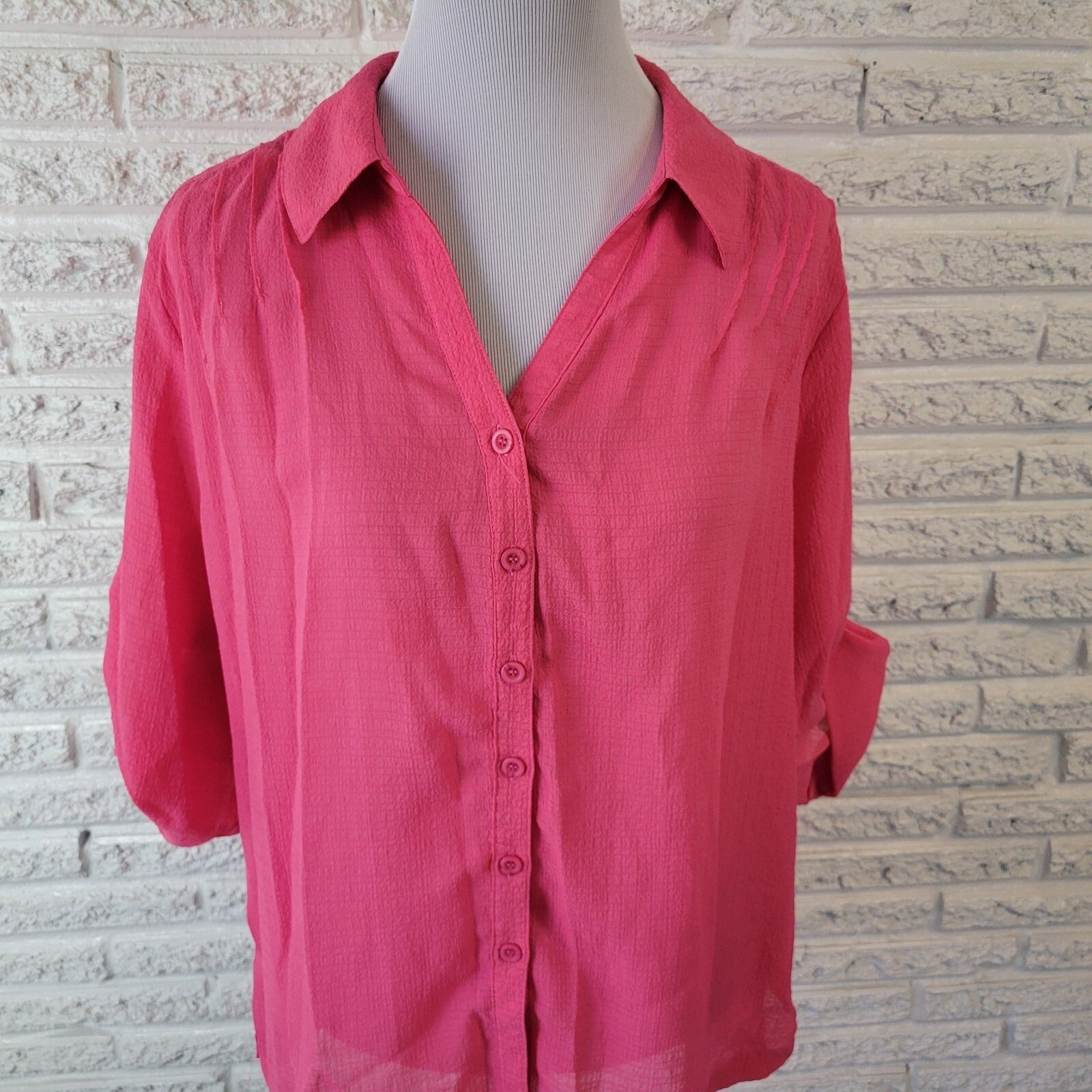 This Koret women's top in size XL features a solid pink color with 3/4 roll tab sleeves and a collared neckline. Made from a lightweight polyester blend, it is perfect for various occasions such as travel, casual outings, or business events. The pintuck sheer design adds a touch of elegance, making it suitable for all seasons. It is easy to care for with machine washable instructions, making it a versatile and stylish addition to any woman's wardrobe.