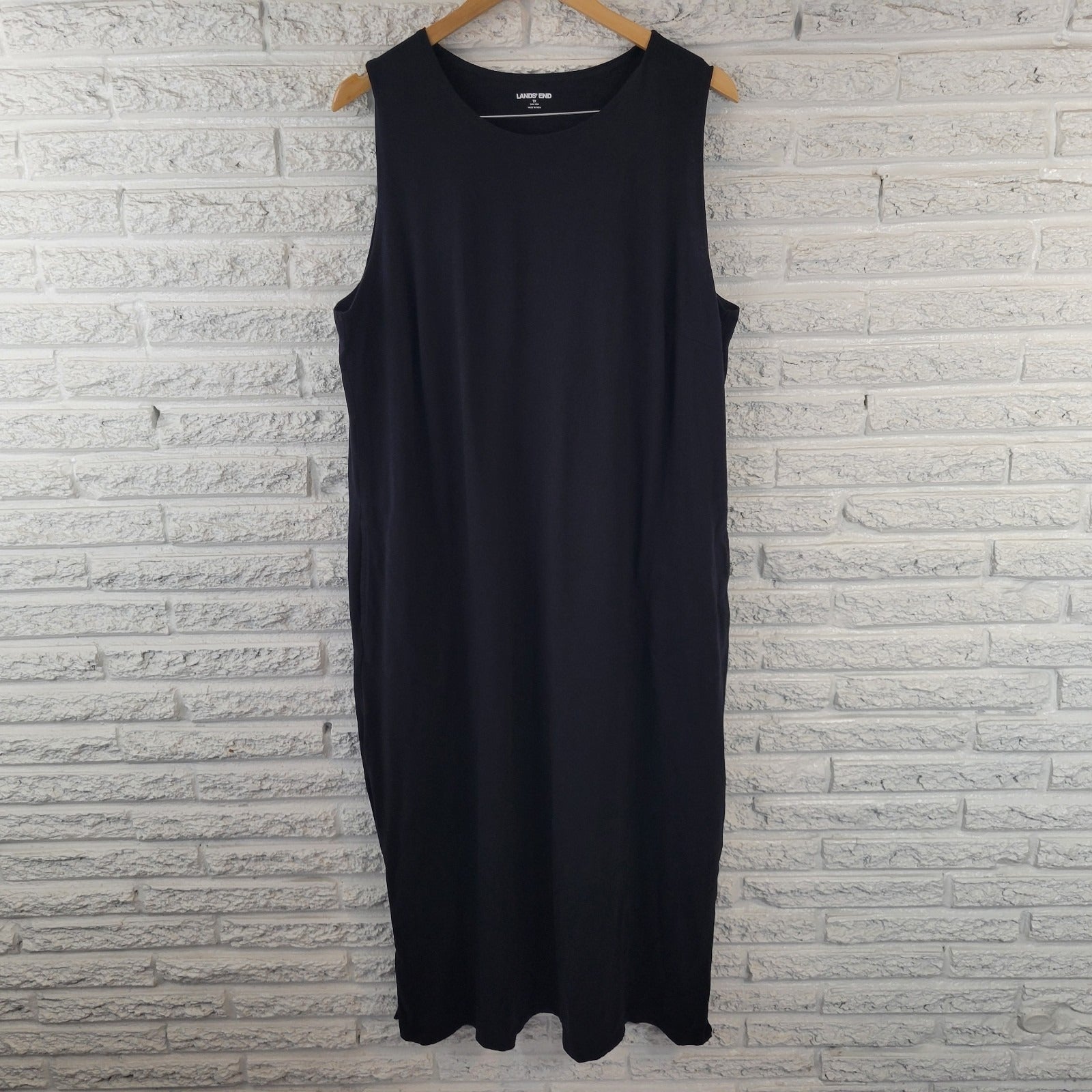 This Lands' End Women's Dress in size 1X Plus is a comfortable and versatile addition to any wardrobe. Made of 100% cotton, this sleeveless shift dress features a round neckline and a pullover closure for easy wear. The dress is designed with side slits and pockets for added convenience, making it ideal for travel and casual occasions. With a solid black color and a midi length, this dress can be worn in any season and is machine washable for easy care.