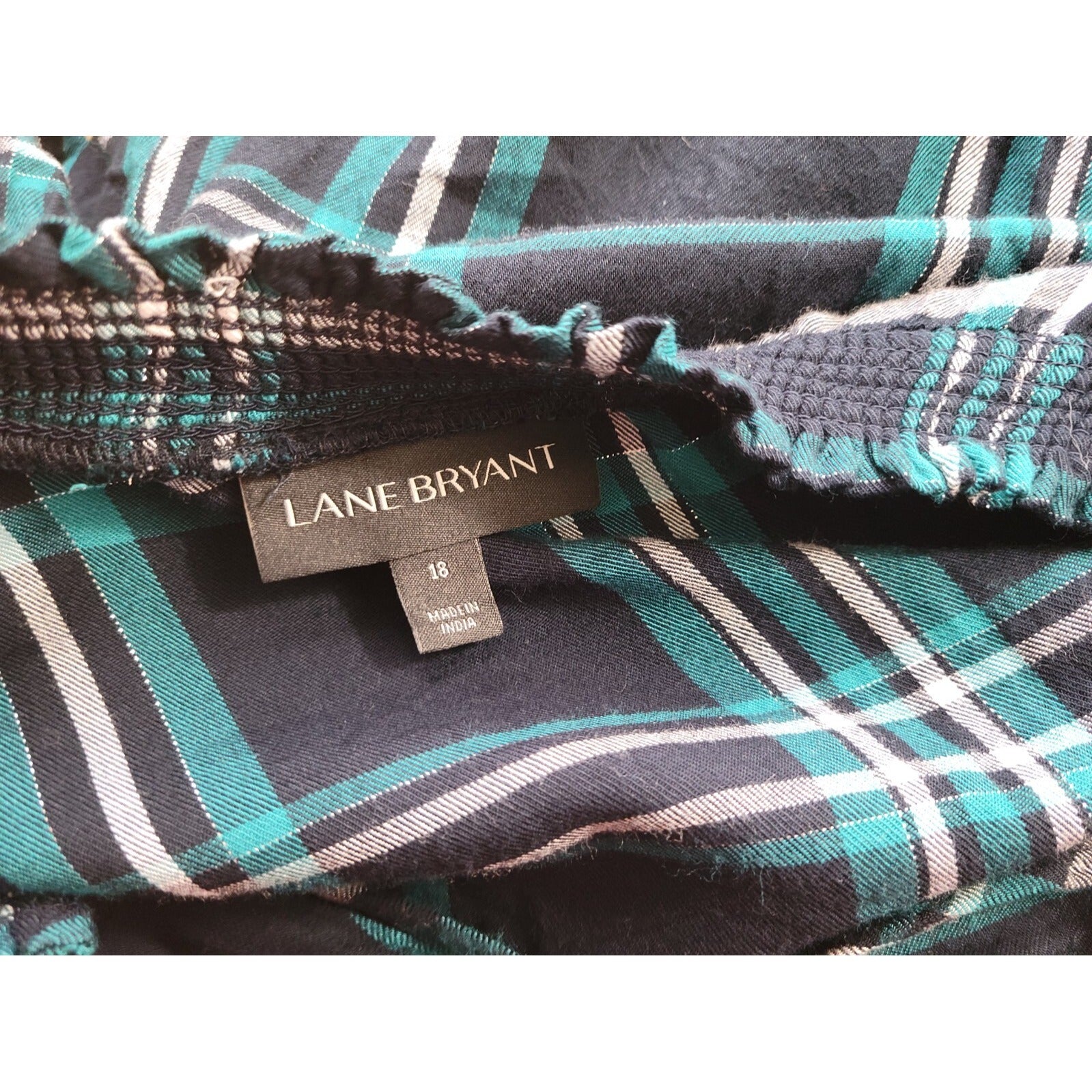 Elevate your casual wardrobe with this Lane Bryant plaid blouse in blue. The blouse features long fitted sleeves and a V-neckline with a pullover style closure. Its metallic and viscose material ensures comfort and durability while its regular fit provides a flattering silhouette. Perfect for any season, this blouse can be machine washed for easy maintenance. The classic yet stylish design with a touch of metallic sheen makes it a versatile addition to any wardrobe. Available in size 18 for plus size women, this Lane Bryant blouse is a must-have for any casual occasion.
