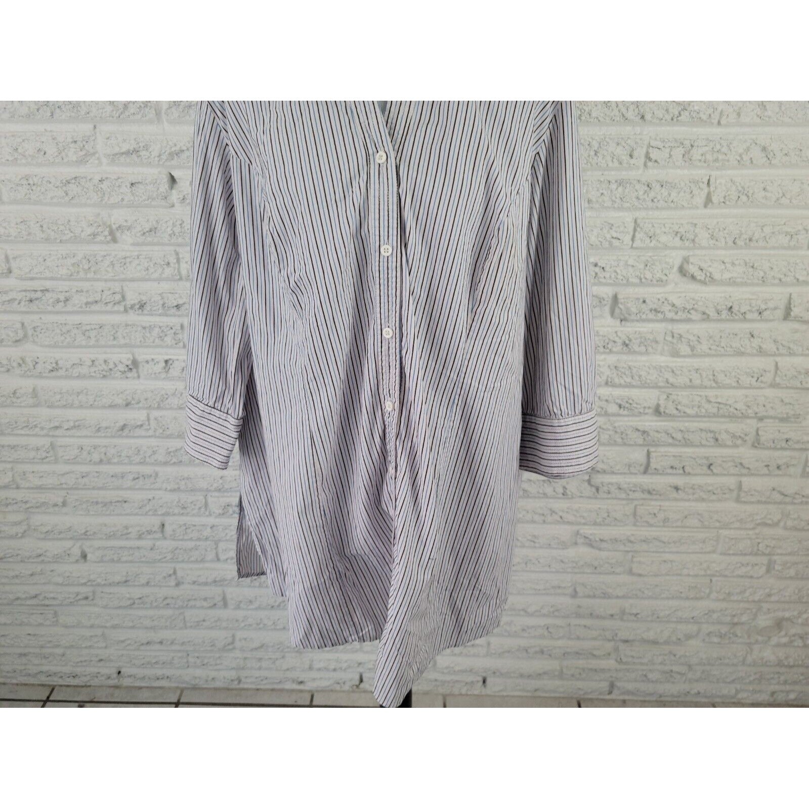 This Lane Bryant women's shirt in size 28 is a stylish addition to your wardrobe. The blue and black striped pattern, collared neckline, and 3/4 fitted sleeves make it perfect for both casual and business occasions. The shirt is made from a cotton blend material and features a classic button-up closure. It is machine washable for easy care and maintenance. The shirt is a regular fit and has a woven fabric type. It is a basic style that can be worn in all seasons, including winter, summer, fall, and spring. The Lane Bryant brand is known for its quality clothing, and this shirt is no exception. Add this versatile shirt to your collection today!
