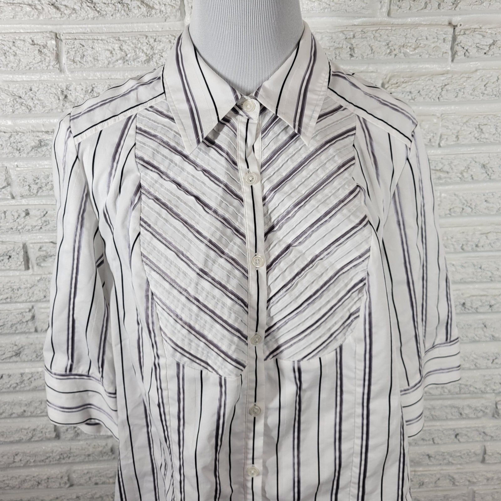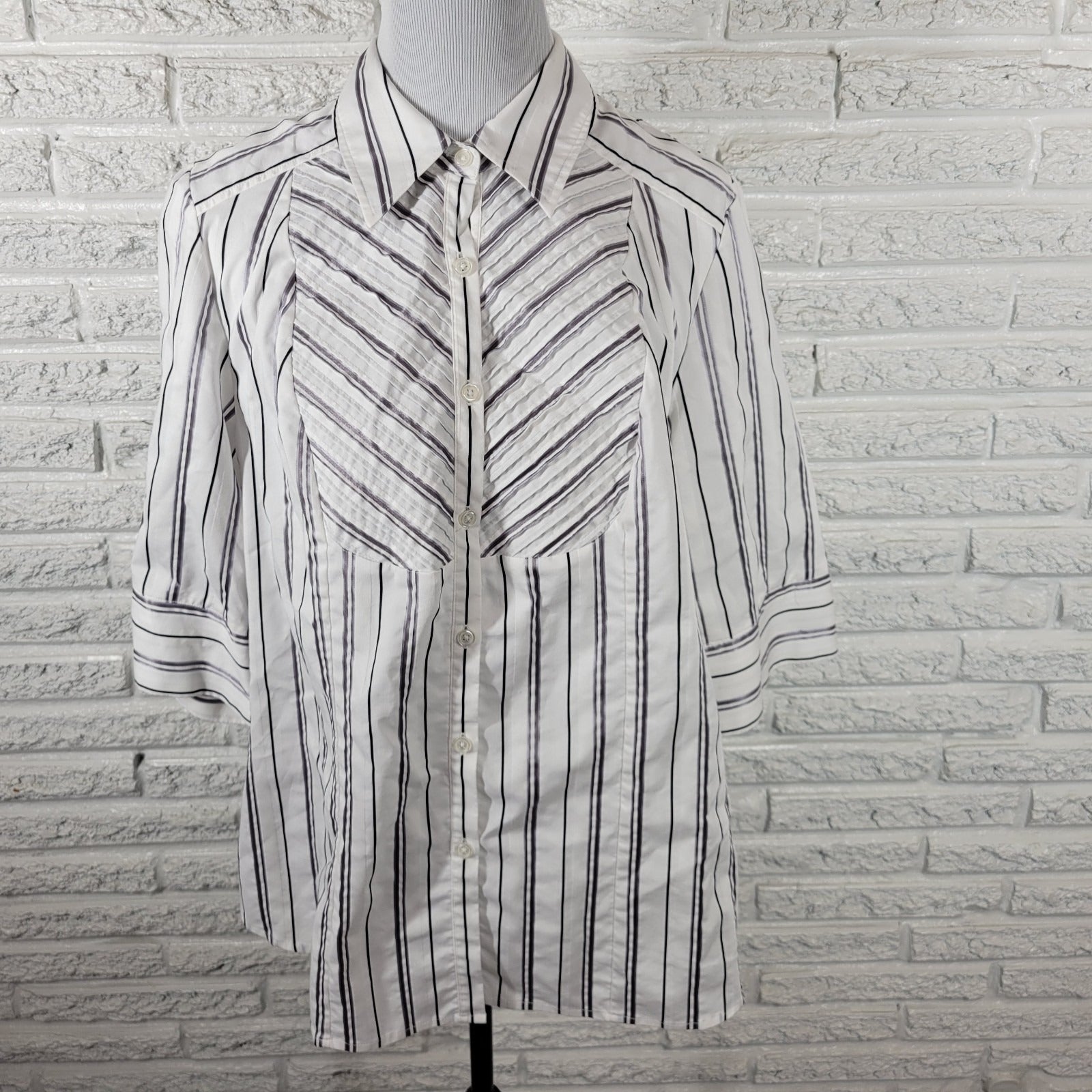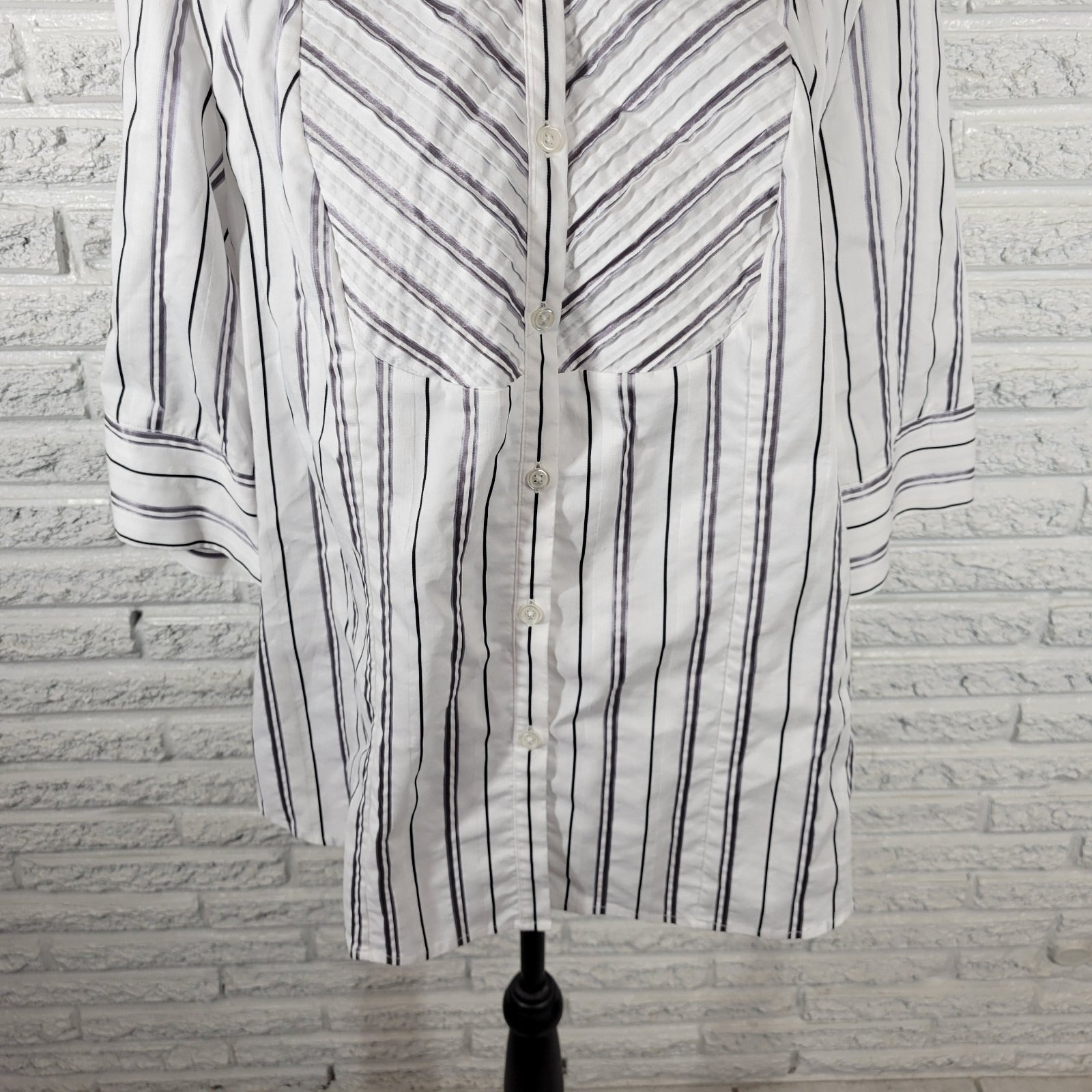 Lane Bryant Womens Top 18 20 Plus 3/4 Sleeve Button Up Pintuck Gray White Stripe