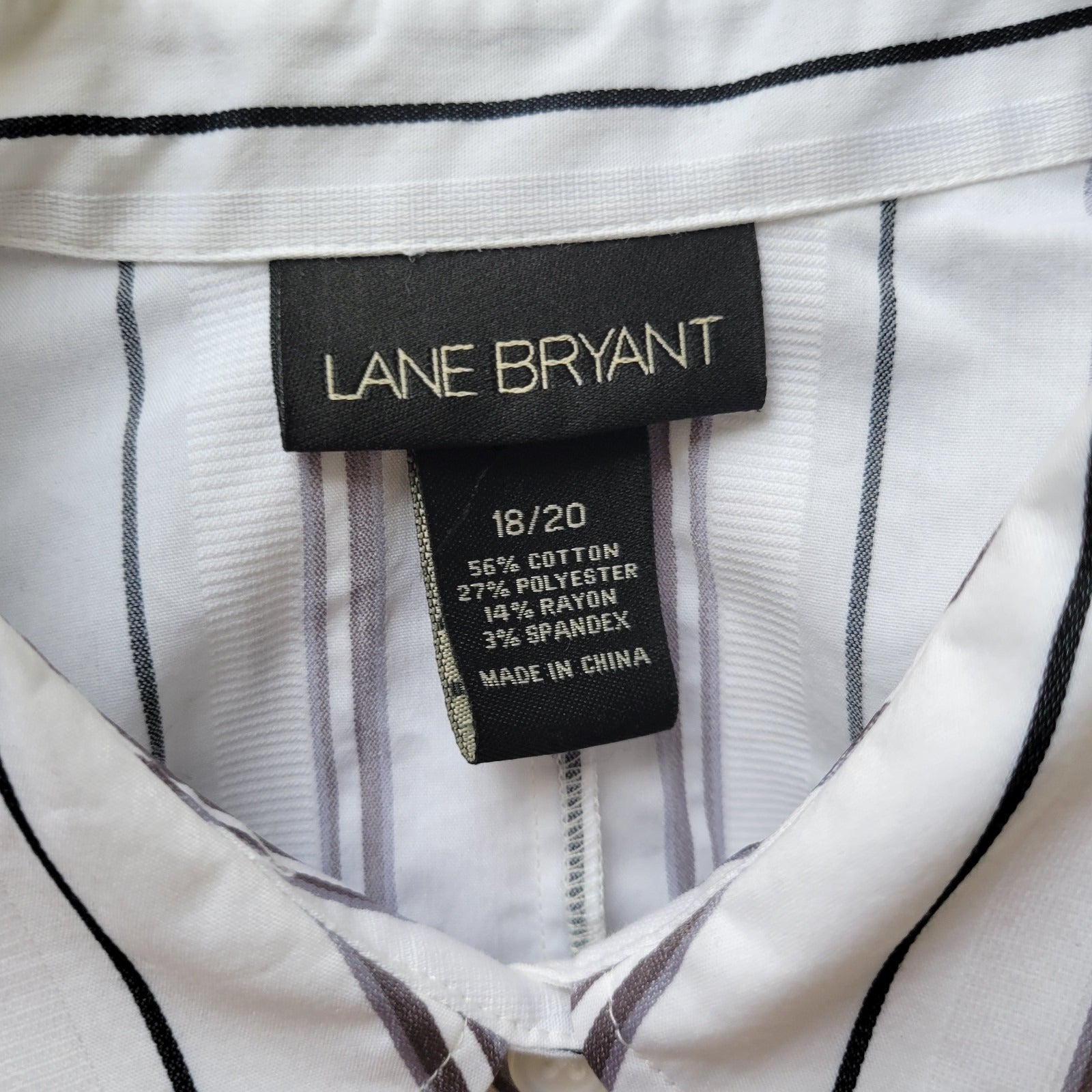 This Lane Bryant women's top in size 18/20 features a stylish gray and white striped design with a classic 3/4 sleeve button-up style. Made from a comfortable cotton blend material, this plus-size top includes a collared neckline and pleated accents for added detail. Perfect for casual or travel occasions, this top is easy to care for with machine washable instructions. With a regular fit and stretch features, it is a versatile and timeless addition to any wardrobe for all seasons.