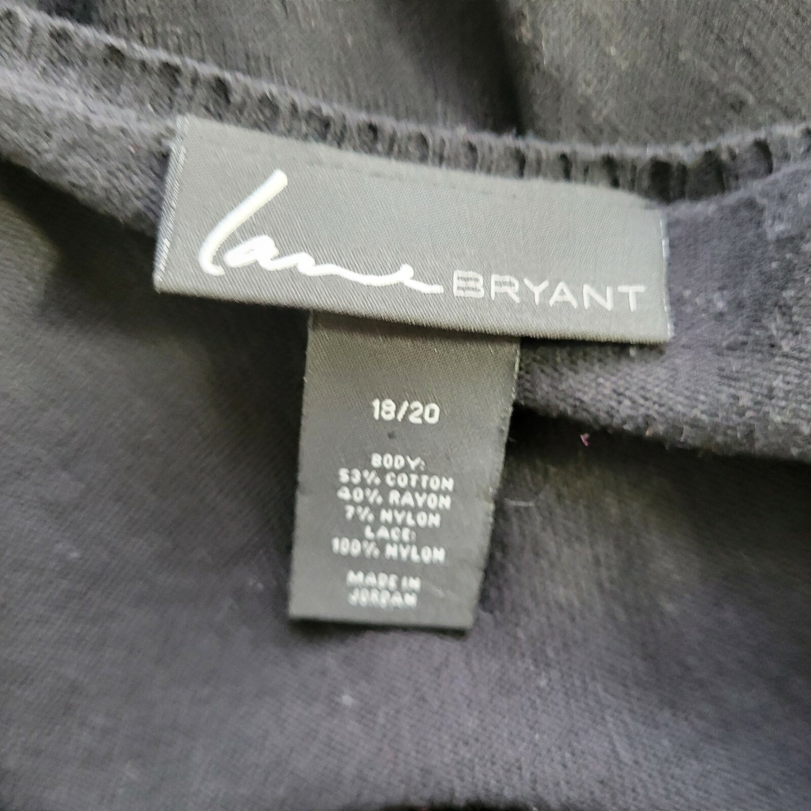 This Lane Bryant women's top in size 18/20 features a classic black color with long sleeves and a lace hem detail. Made from a comfortable cotton blend knit fabric, this pullover blouse is perfect for casual occasions in any season. The stretch material ensures a comfortable fit, while the round neckline and regular fit add to the basic yet stylish look. Ideal for women looking for a versatile and easy-to-care-for top in plus size.