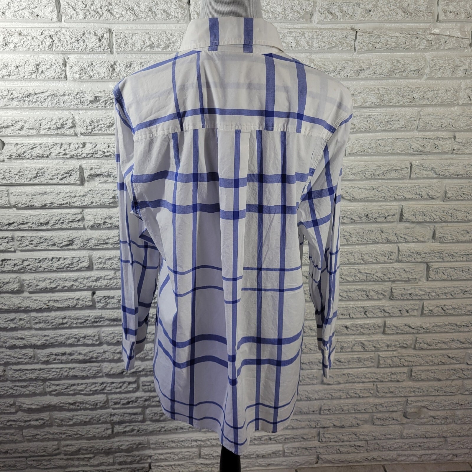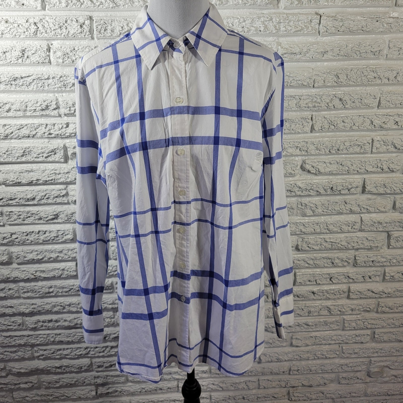 Embrace effortless style with this Lane Bryant blue plaid button-up top. Tailored for a comfortable, plus-size fit in size 18, this piece is crafted from a soft cotton blend, ensuring both comfort and durability. Its classic, long sleeves and smart collared neckline make it a versatile addition to your wardrobe, suitable for a variety of occasions from casual outings to travel. The top's lightweight fabric makes it ideal for all seasons, from the warm breezes of summer to the crisp air of fall. With its timeless plaid pattern and practical features like machine washability, this top marries convenience with classic style for a must-have addition to your casual collection.