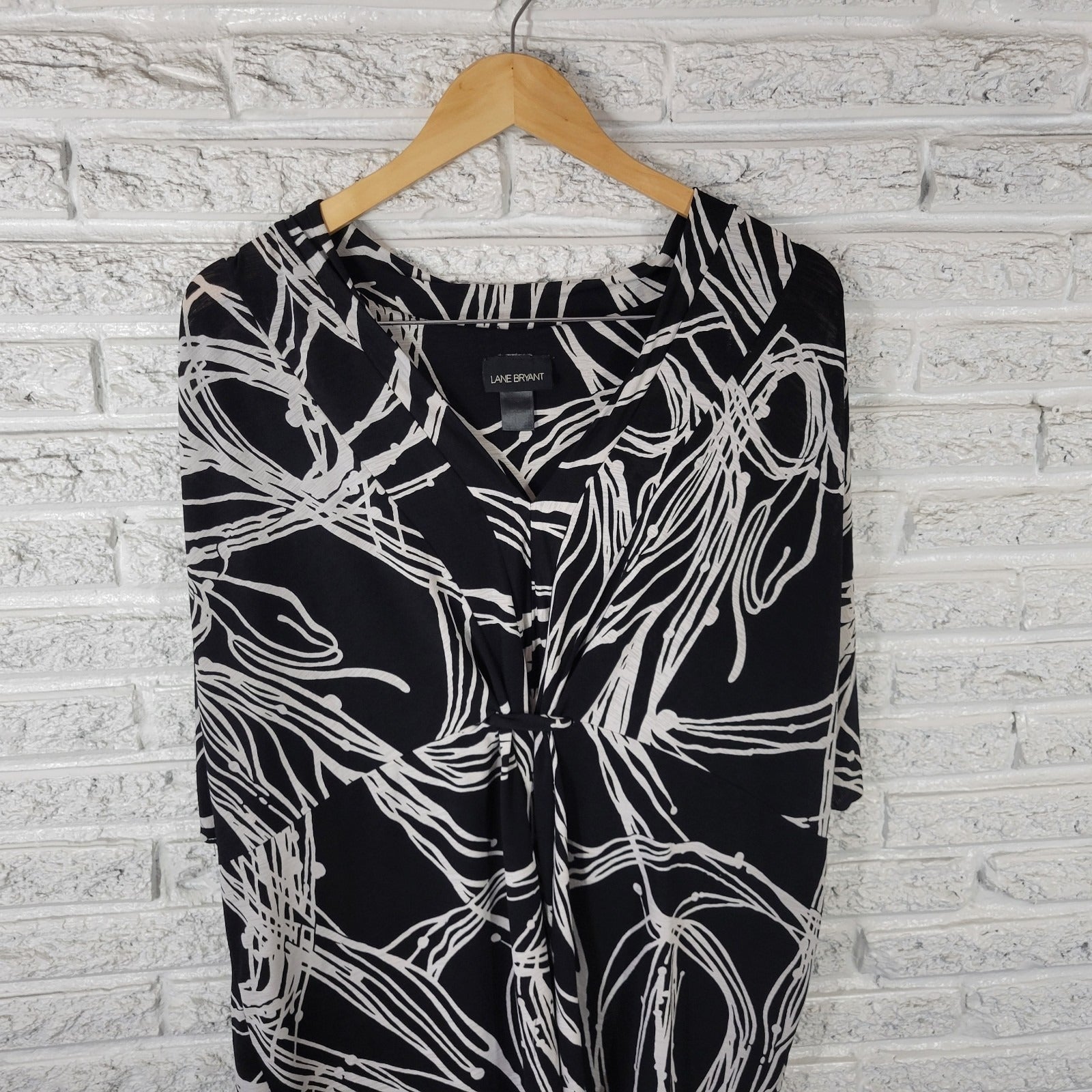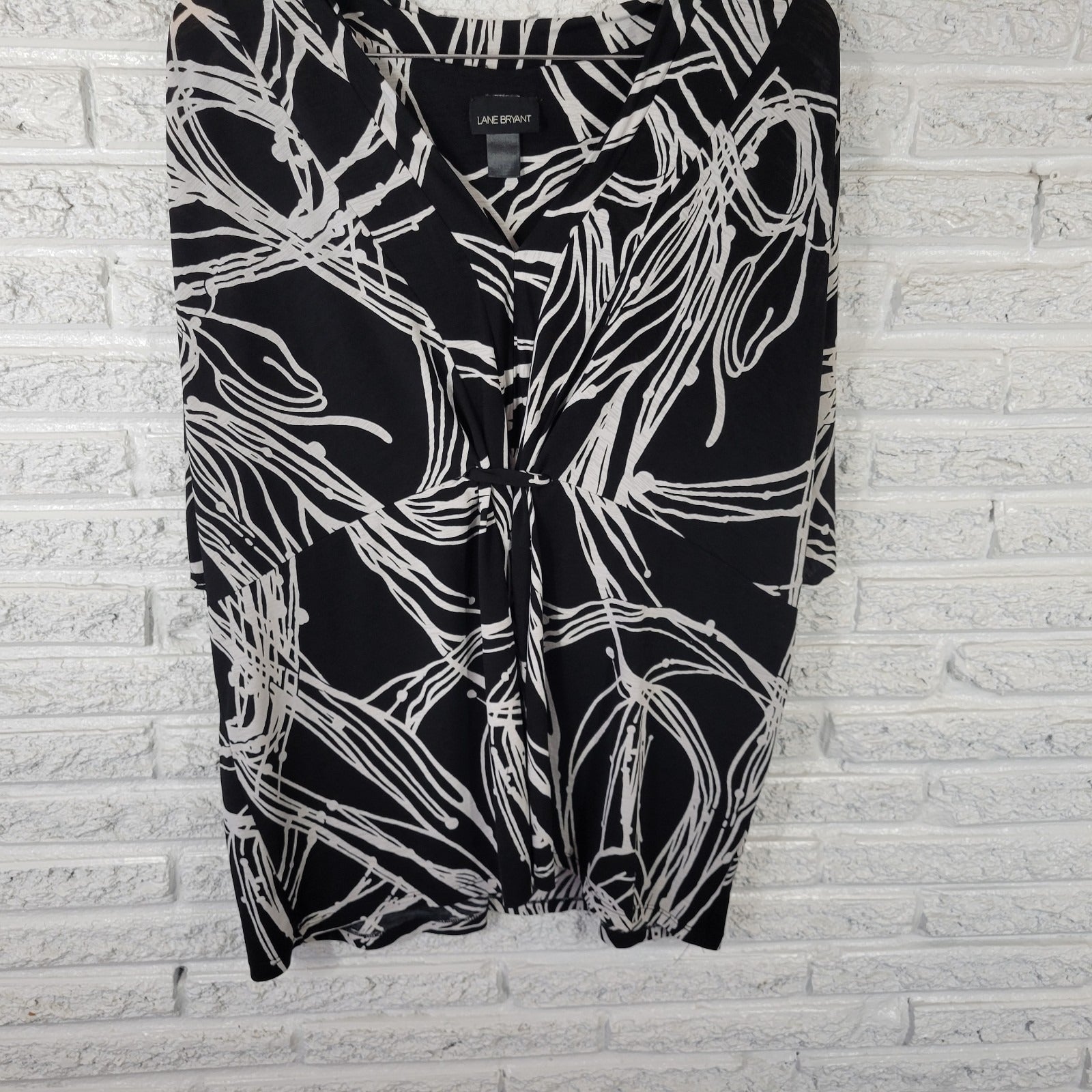 The Lane Bryant Women's Top in size 22/24 is a black geometric polyester blend shirt perfect for office, casual, or business occasions. This pullover blouse features a V-neckline, short sleeves, and a regular fit. It is machine washable and designed for all seasons, making it a versatile and comfortable option for any wardrobe. The Lane Bryant brand ensures quality and style in this stretchy, basic top that is easy to wear and care for.