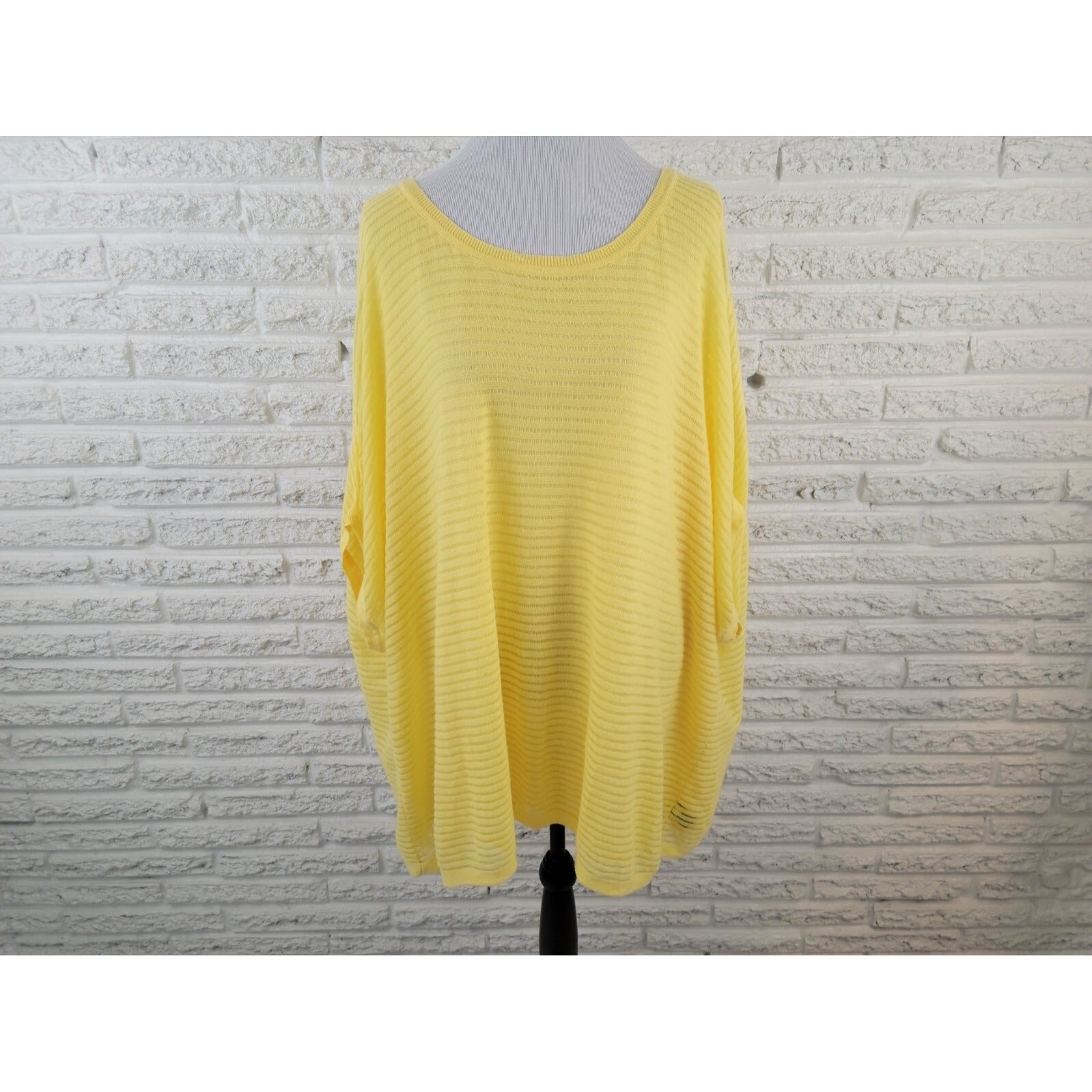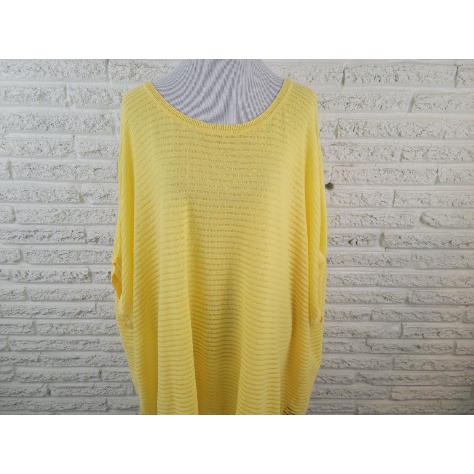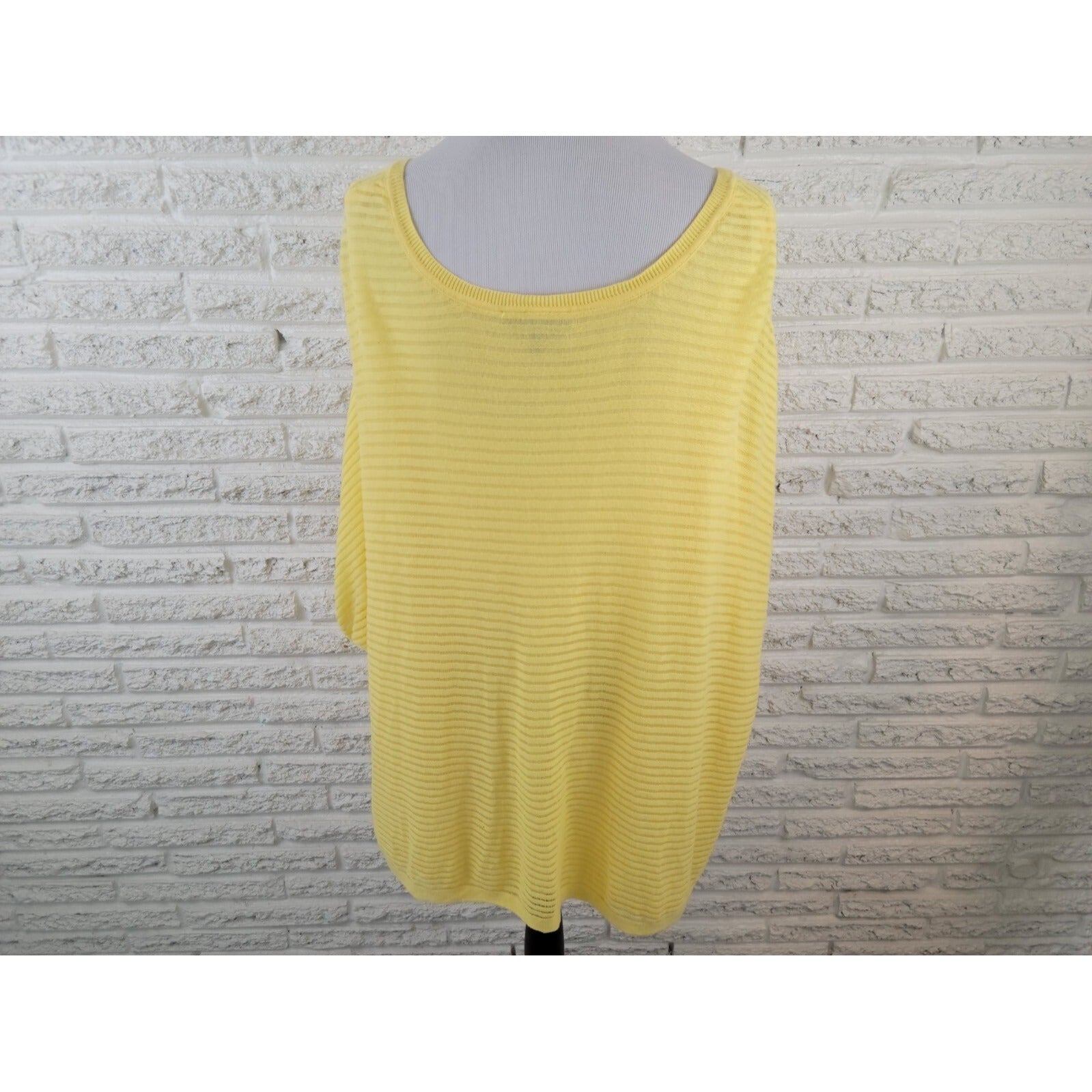 This Lane Bryant blouse is a perfect addition to your wardrobe. The top features a boat neckline and short cap sleeves, with a pullover closure for easy wear. The yellow color adds a pop of brightness to any outfit, and the sheer mesh fabric provides a comfortable and airy feel.   The blouse is made of cotton and is machine washable for easy care. It is lined and has a regular fit, making it suitable for casual occasions all year round. This plus-sized blouse is perfect for women who want to look stylish and feel comfortable.