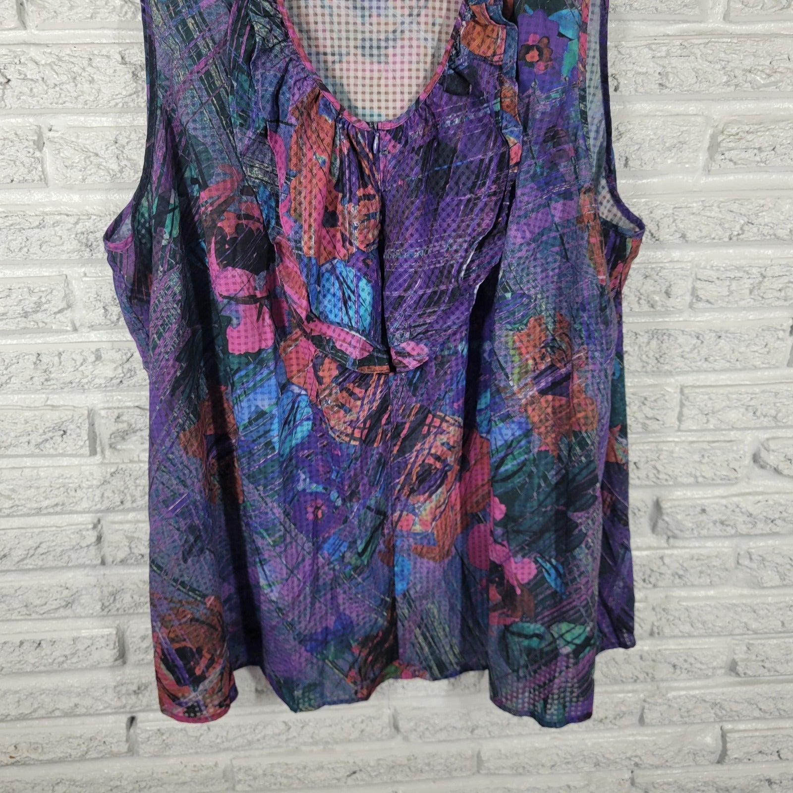 Lane Bryant Womens Top 28 Plus Tank Purple Floral 1/4 Zip Semi Sheer Ruffle Poly