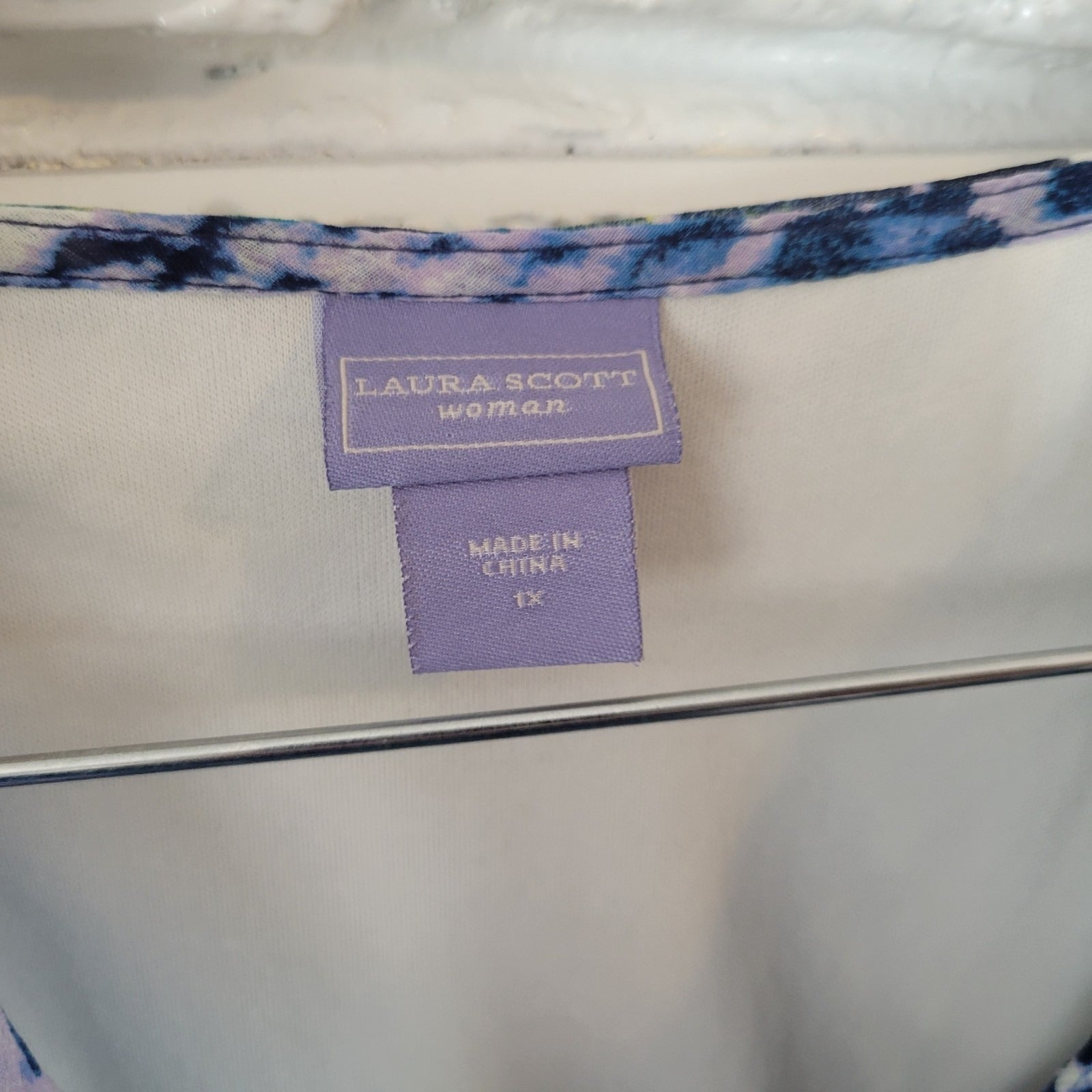 The Laura Scott Women's Top in size 1X Plus is a stylish and versatile addition to any wardrobe. This sleeveless blouse features a beautiful blue/lavender animal print, perfect for adding a pop of color to your outfit. The drape neckline and pullover closure make it easy to throw on for casual, business, or travel occasions. Made of lightweight polyester material, this blouse is machine washable for easy care. The regular fit and lined design make it comfortable for all seasons, making it a great choice for summer, fall, and spring.