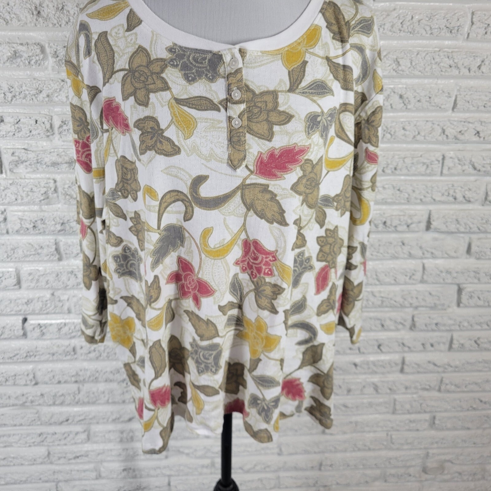 Laura Scott Womens Top 2X Plus Knit 3/4 Sleeve Cotton Blend Green Red Floral