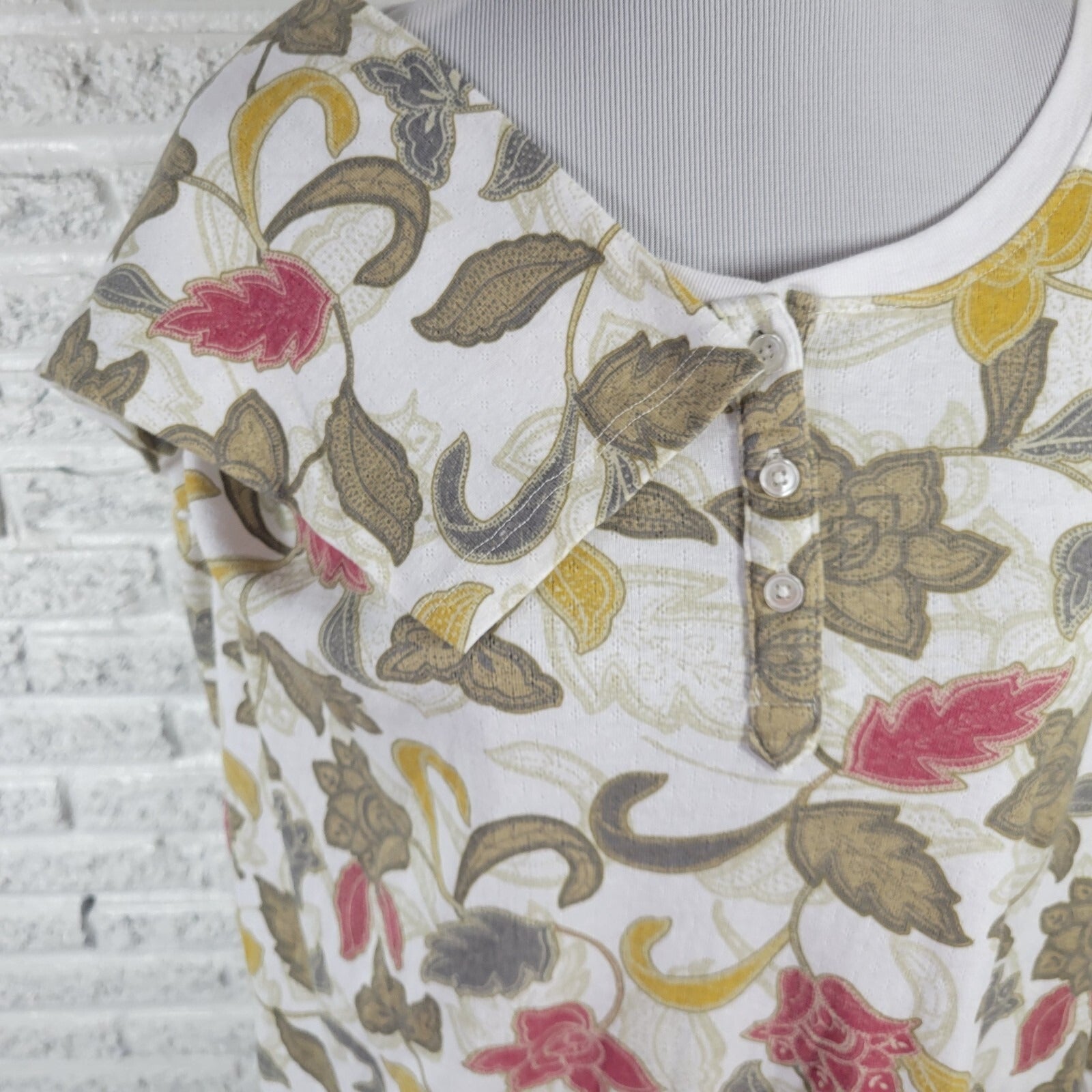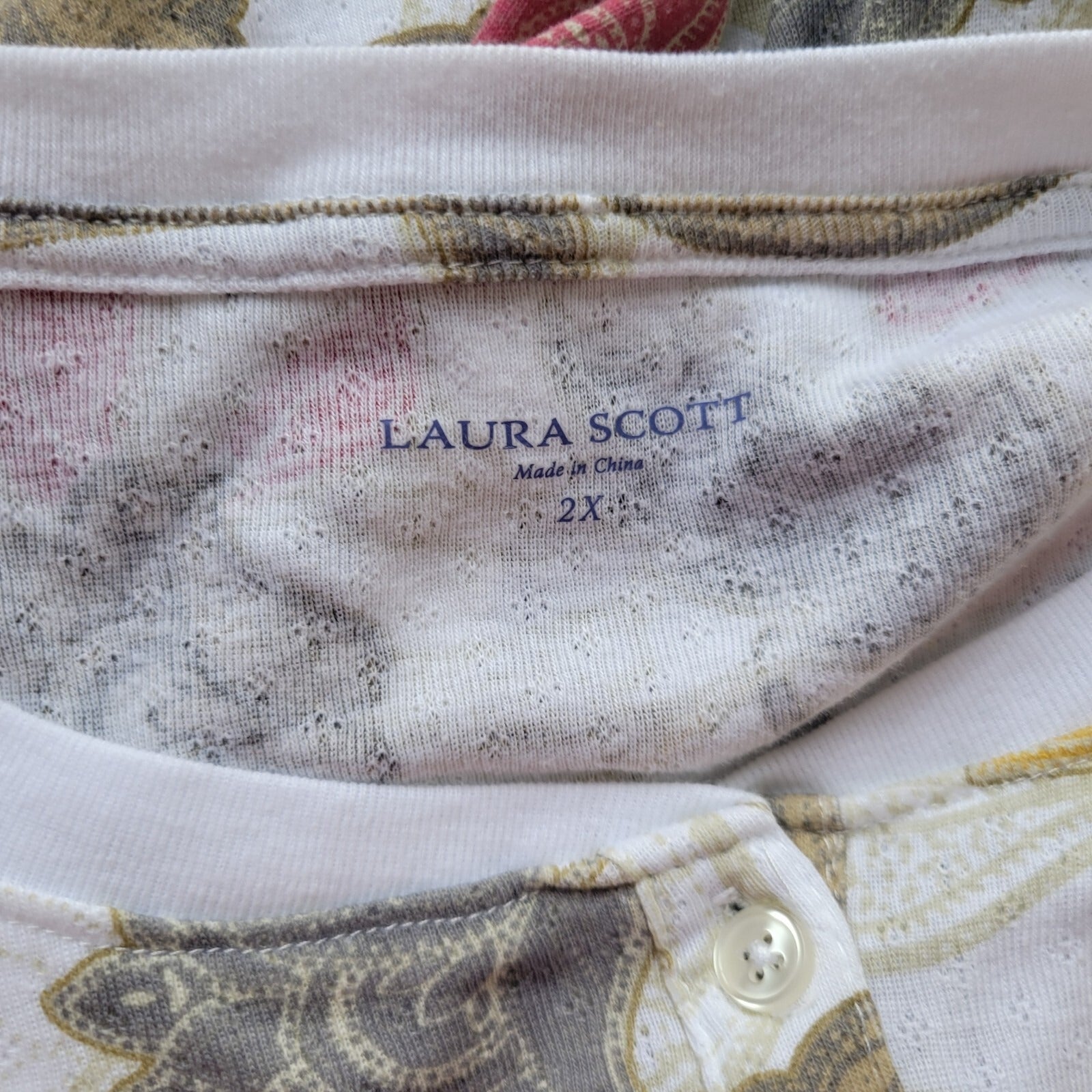 Craft a casual yet chic look with this Laura Scott Women's Knit Top in a plus size 2X. Featuring a charming green and red floral pattern, this button-up piece offers a touch of nature-inspired beauty to your everyday wardrobe. The 3/4 sleeves and round neckline create a timeless silhouette that's perfect for any casual occasion or your next travel adventure. Designed with a comfortable cotton blend fabric, this top ensures breathability and ease of care with its machine-washable convenience. Adaptable for all seasons, from the freshness of spring to the coziness of winter, it's a versatile addition to your collection. Whether you're out for a laid-back brunch or a relaxed evening stroll, this Laura Scott top pairs effortlessly with your favorite jeans or shorts.