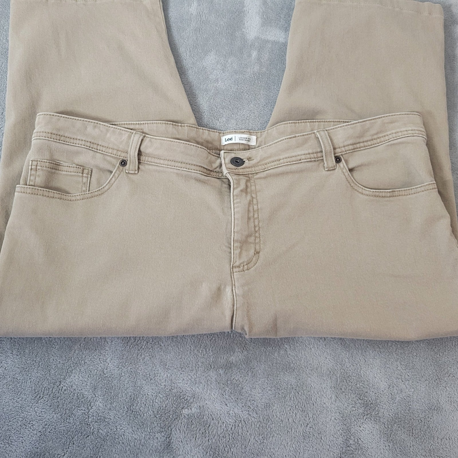 The Lee Women's Jeans in size 18W Plus are a stylish and comfortable option for any wardrobe. These capri-length jeans feature a lower waist and zip fly closure, with a classic 5-pocket design for added convenience. Made from a cotton blend denim fabric with a solid beige color, these jeans are machine washable and perfect for all seasons. The brand Lee is known for its quality and regular fit, making these jeans a reliable and versatile choice for any woman looking for a chic and comfortable denim option.