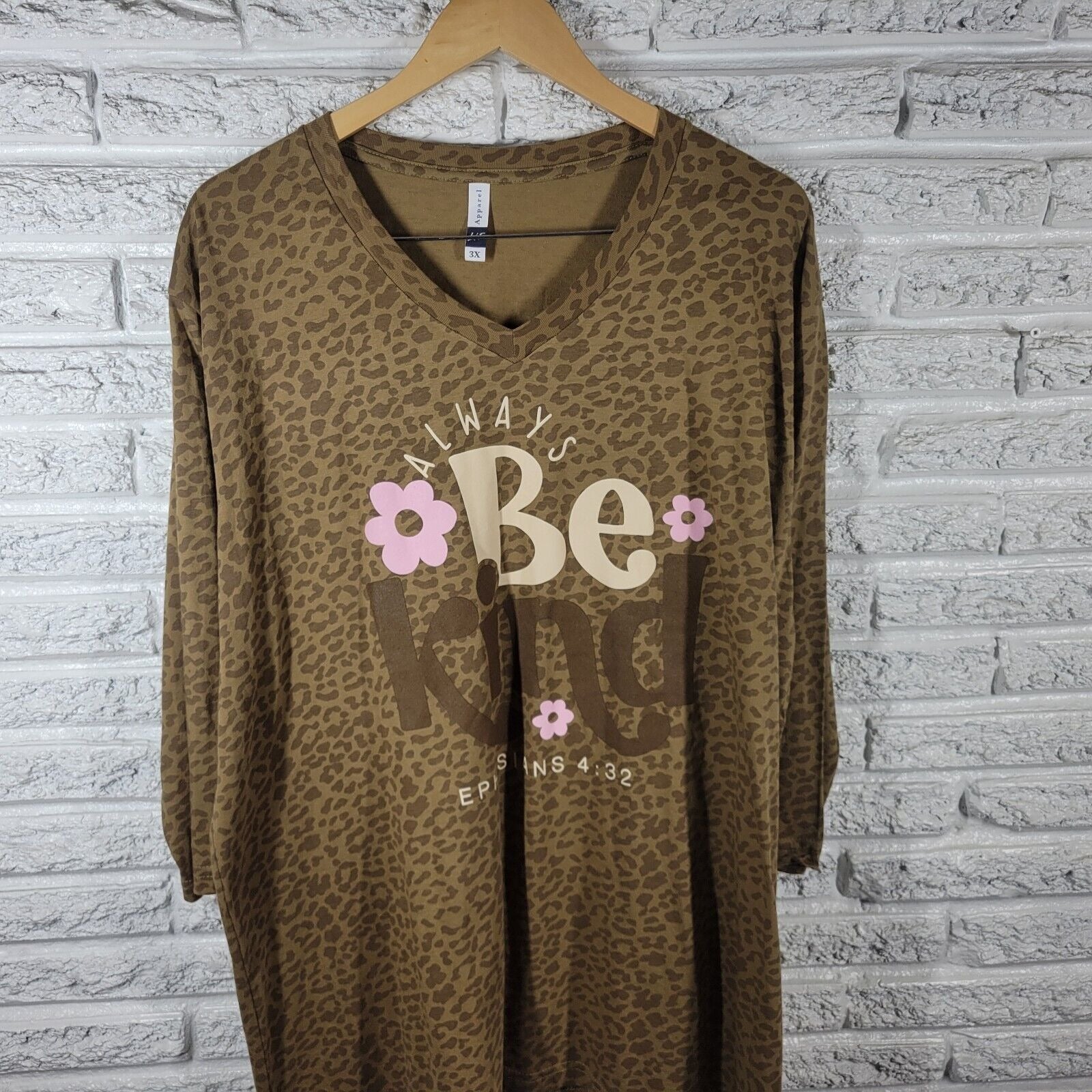 Upgrade your wardrobe with the LIF Apparel Women's Top, a versatile piece that's as comfortable as it is stylish. The animal print tee, in a rich tan hue, features a flattering V-neck and 3/4 casual sleeves, perfect for transitioning through all seasons. Its cotton blend fabric ensures breathability and ease of care, being machine washable. Designed for plus-size fashion, this size 3X t-shirt offers a regular fit that promotes a relaxed silhouette. The pullover closure allows for effortless dressing, making it an ideal choice for everyday wear or travel. Adorned with a gentle reminder to "Always Be Kind" as per Ephesians 4:32, this top is a chic and meaningful addition to your casual collection.