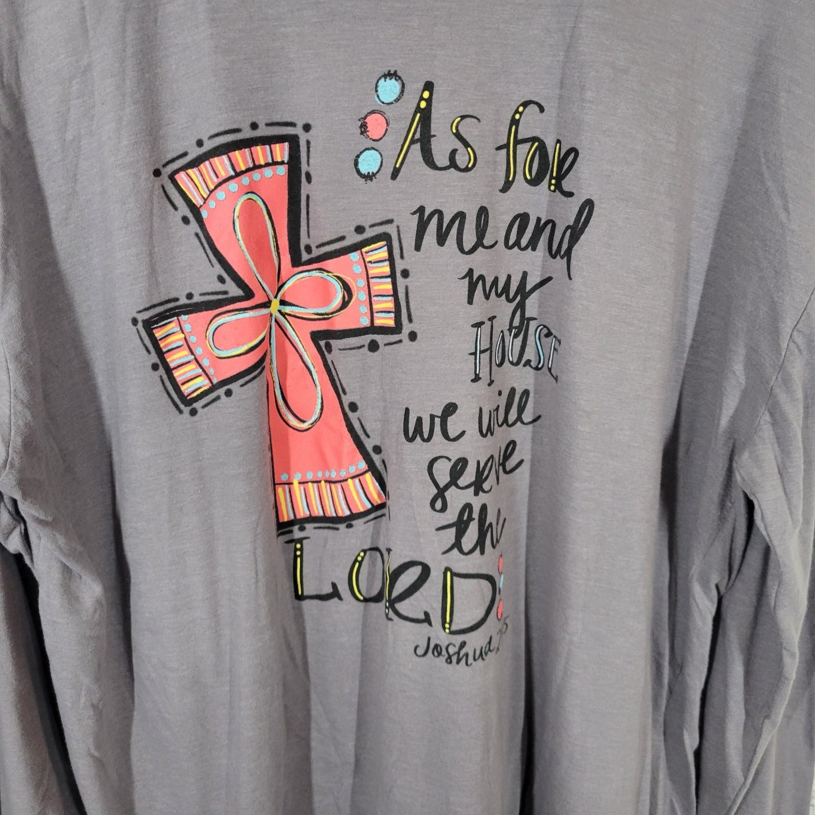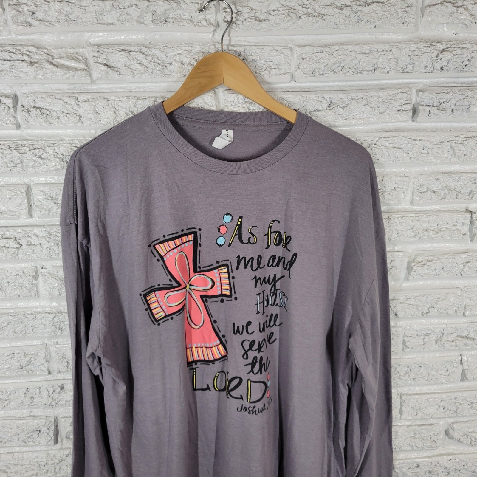 The LIF Apparel Women's Top XL Tee in gray is a comfortable and versatile long-sleeve t-shirt perfect for casual and travel occasions. Made from a cotton blend jersey fabric, this pullover tee features a crew neck and casual sleeve type. With a regular fit and stretchy material, this T-shirt is suitable for all seasons and can be easily cared for through machine washing. The design of the top incorporates the Christian theme of serving the Lord, as seen in Joshua 24:15. Perfect for everyday wear or for showing your faith, this top from LIF Apparel is a must-have addition to any woman's wardrobe.