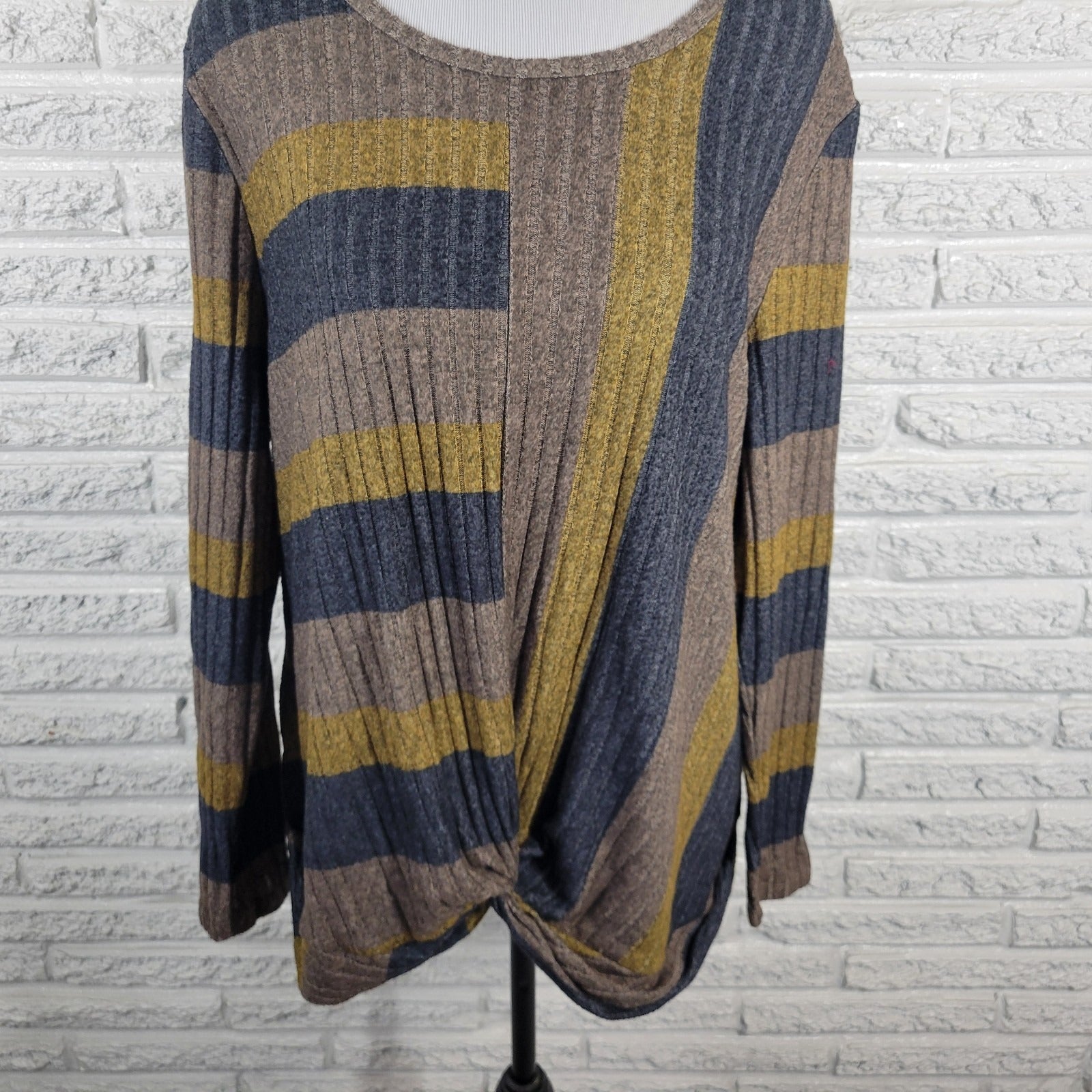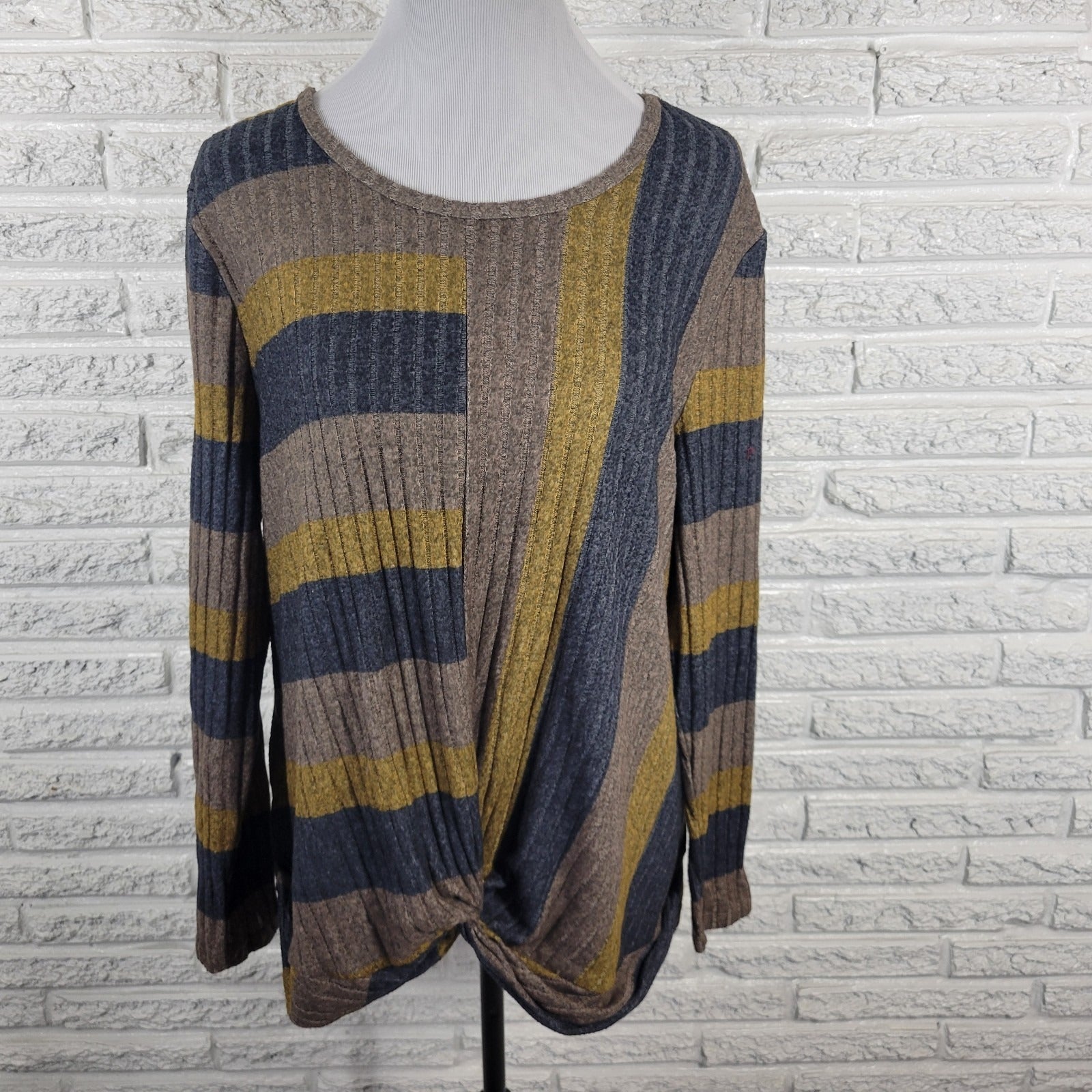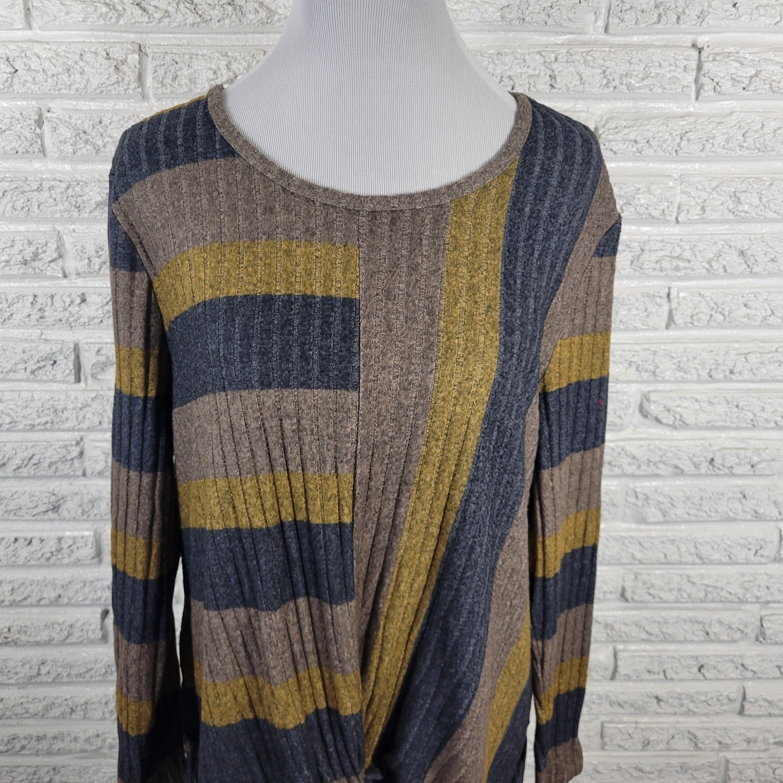 Live Let Live Womens Sweater XL Long Sleeve Blue Gold Stripe Knotted Hem Comfy