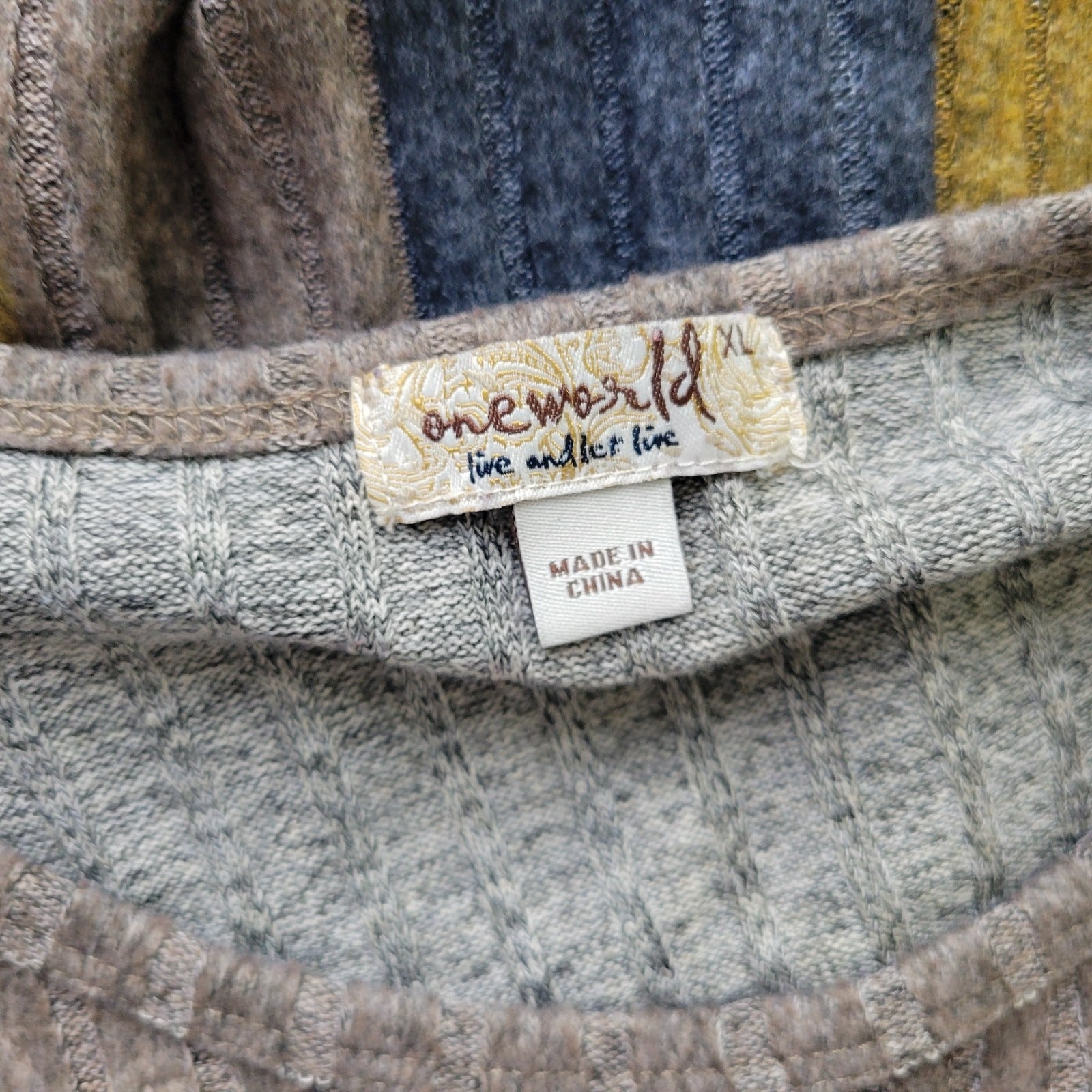 The Live Let Live Women's Sweater in XL size is a comfortable and stylish pullover featuring a blue and gold striped pattern, long sleeves, and a knotted hem. Made from knit fabric, this sweater is machine washable and perfect for casual or travel occasions during all seasons. With a regular fit and a crew neck, this sweater from One World brand is a versatile addition to any woman's wardrobe.