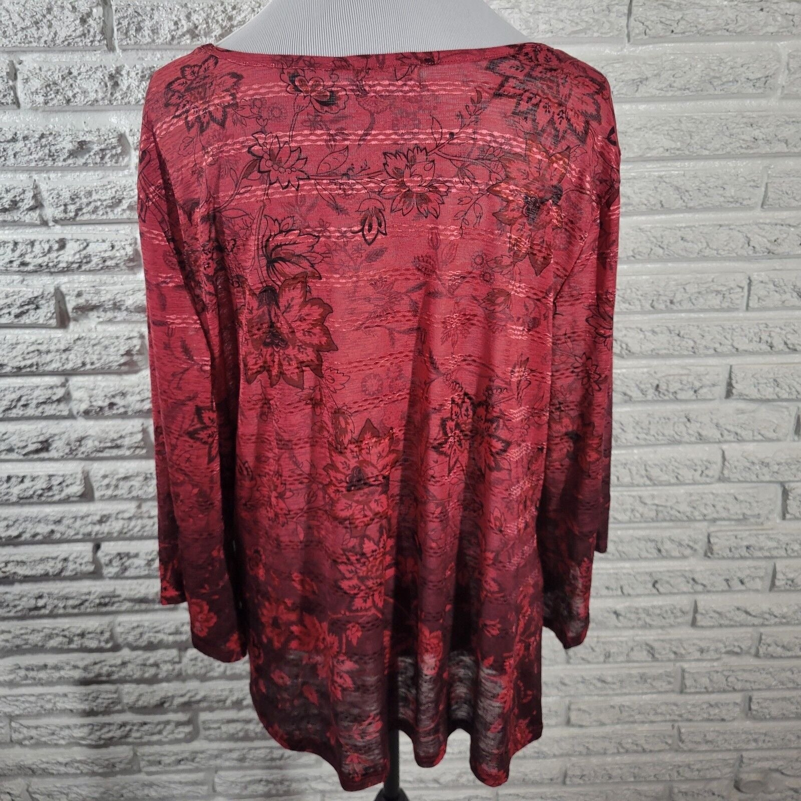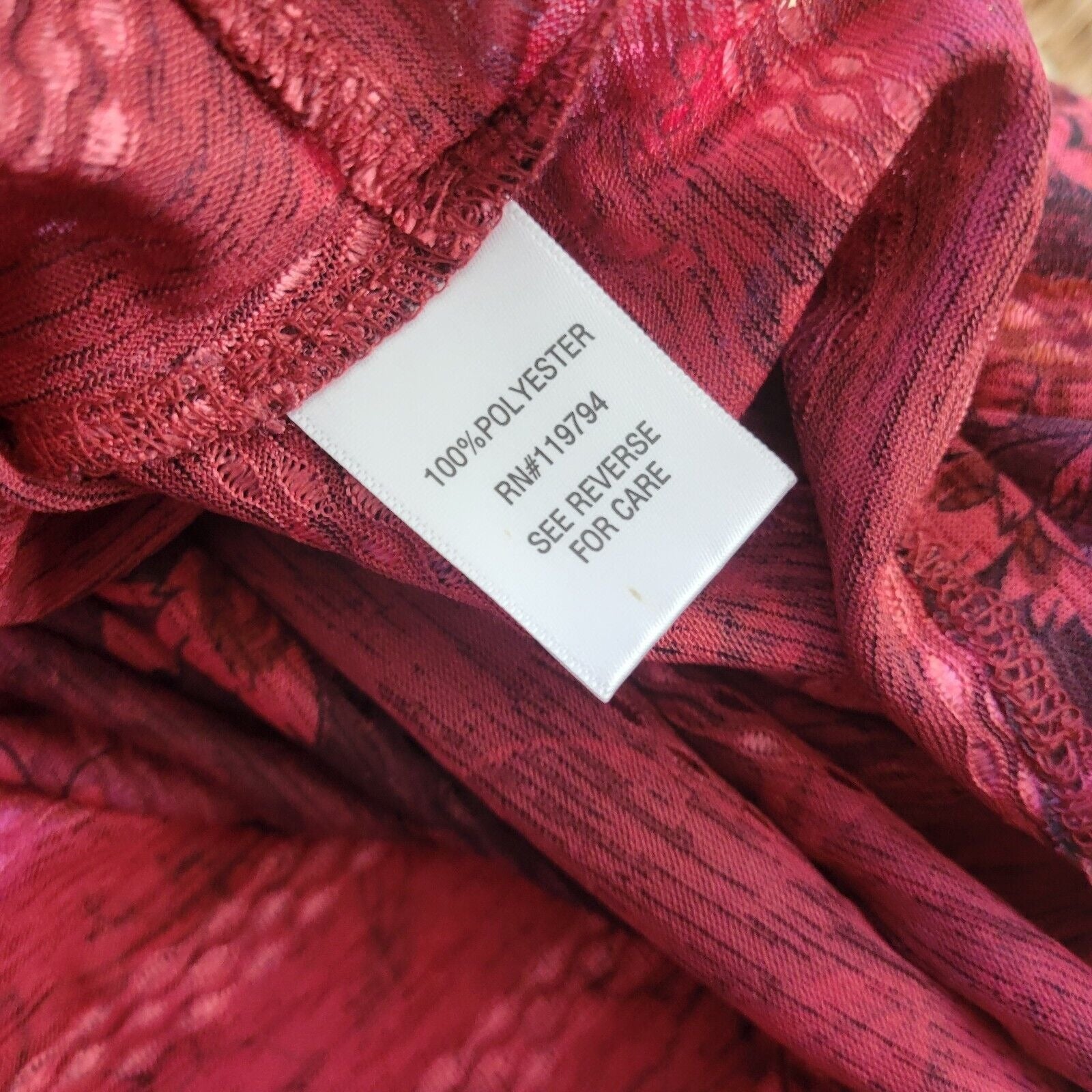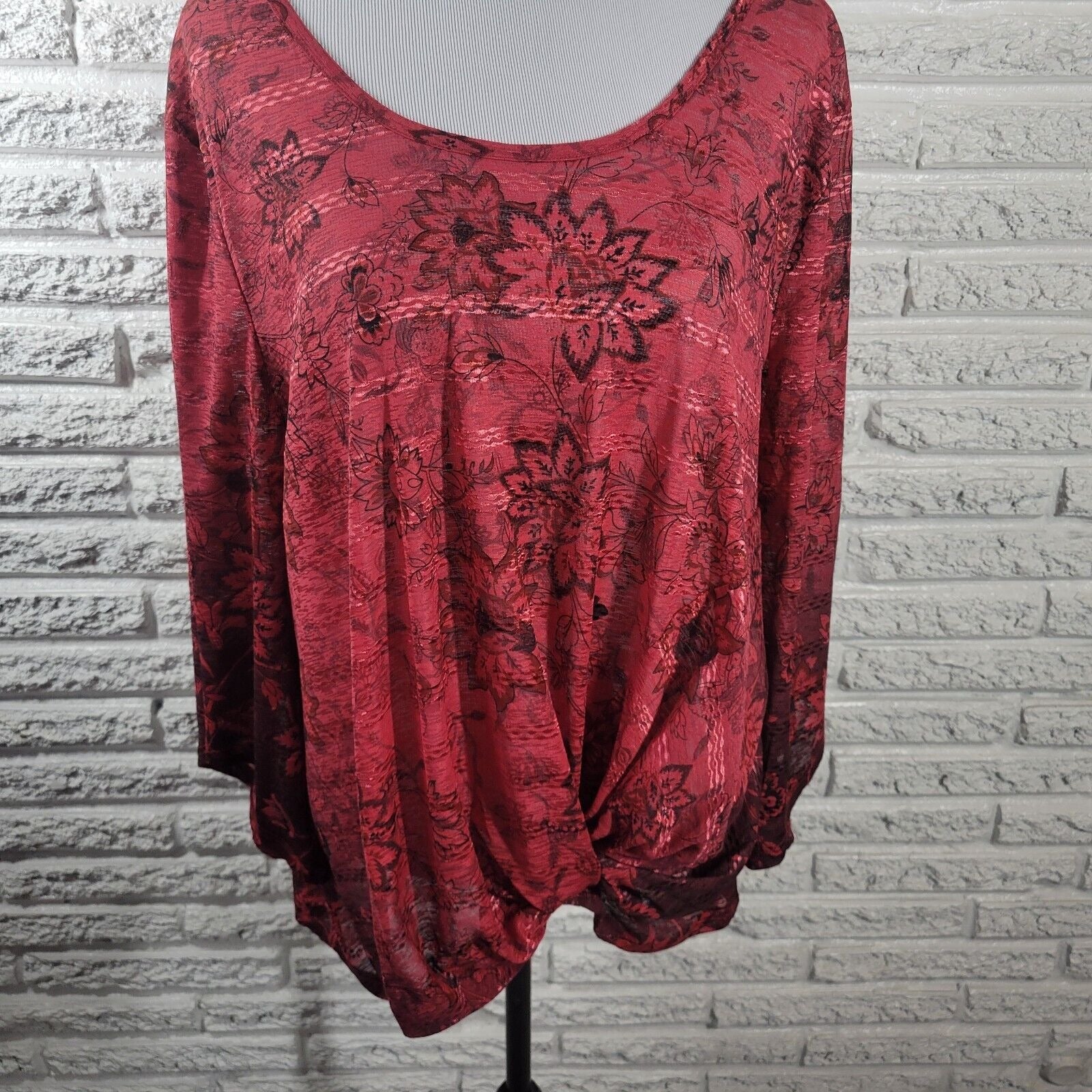 Live Let Live Womens Top 2X Trumpet Sleeve Red Floral Lightweight Ruched Sheer