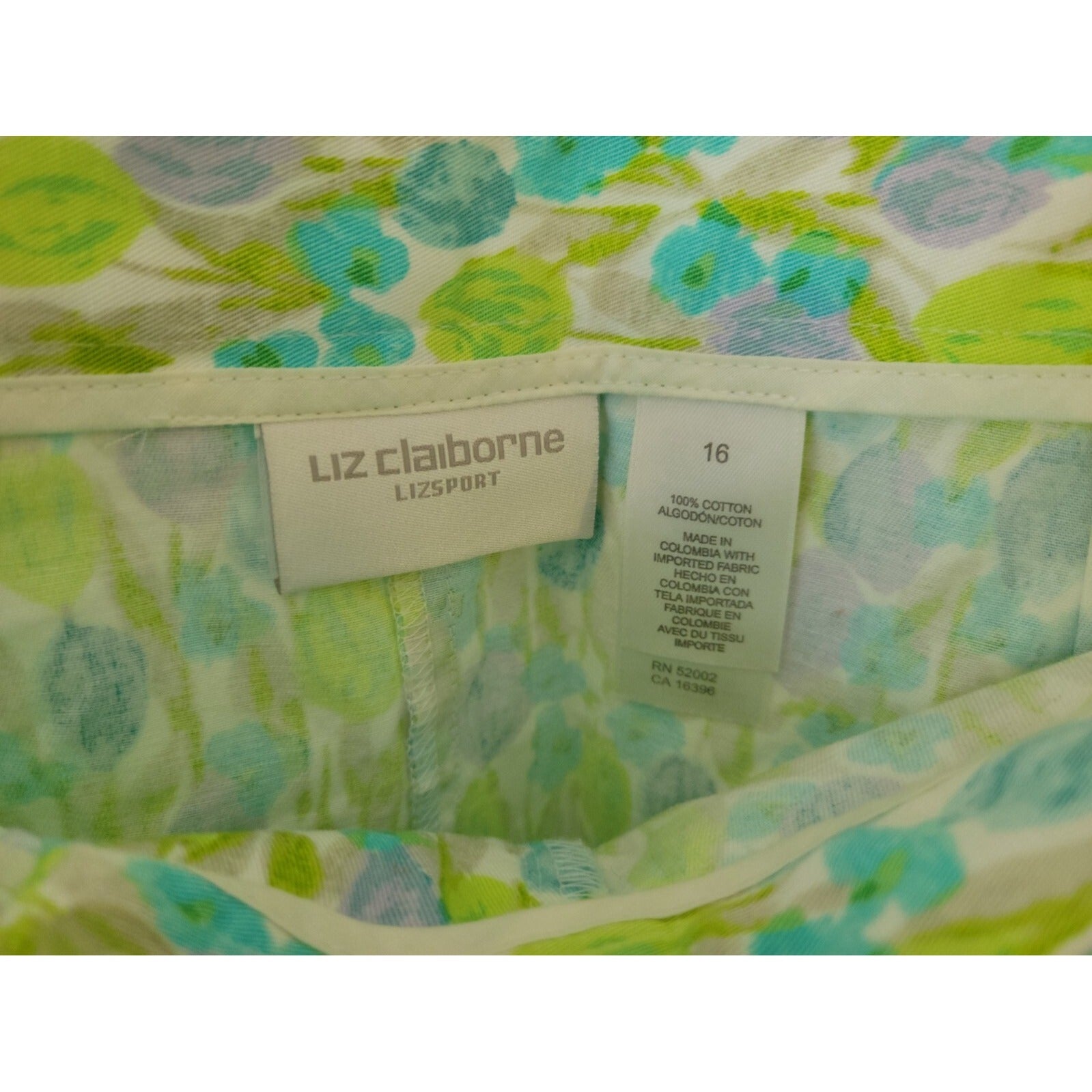 The Liz Claiborne Lizsport Women's Skirt is a blue floral mini pencil straight skirt made of cotton. It has a zip closure and is machine washable. The skirt has pockets and is suitable for all seasons. It is a regular size 16 and is perfect for casual occasions. The skirt is made by Liz Claiborne, a well-known brand.