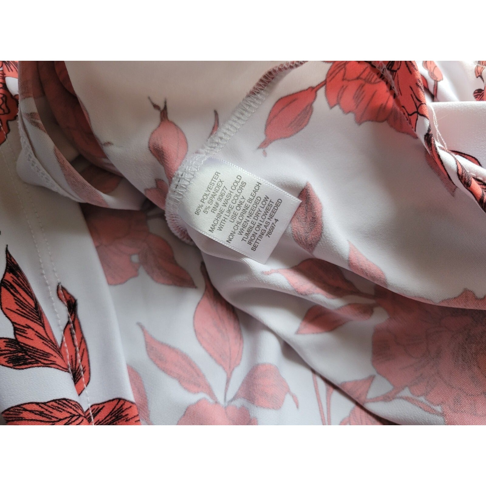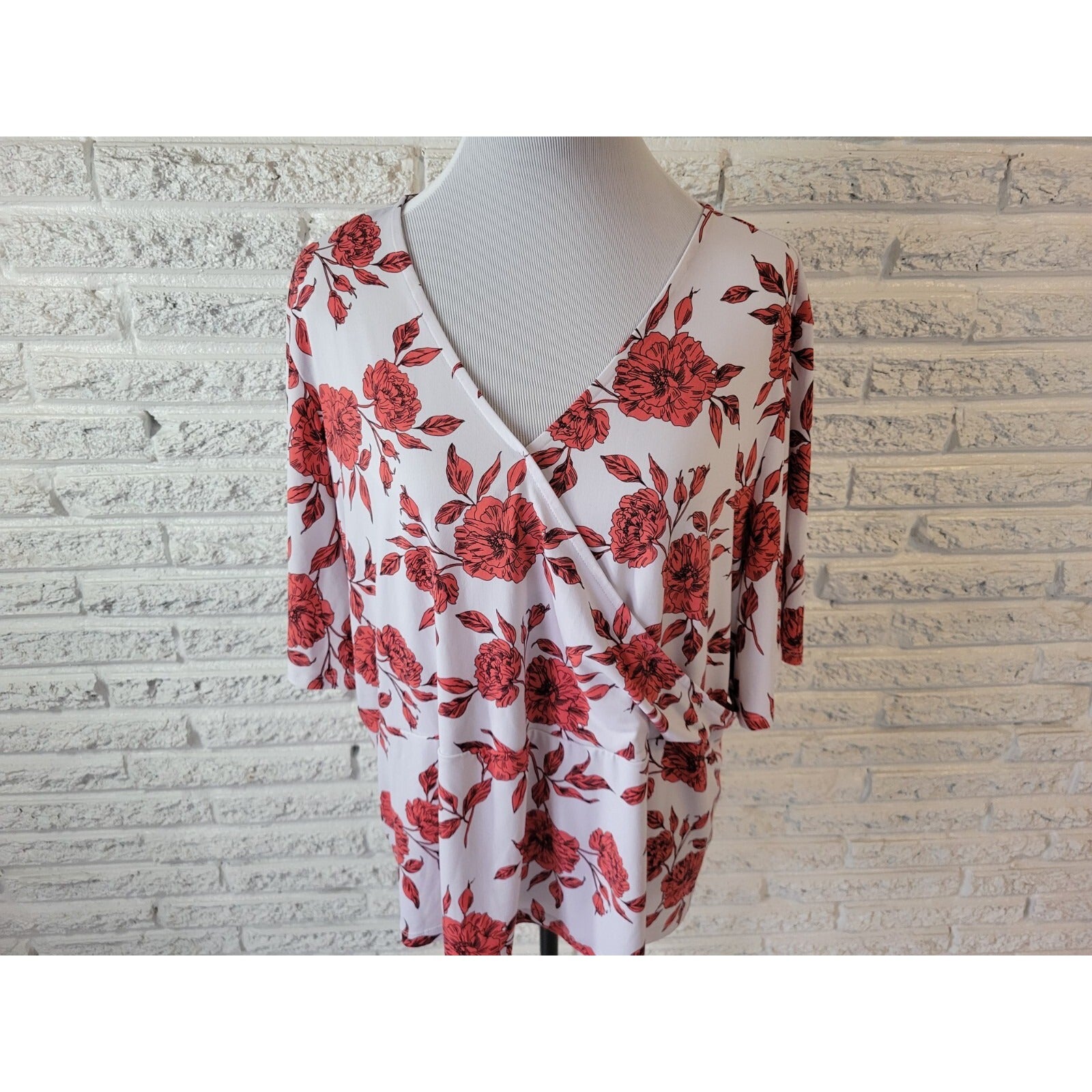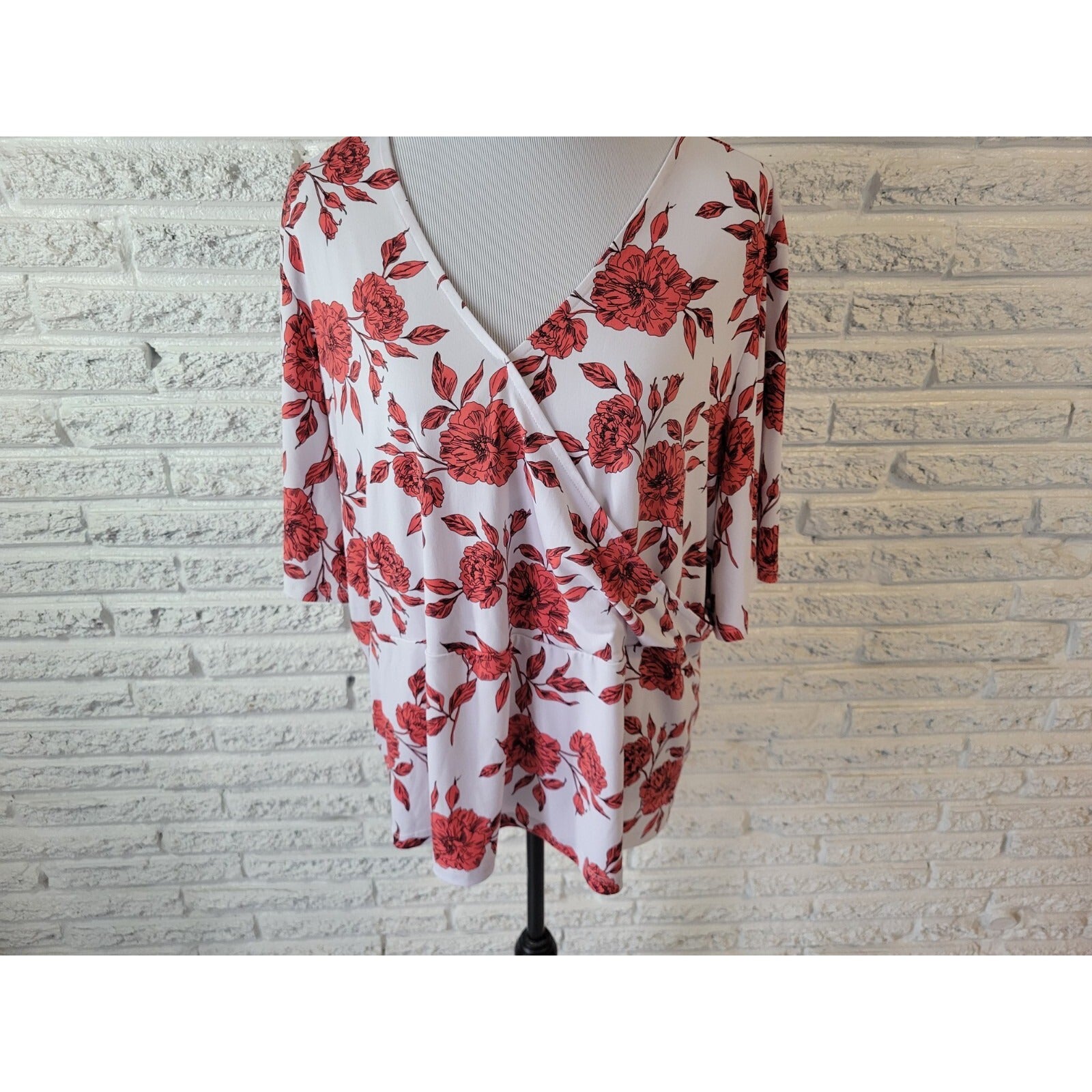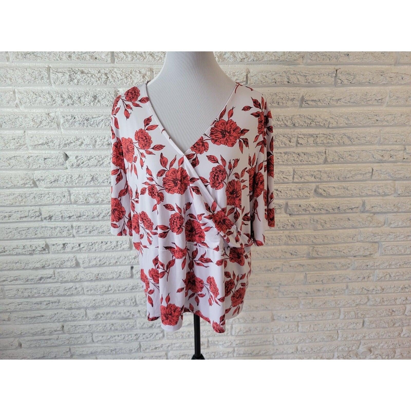 Liz Claiborne Women Top 2X Plus Short Sleeve Draped Red Floral Poly Blend Office