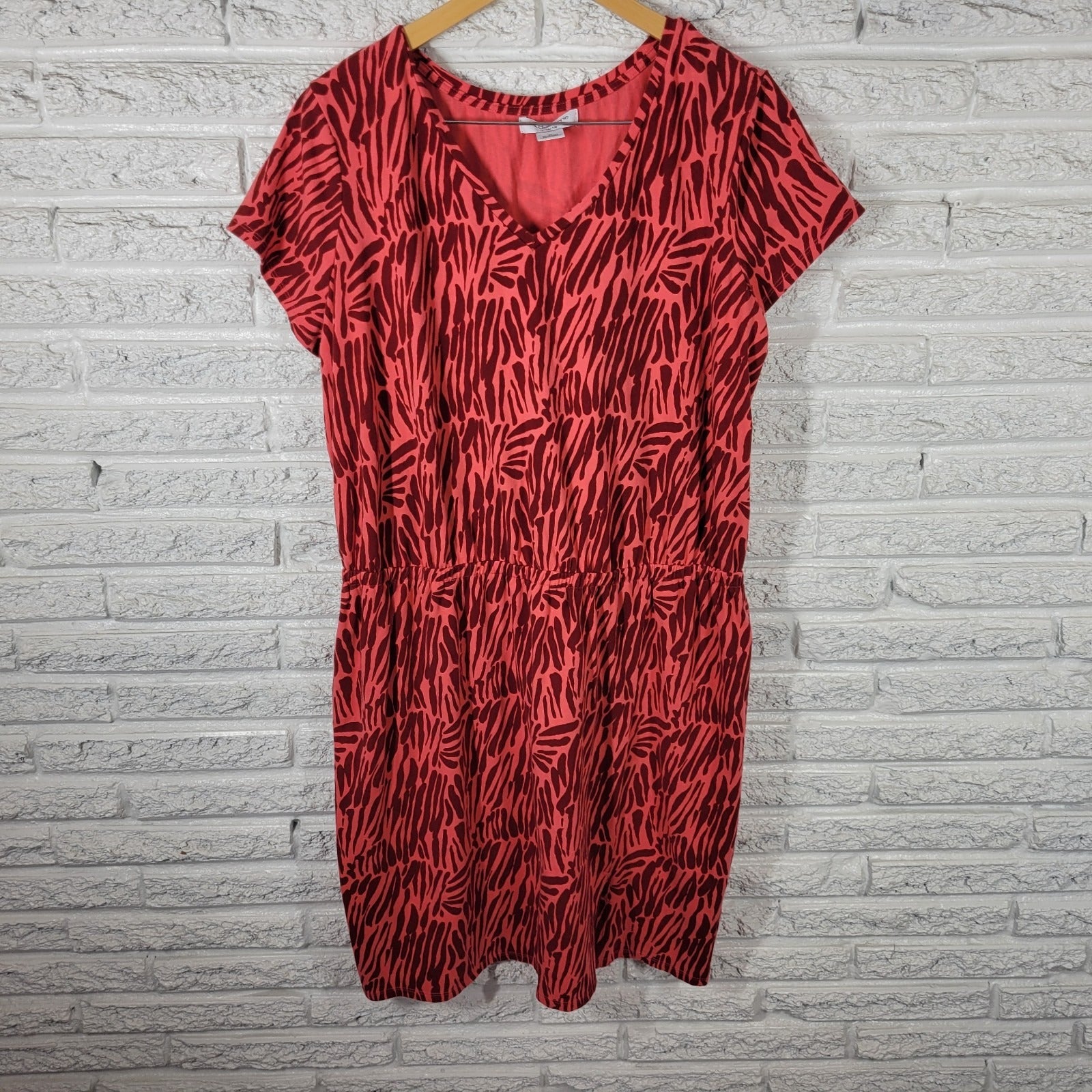 The Liz Claiborne Women's Dress in size 1X Plus features a flattering fit and flare style with short sleeves, making it perfect for casual or travel occasions. The dress is in a stylish pink animal print pattern, crafted from a comfortable cotton blend material. It has a V-neckline, a pullover closure, and side slit and stretch features for added convenience. Perfect for all seasons, this dress is easy to care for with machine washable instructions, ensuring both style and practicality. Made in Vietnam, this dress is a chic and versatile addition to any woman's wardrobe.