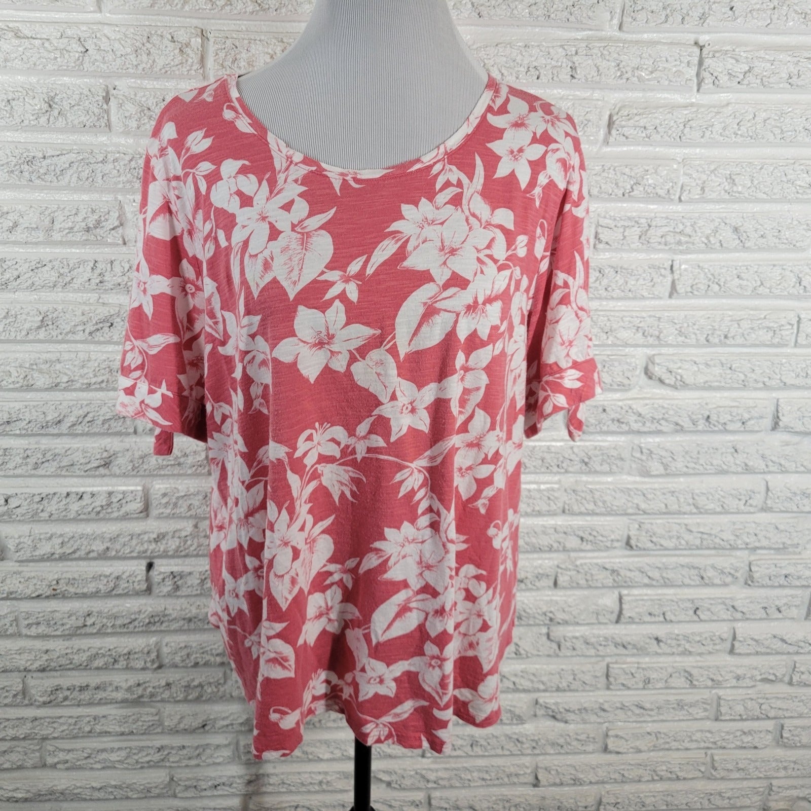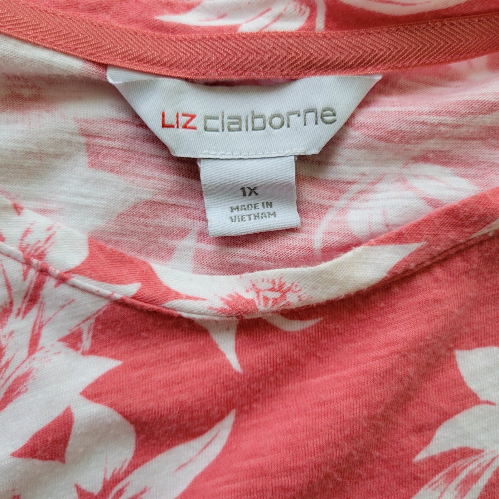 This Liz Claiborne Women's Top in size 1X Plus is a stylish and comfortable tee with short tied sleeves, perfect for a casual or travel occasion. The pink/white floral pattern adds a touch of femininity, while the lightweight cotton blend jersey fabric ensures a stretchy and breathable fit. The pullover closure and round neckline make it easy to wear, and the casual sleeve style and basic design make it a versatile piece for all seasons. This top is machine washable and suitable for various seasons like winter, summer, fall, and spring.